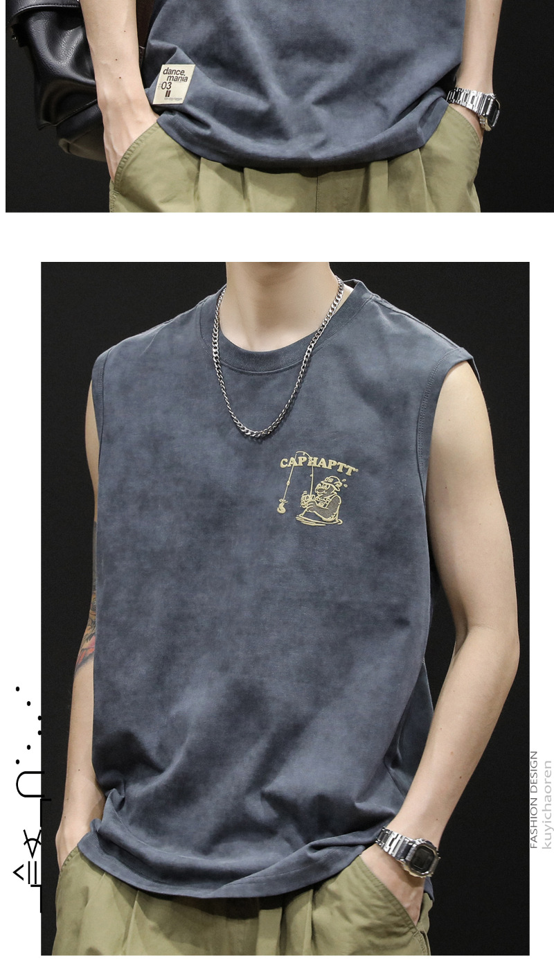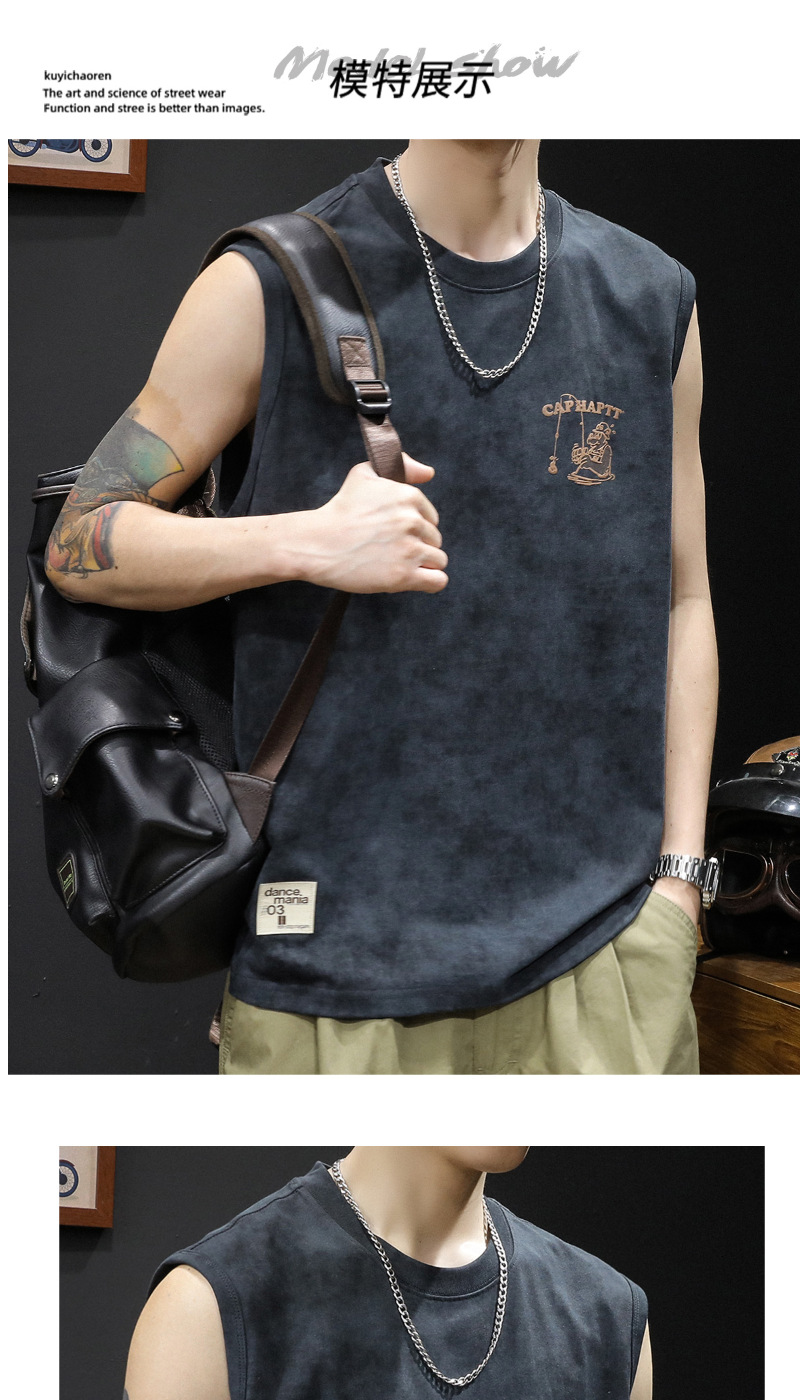 여름 빈티지 스웨이드 웨이스트 코트 미국 편지 자수 조끼 민소매 티셔츠 남성용 원피스 헤어스토어 가기