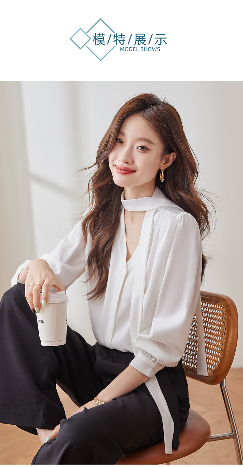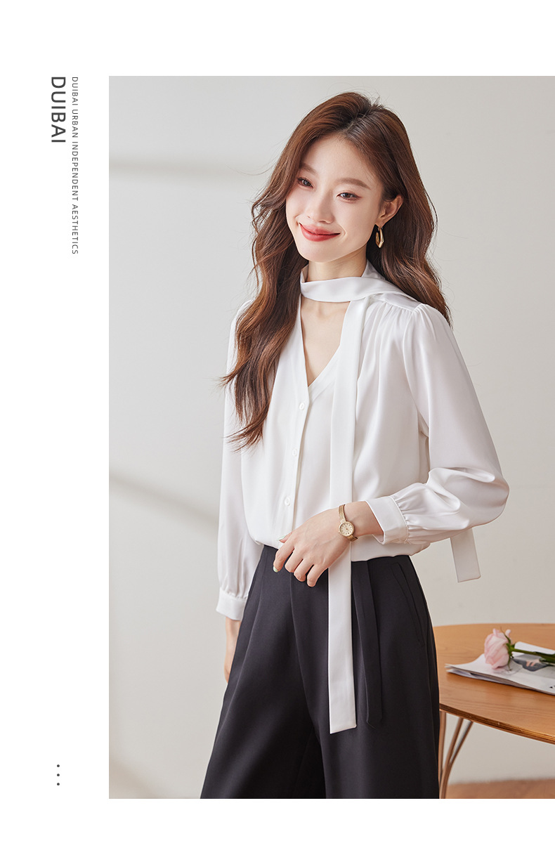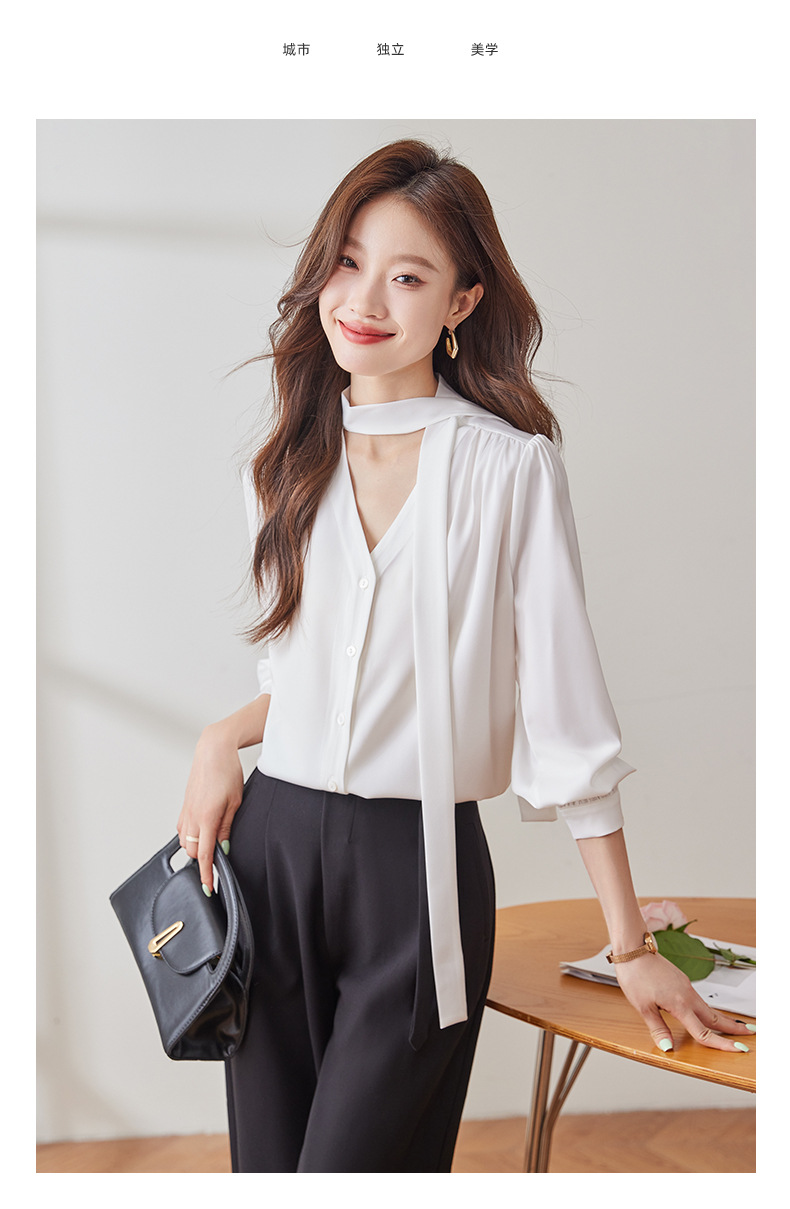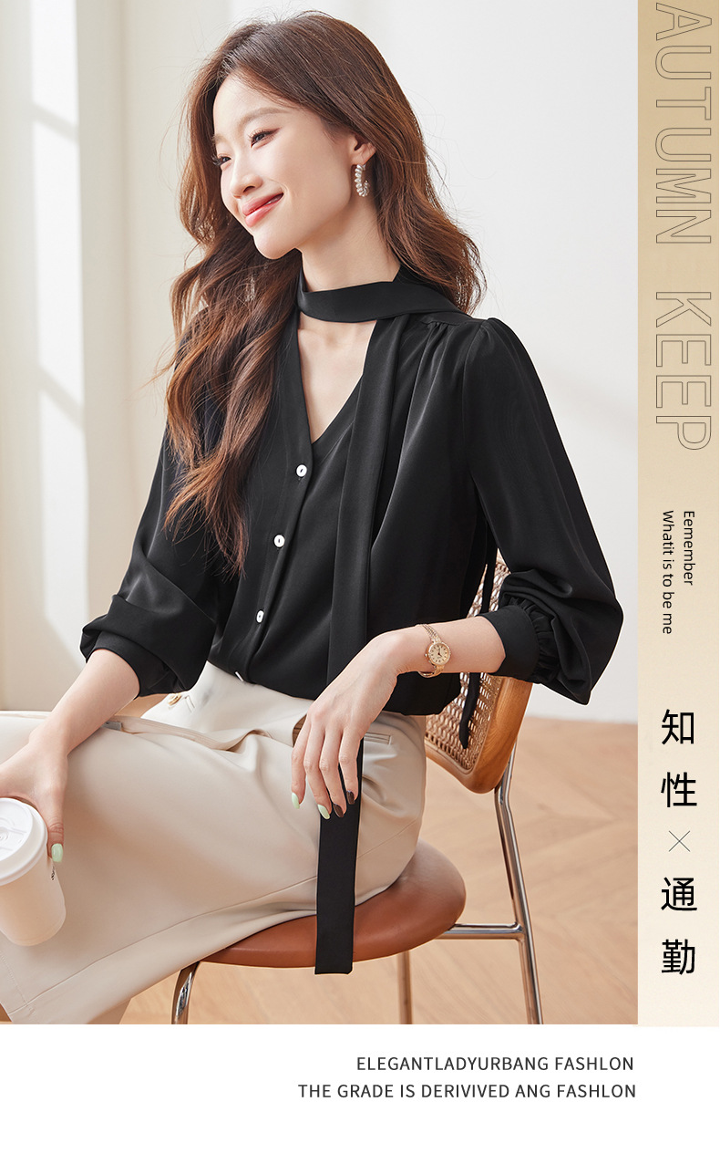 리본 셔츠 여성용 활 2024 새로운 봄과 가을 우아한 스트랩 셔츠 초가을 쉬폰 V 넥 탑 하이 엔드스토어 가기
