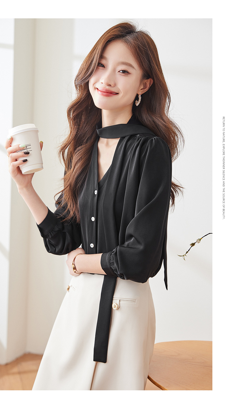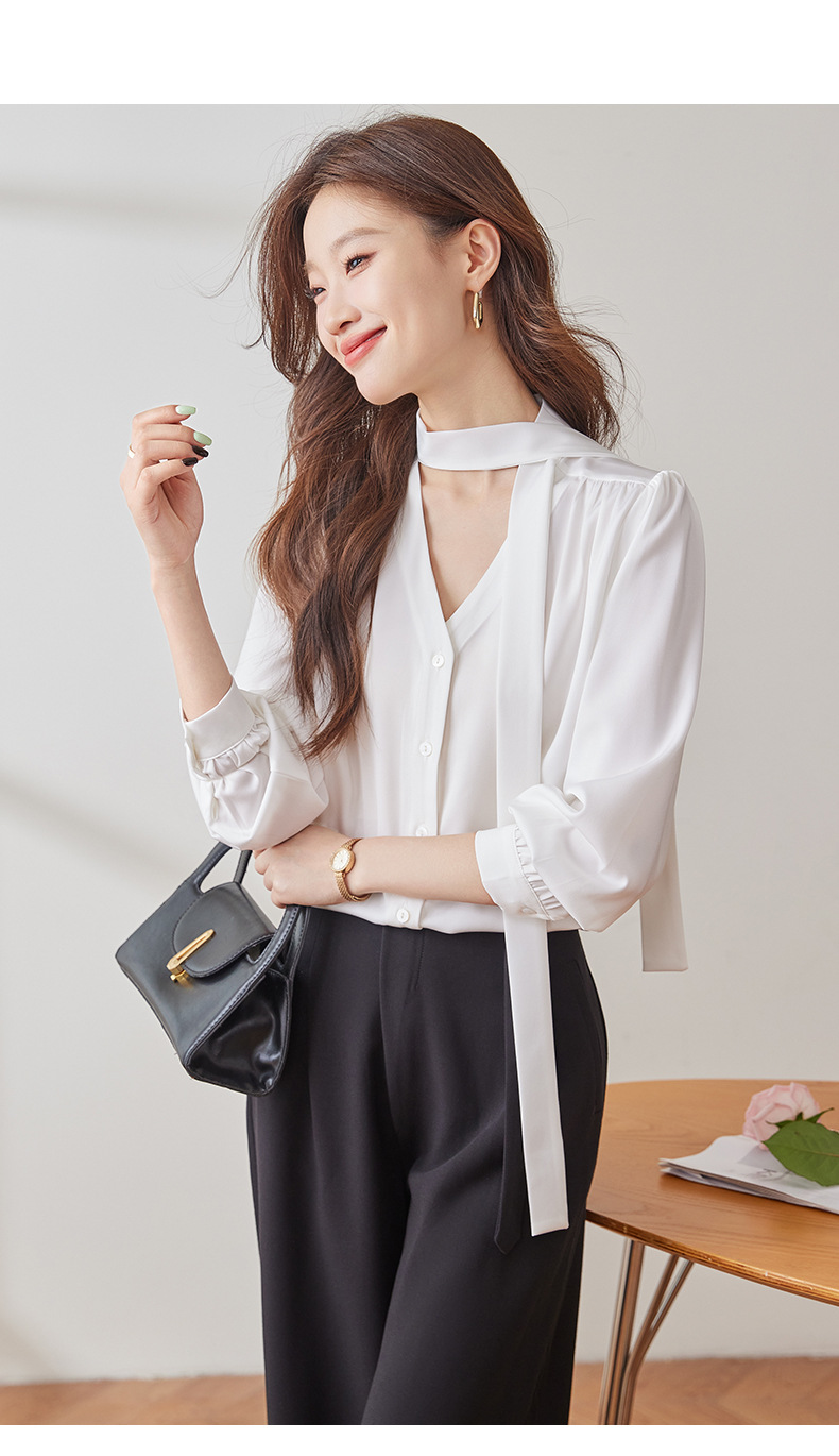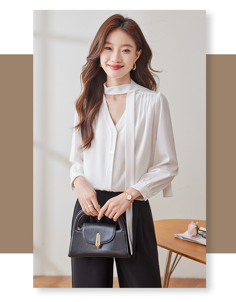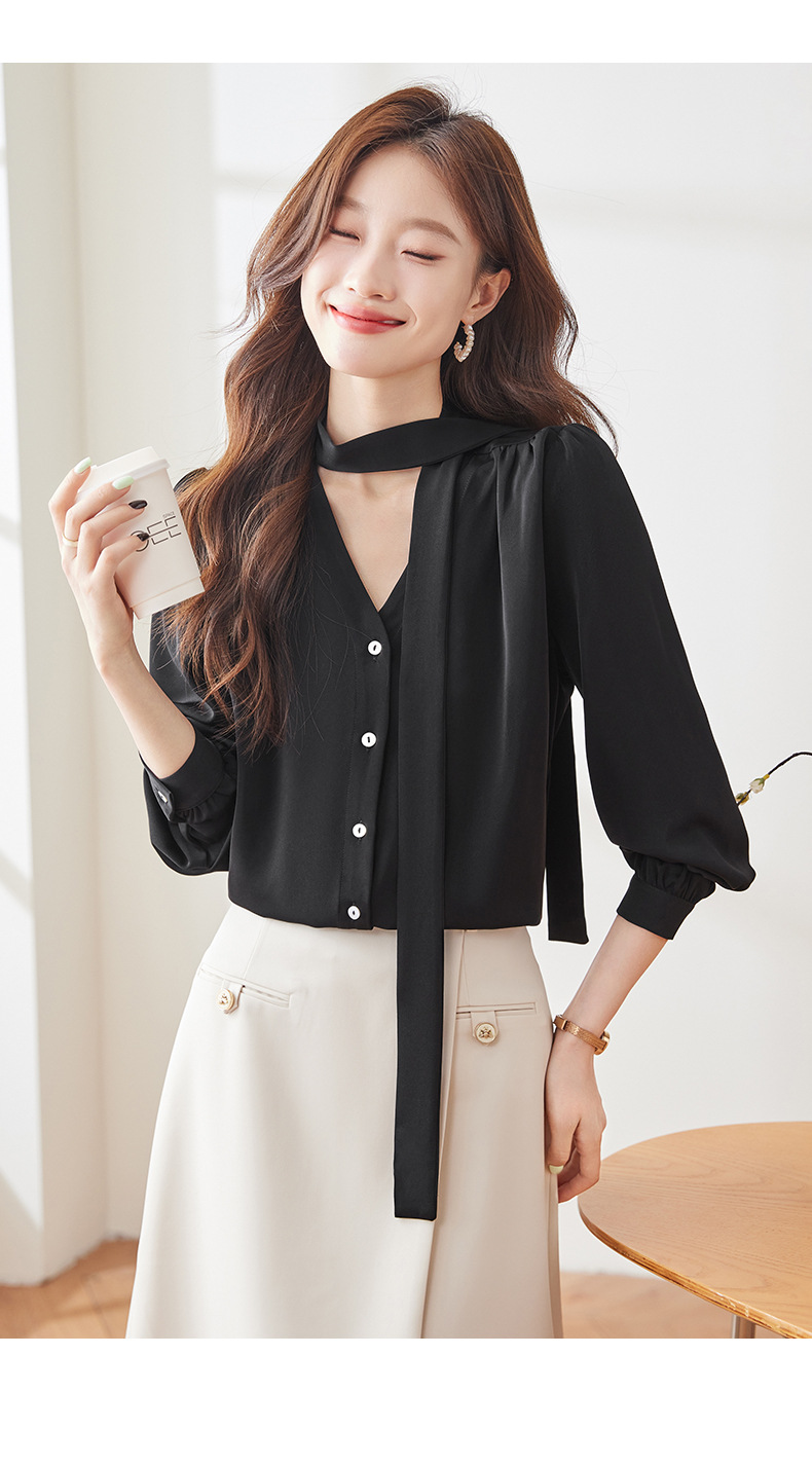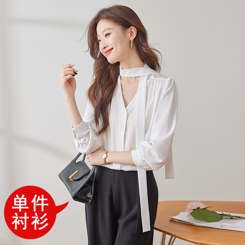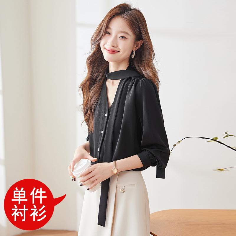 리본 셔츠 여성용 활 2024 새로운 봄과 가을 우아한 스트랩 셔츠 초가을 쉬폰 V 넥 탑 하이 엔드