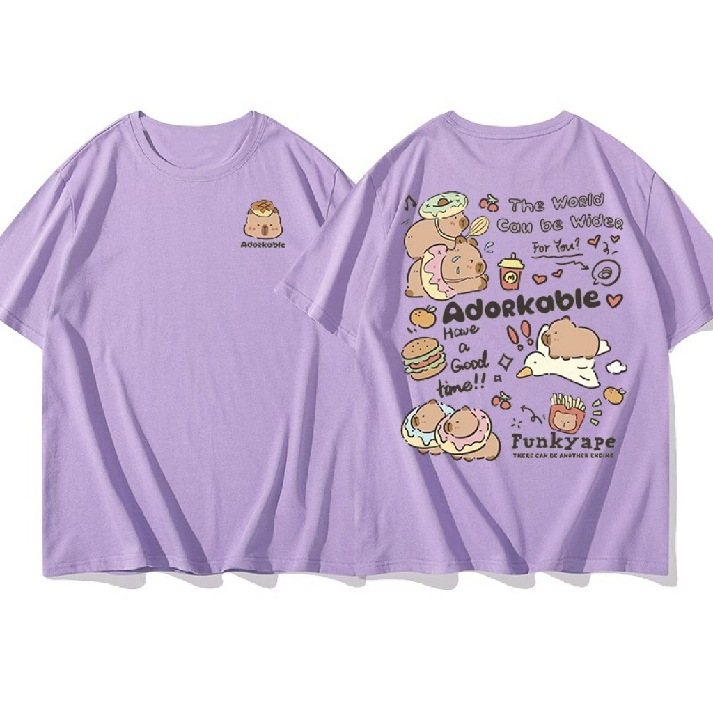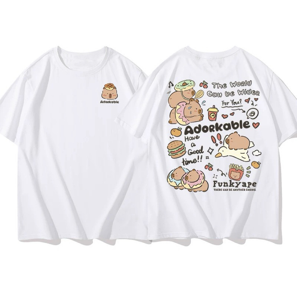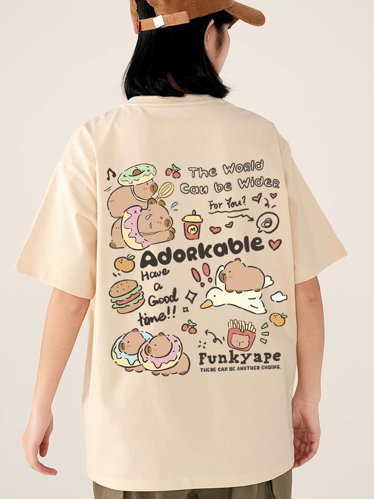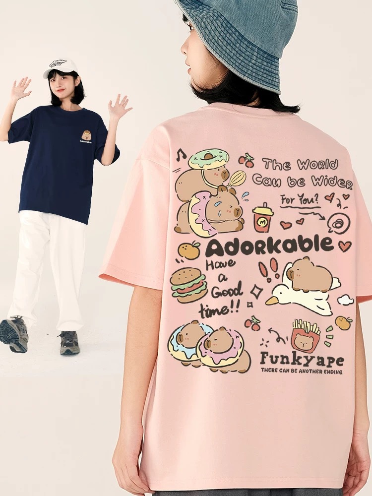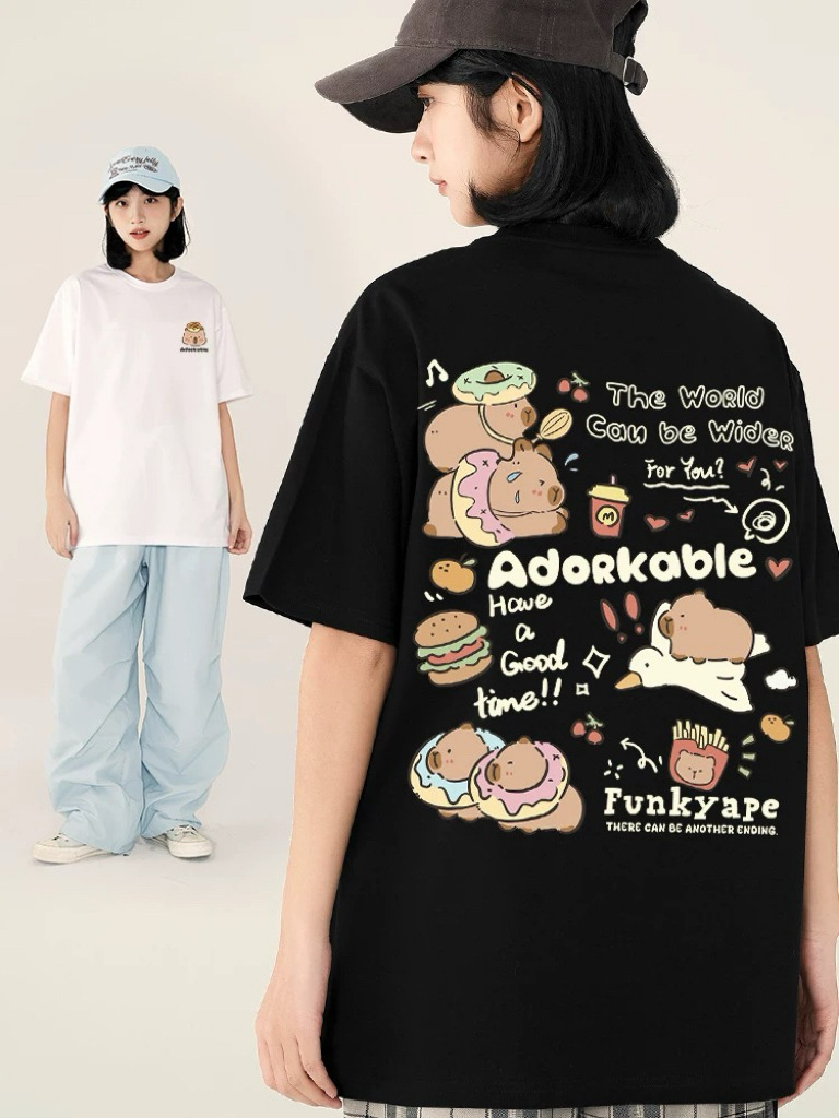 코튼 백 칼라 여름 새로운 일본 스타일 만화 인쇄 가죽 카발라 짧은 소매 라운드 넥 티셔츠 남성과 여성의 귀여운스토어 가기
