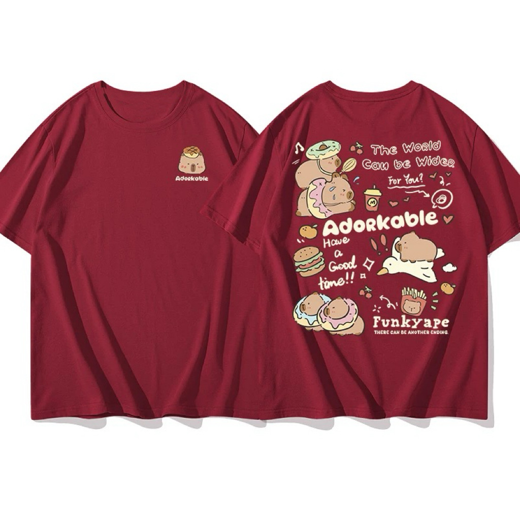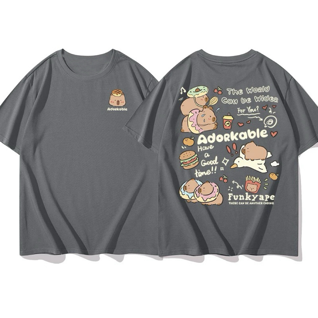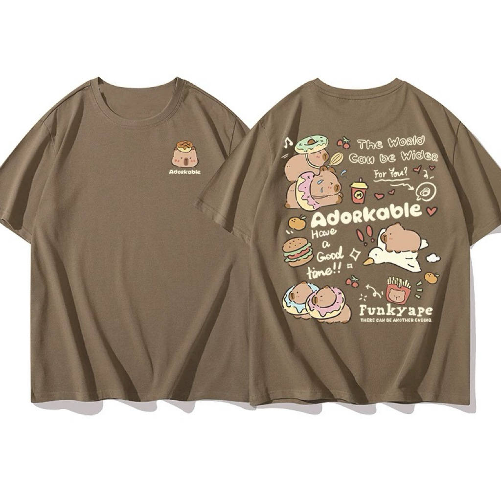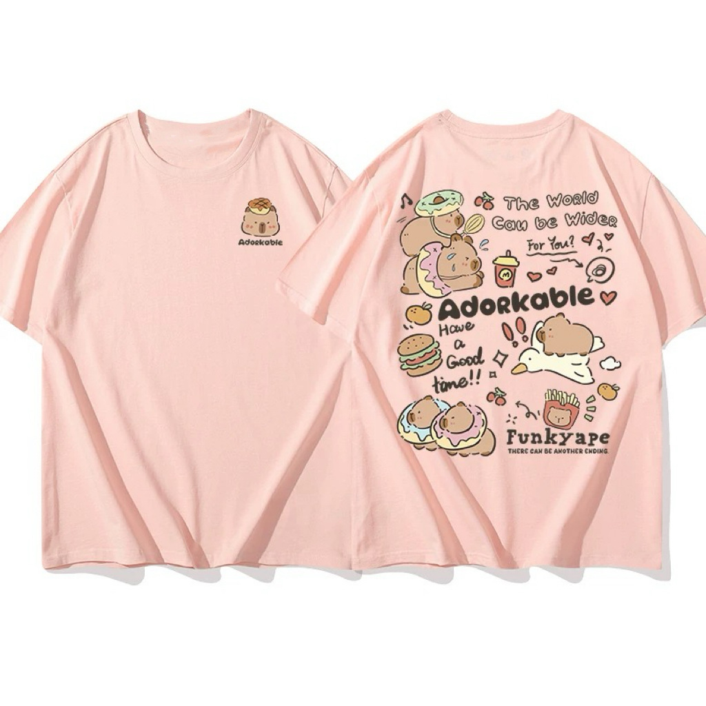 코튼 백 칼라 여름 새로운 일본 스타일 만화 인쇄 가죽 카발라 짧은 소매 라운드 넥 티셔츠 남성과 여성의 귀여운스토어 가기