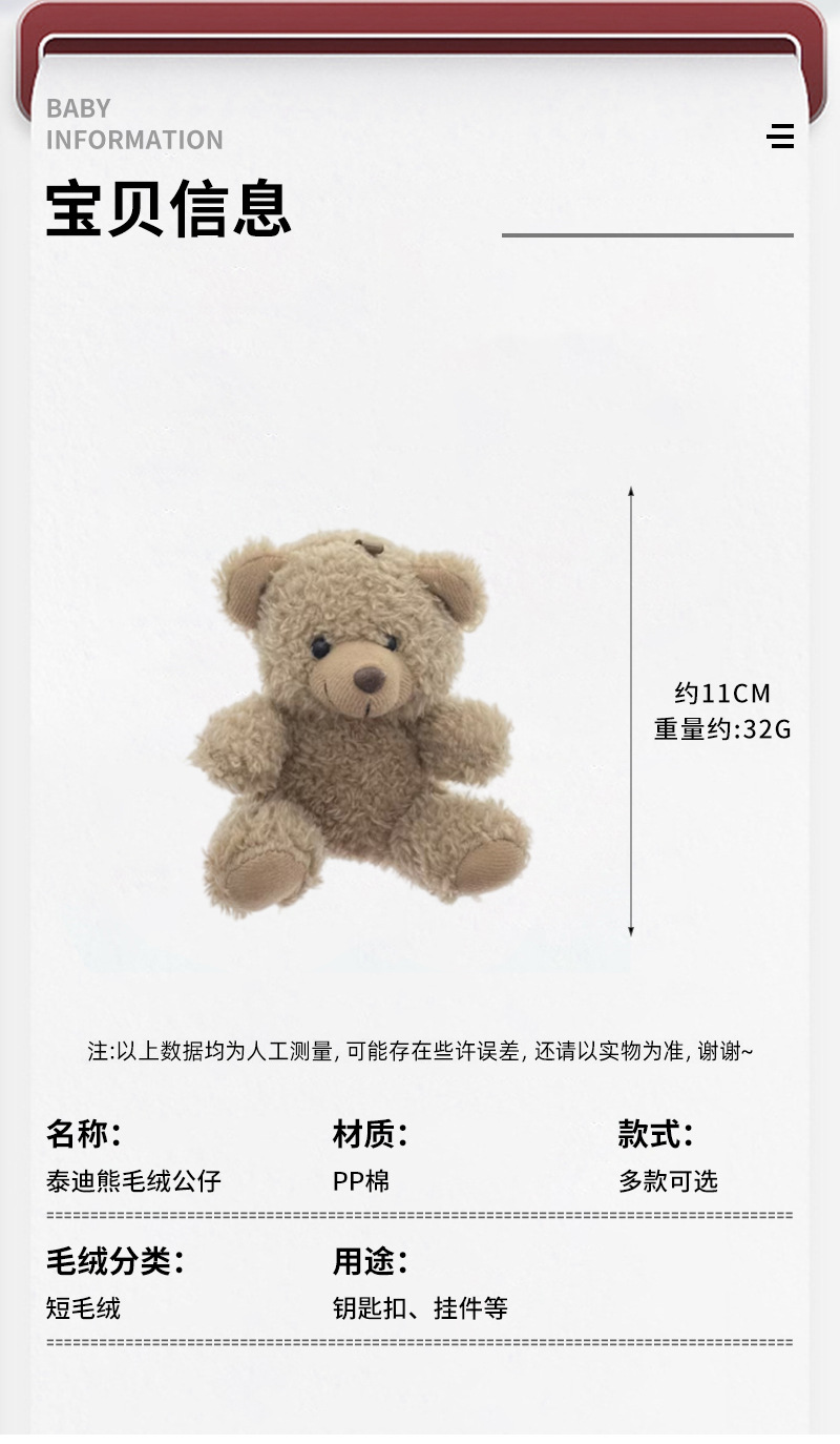 만화 매달린 마오 테디 베어 인형 가방 펜던트 작은 보석 봉제 인형 키 체인 도매