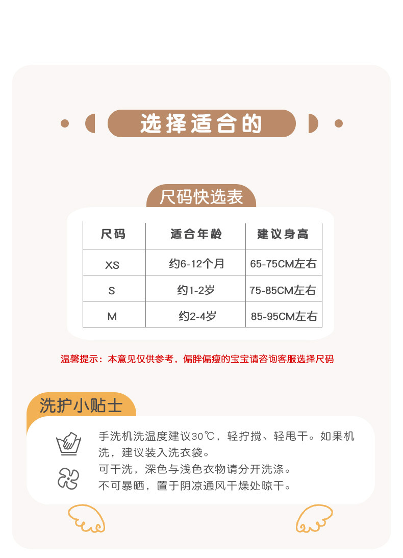 • XS 사이즈는 6~12개월 정도이며 권장 키는 65~75cm입니다.