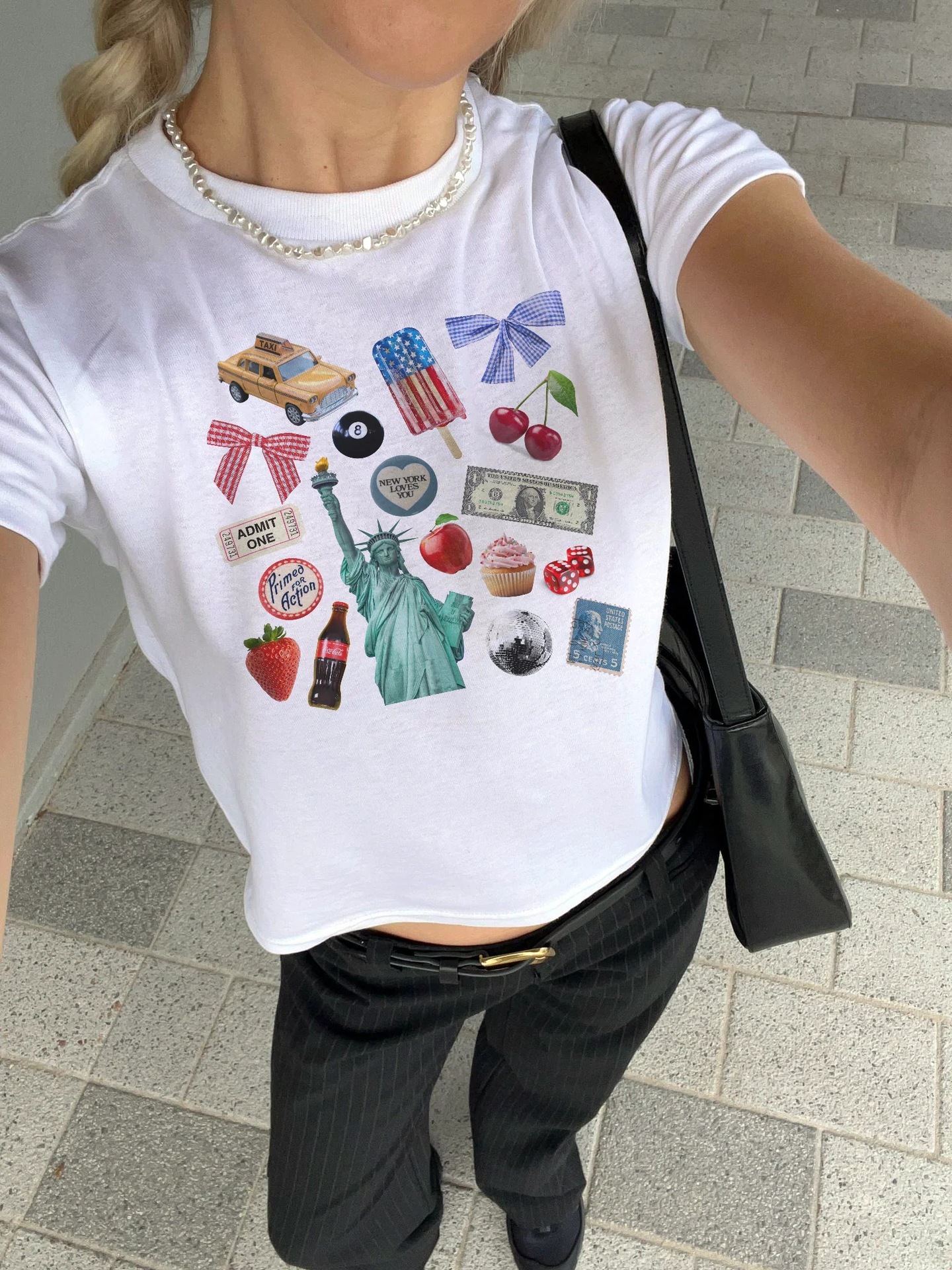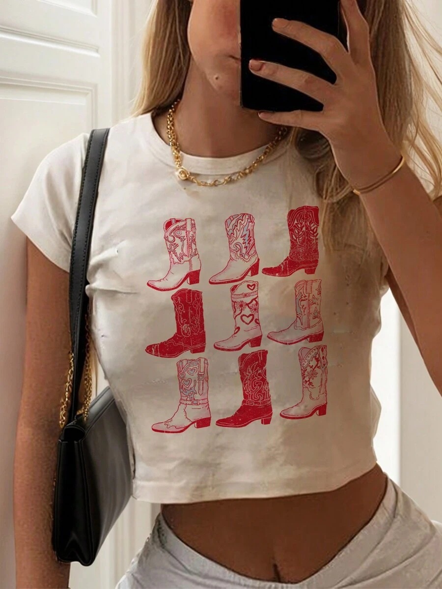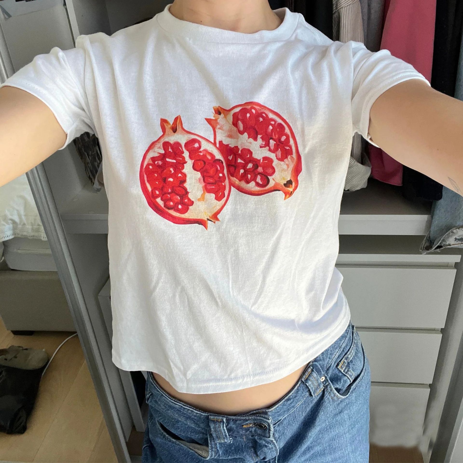 아메리칸 스타일 레트로 Y2K 밀레니엄 스타일 석류 패턴 반팔 짧은 티셔츠 여성용 핫 걸 슬림 핏 숄더 크롭 탑 트렌디스토어 가기