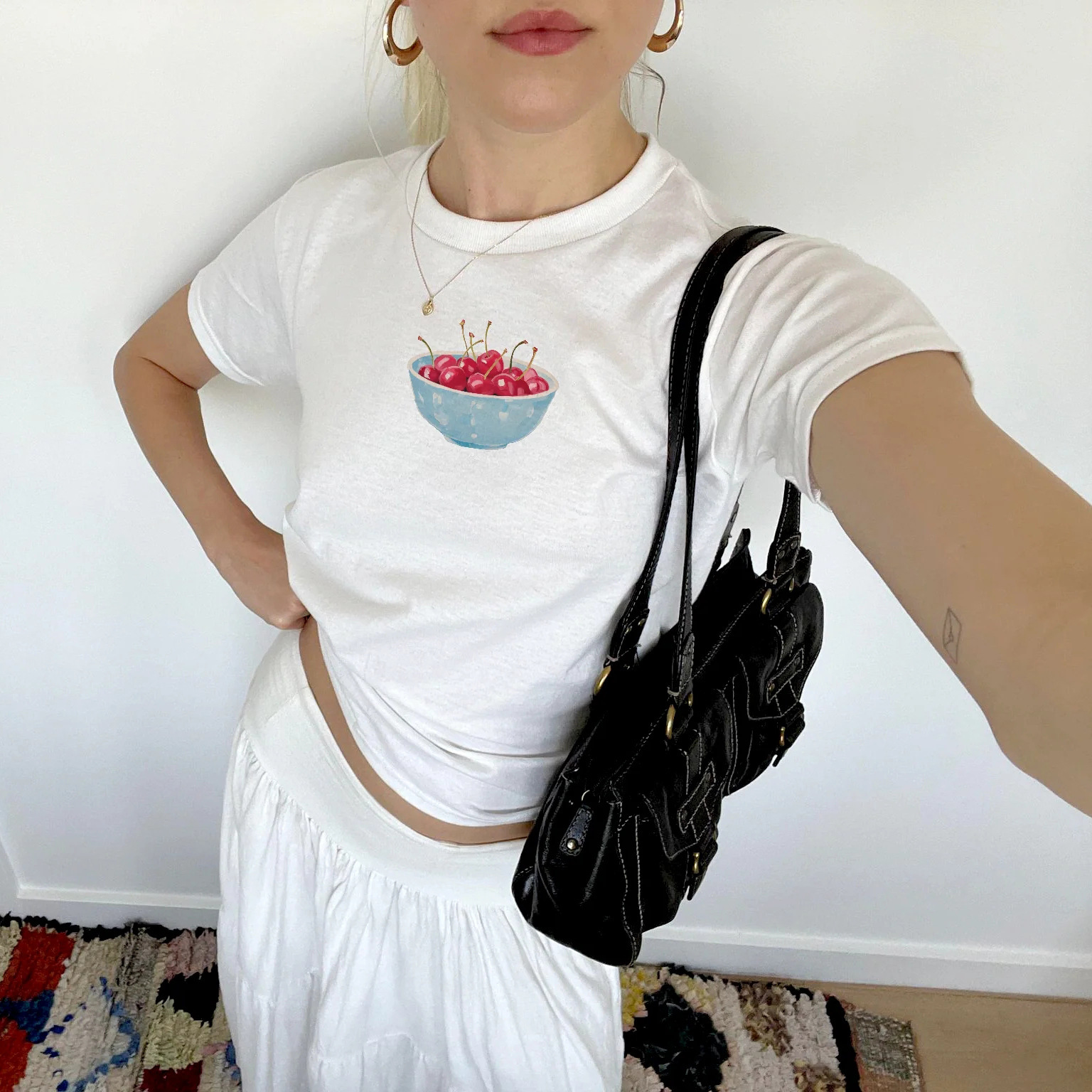 아메리칸 스타일 레트로 Y2K 밀레니엄 스타일 석류 패턴 반팔 짧은 티셔츠 여성용 핫 걸 슬림 핏 숄더 크롭 탑 트렌디