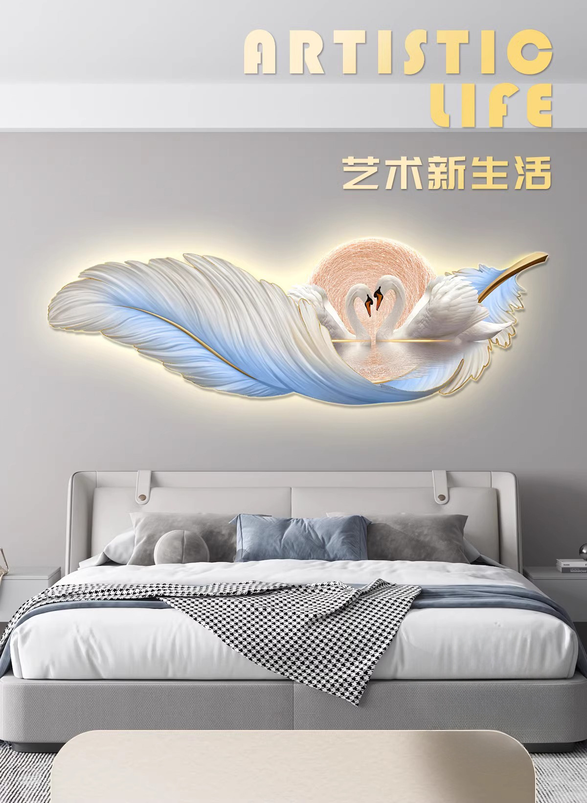 가벼운 고급 따뜻한 침실 침대 옆 장식 그림 깃털 백조 led 분위기 빛 그림 교수형 그림 방 마스터 침실 벽 벽화