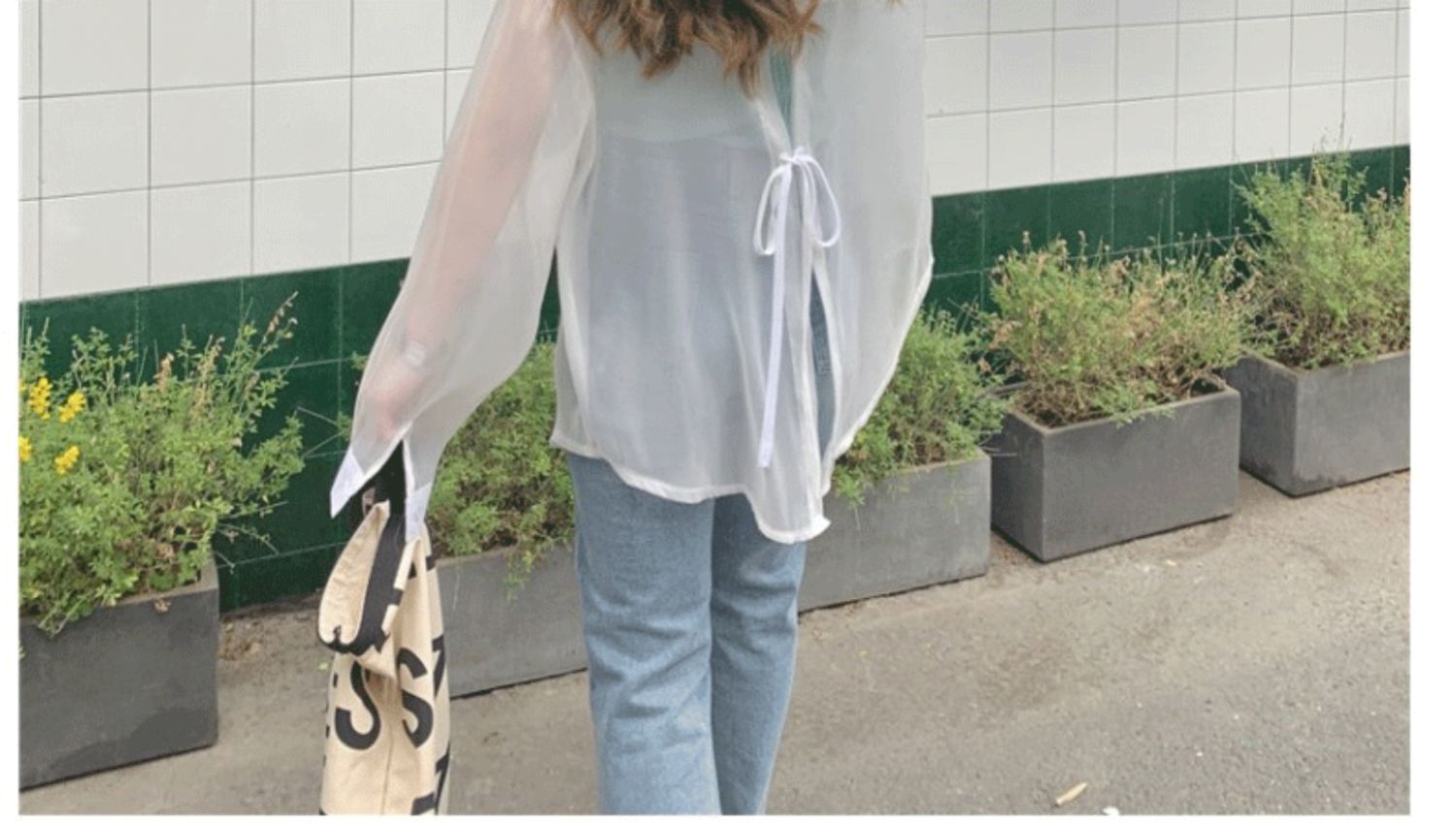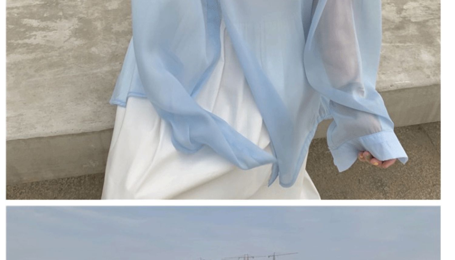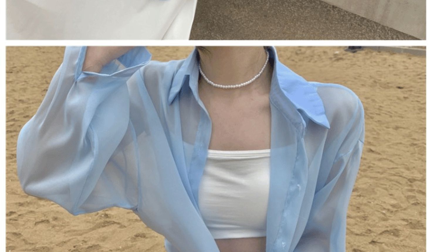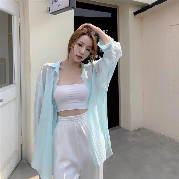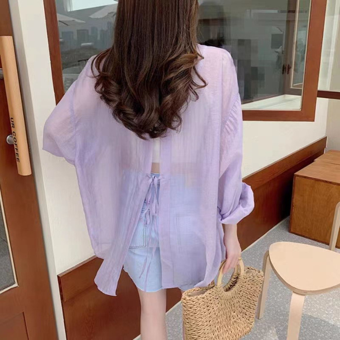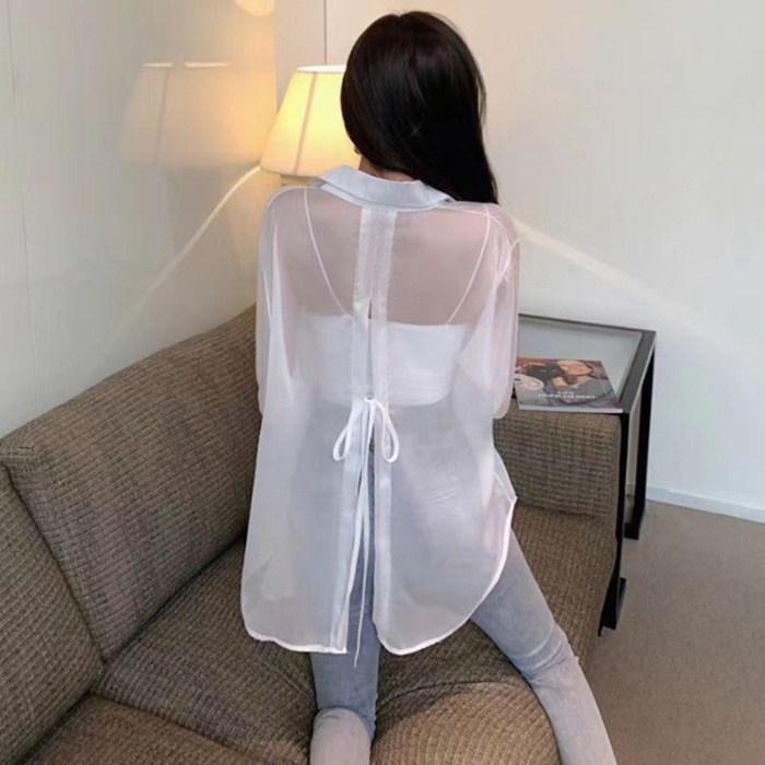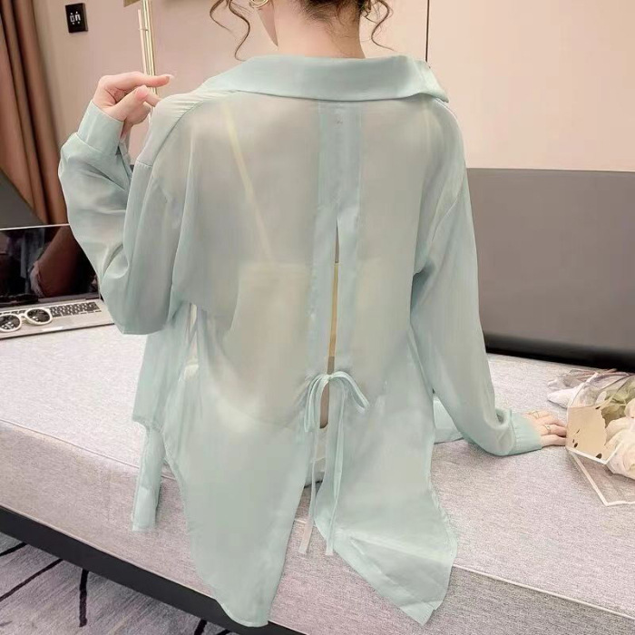 아이스 실크 쉬폰 백리스 셔츠 여성용 여름 새로운 초박형 에어컨 셔츠 재킷 선스크린 통기성 느슨한 캐주얼 탑