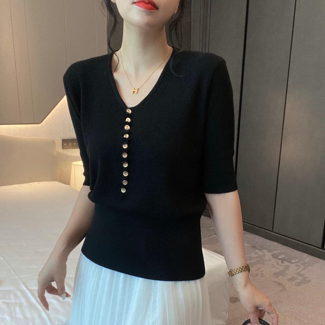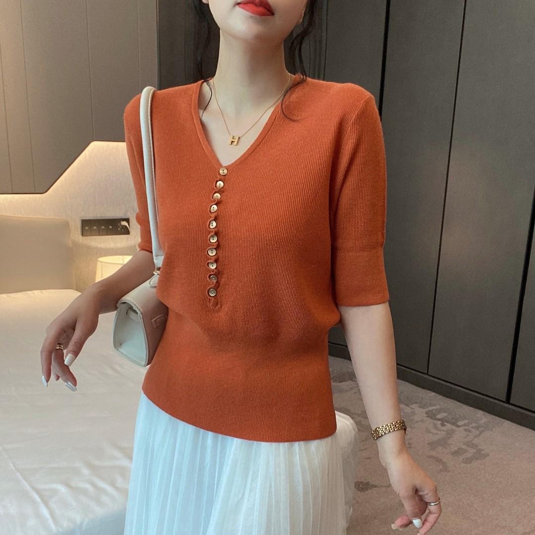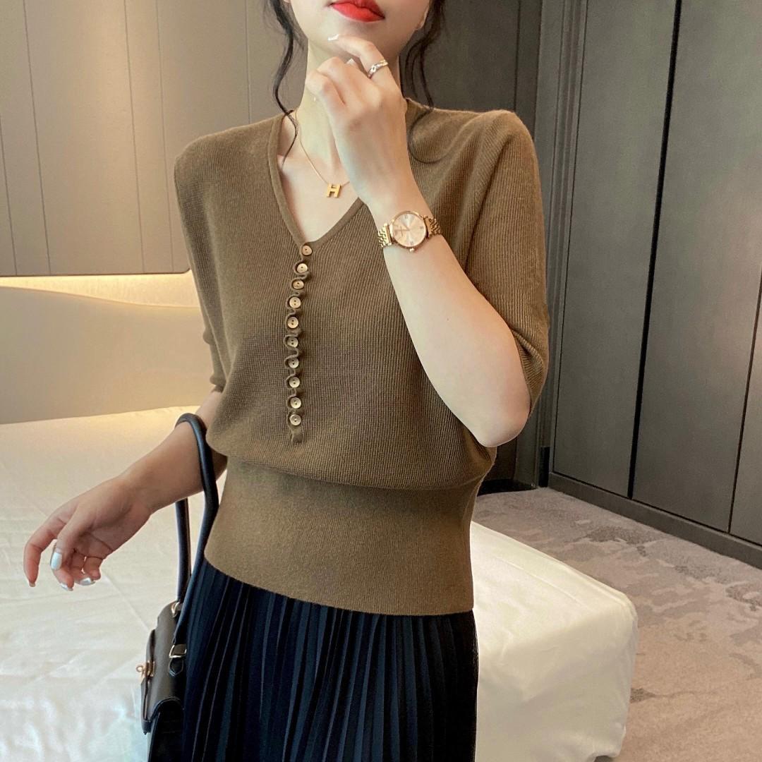하이 허리 넓은 챙이 우아한 반소매 니트 스웨터 미드 슬리브 솔리드 컬러 V 넥 디자인 센스 니트 스웨터 여성용 풀오버 슬리밍 탑스토어 가기