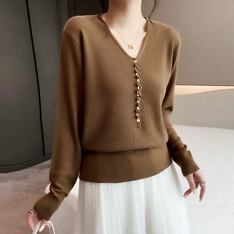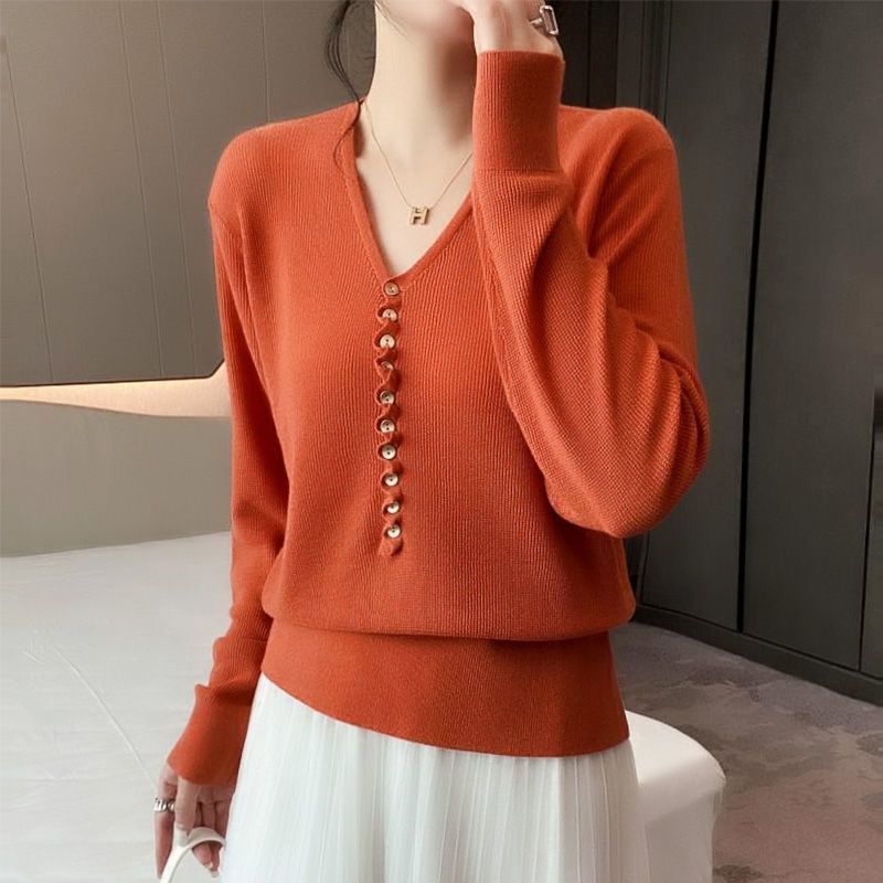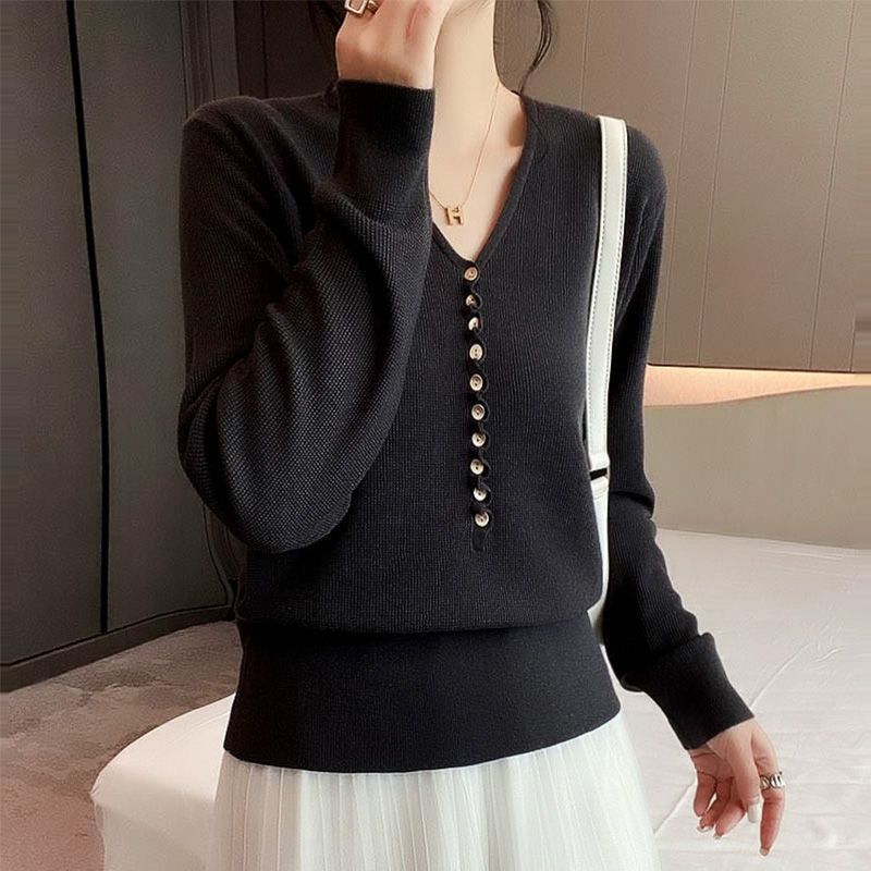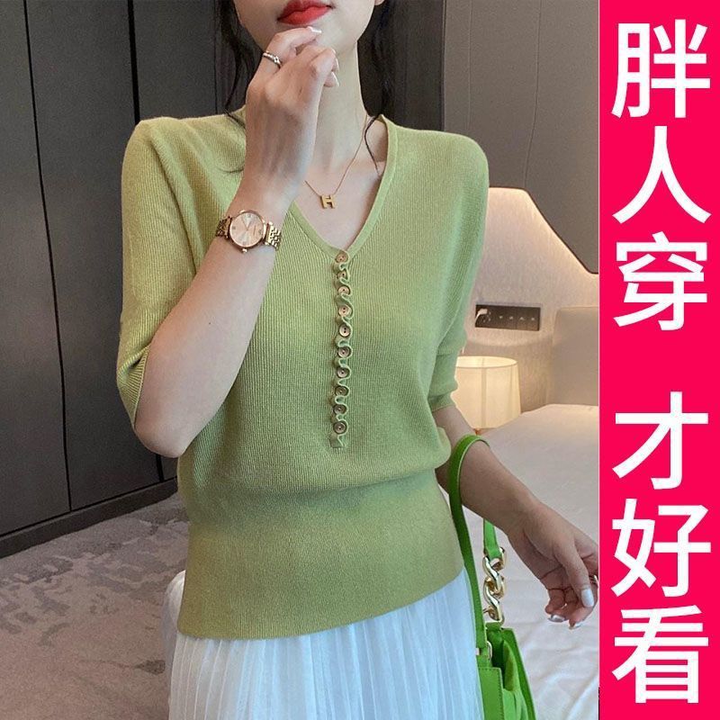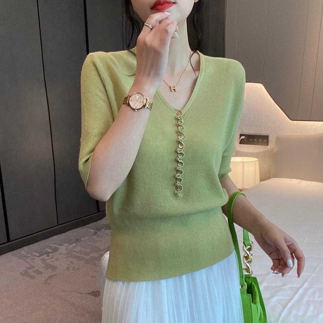 하이 허리 넓은 챙이 우아한 반소매 니트 스웨터 미드 슬리브 솔리드 컬러 V 넥 디자인 센스 니트 스웨터 여성용 풀오버 슬리밍 탑스토어 가기