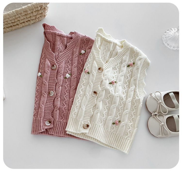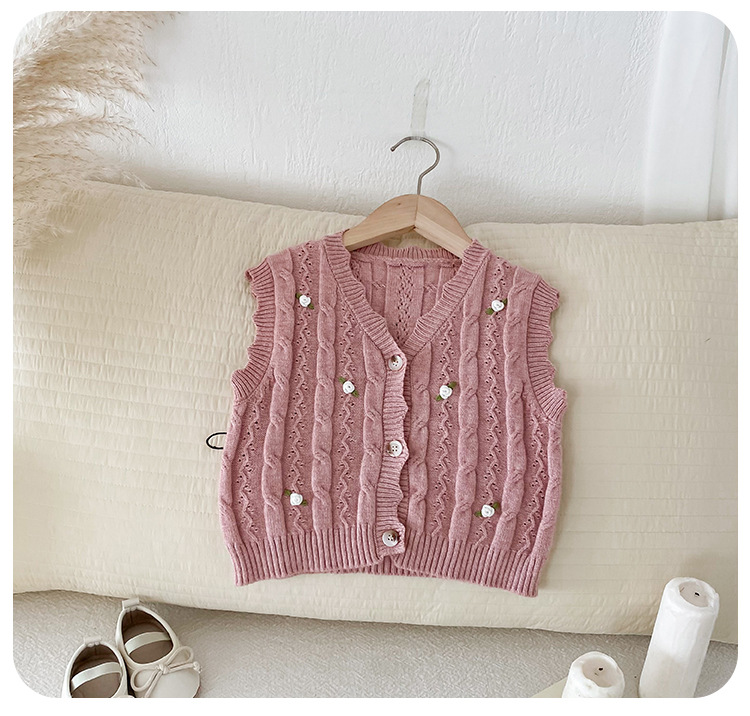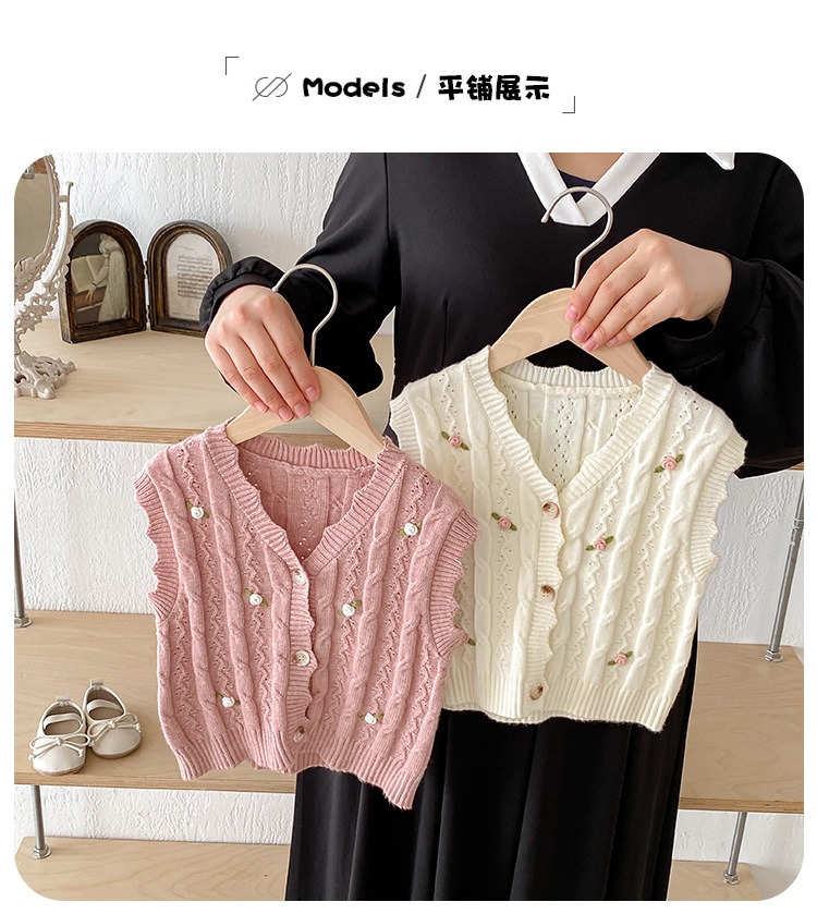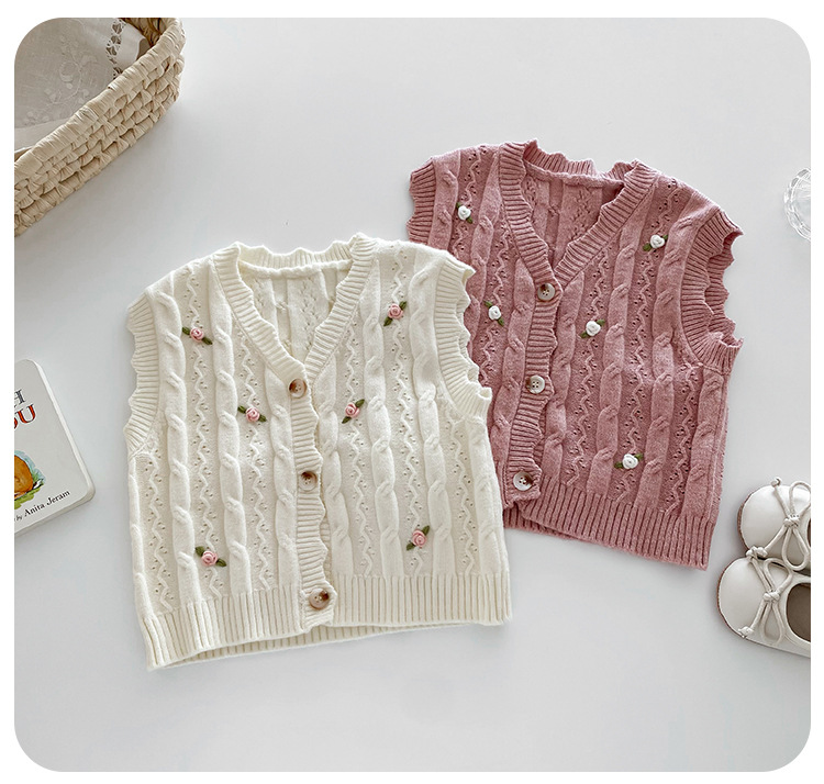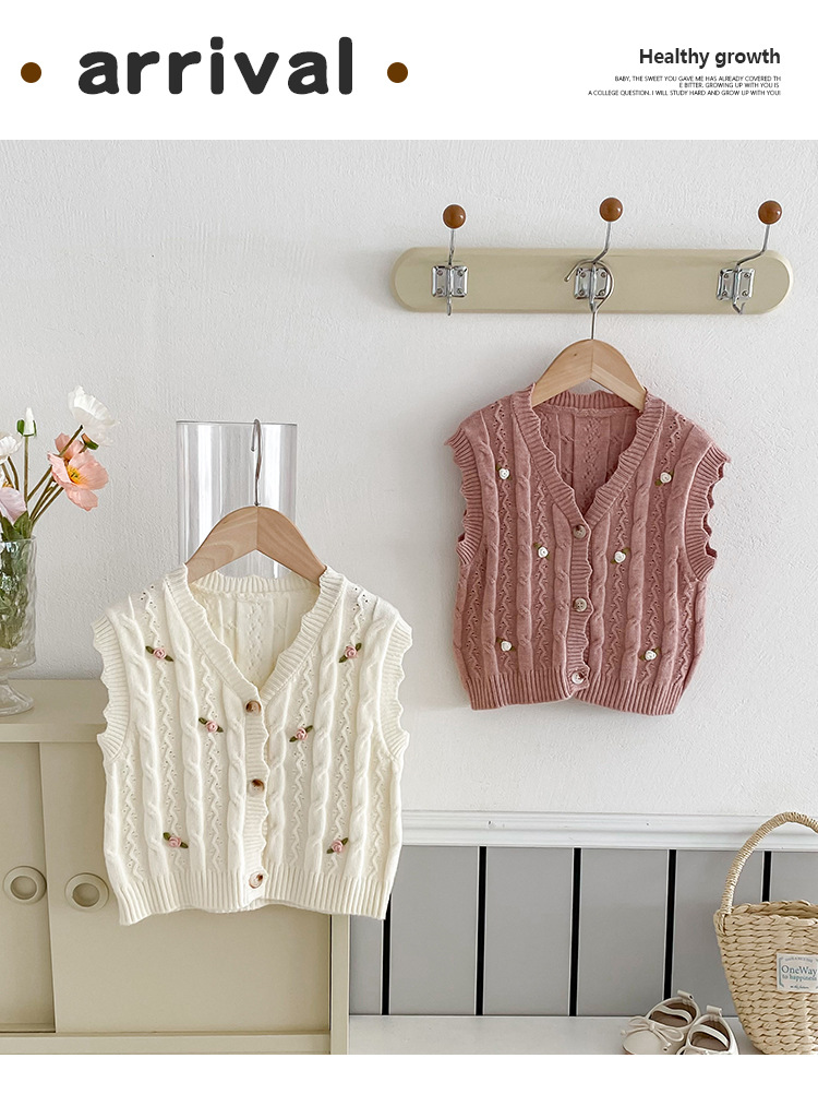 한국 스타일 여자 아기 자수 꽃무늬 니트 조끼 봄 가을 아기 옷 민소매 니트 가디건 세련된 조끼스토어 가기