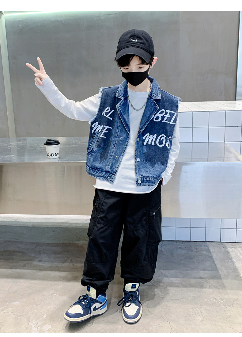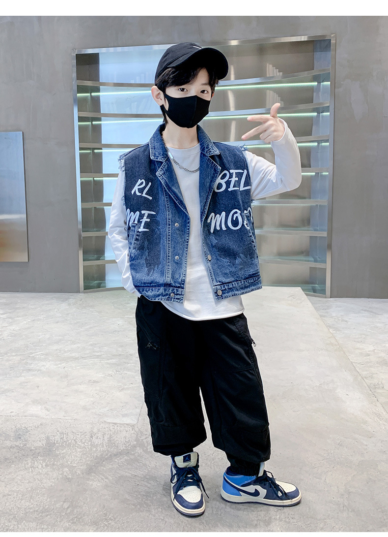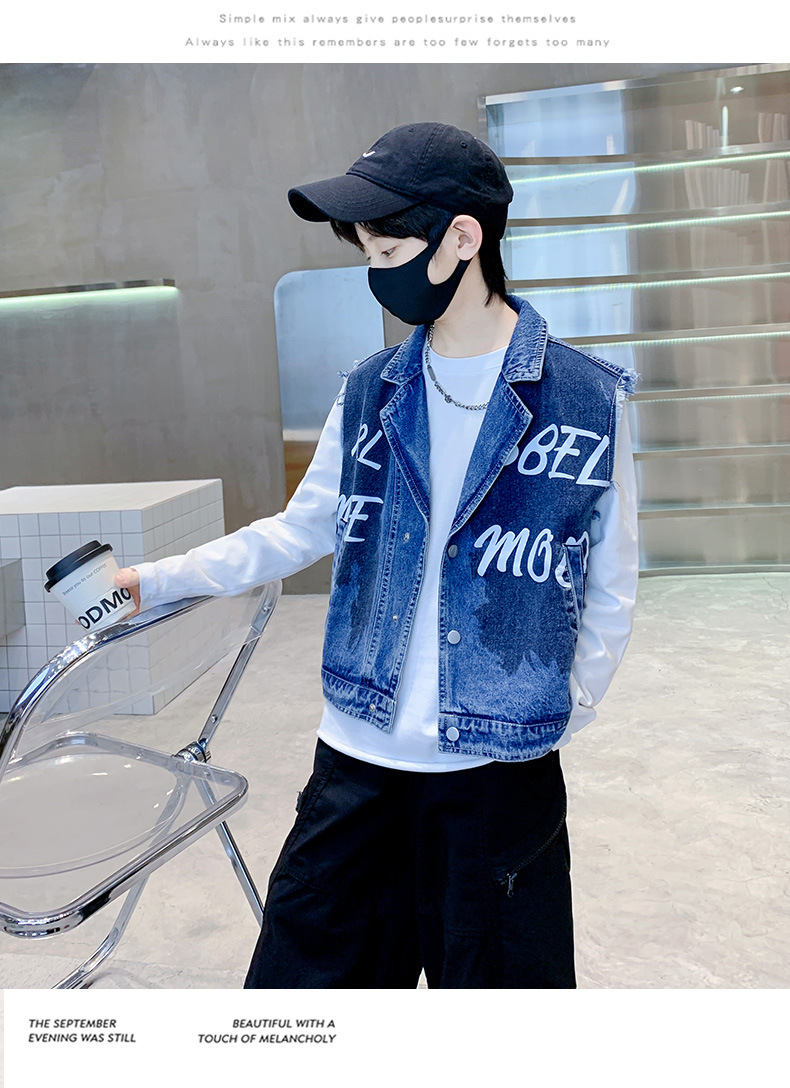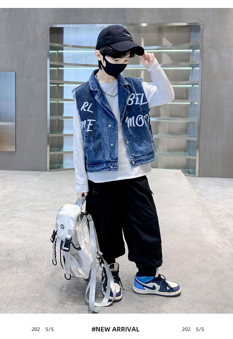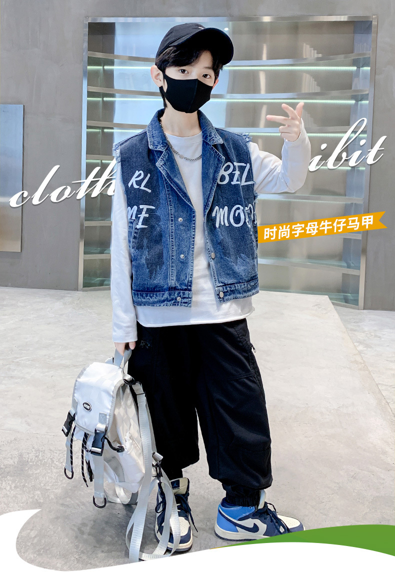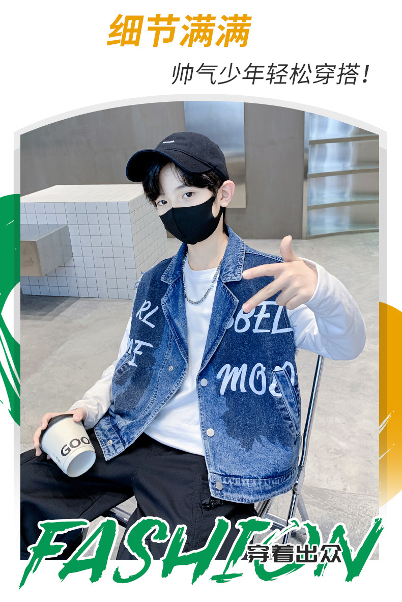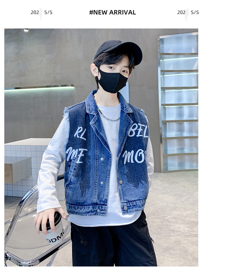 소년 데님 조끼 코트 봄과 가을 2024 새로운 세련된 유행 편지 민소매 조끼 최고 가을 패션스토어 가기