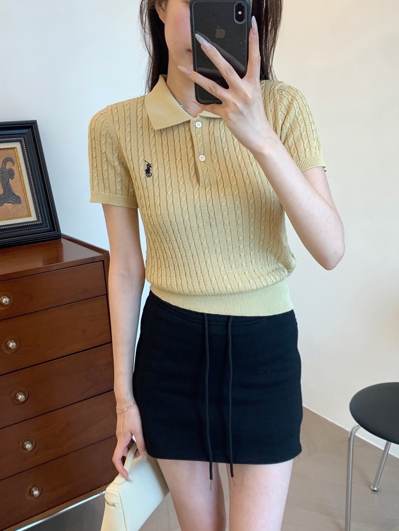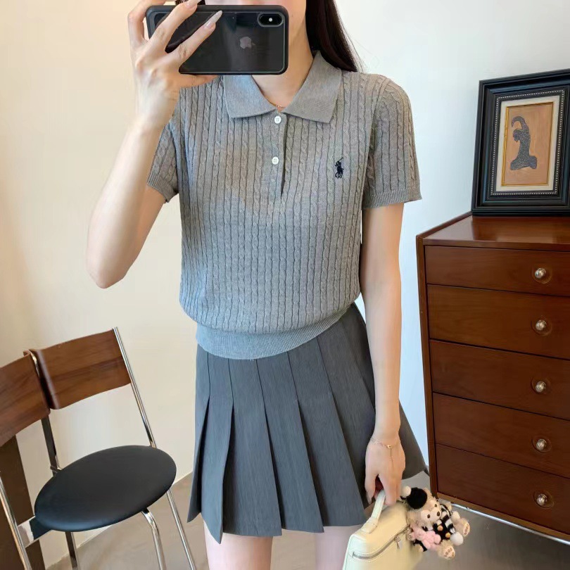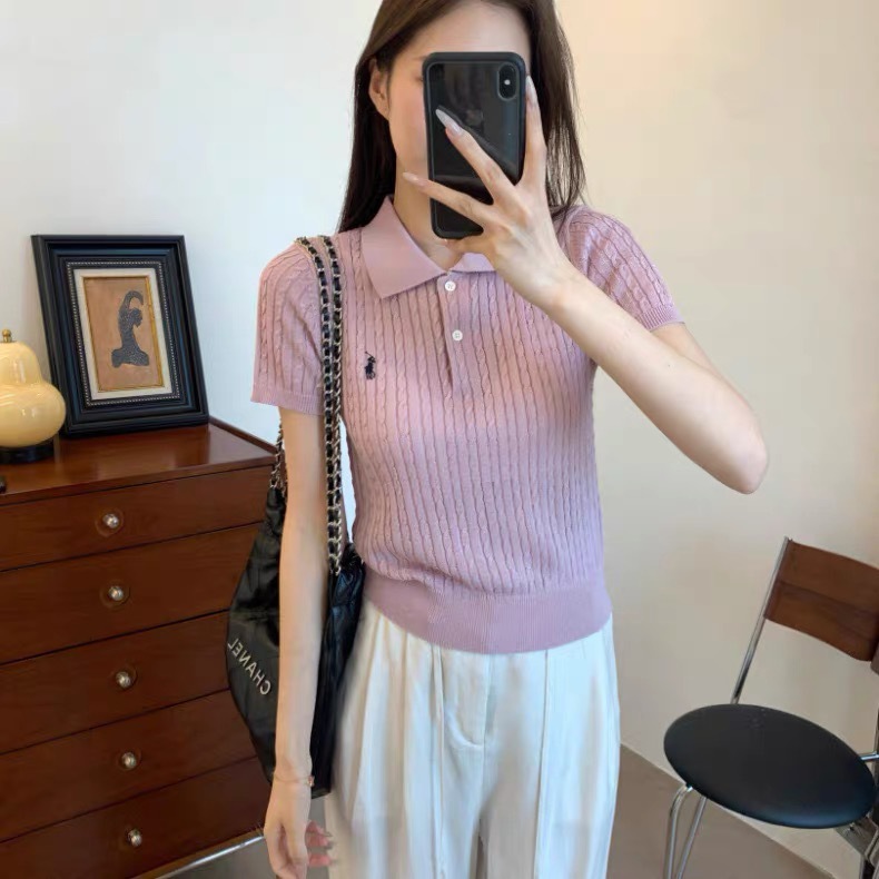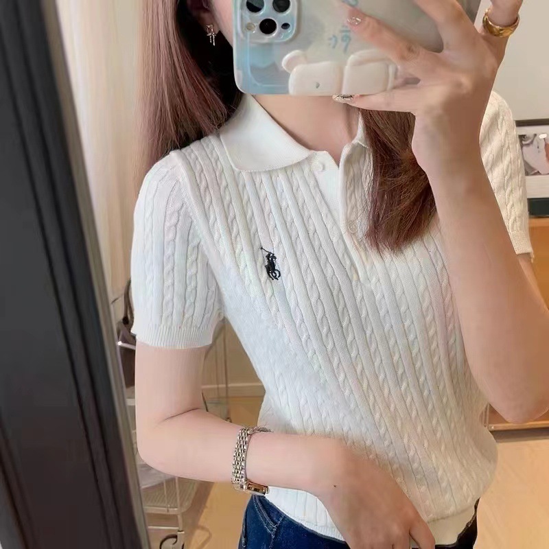 2024 여름 새로운 통근 클래식 폴로 칼라 트위스트 자수 니트 셔츠 짧은 소매 티셔츠 탑 여성