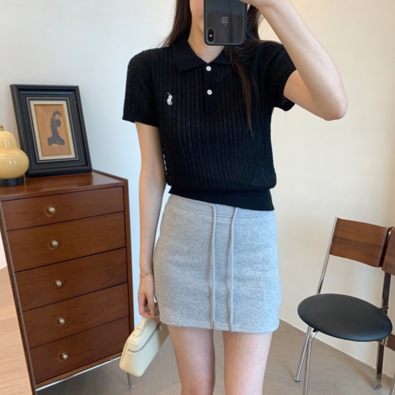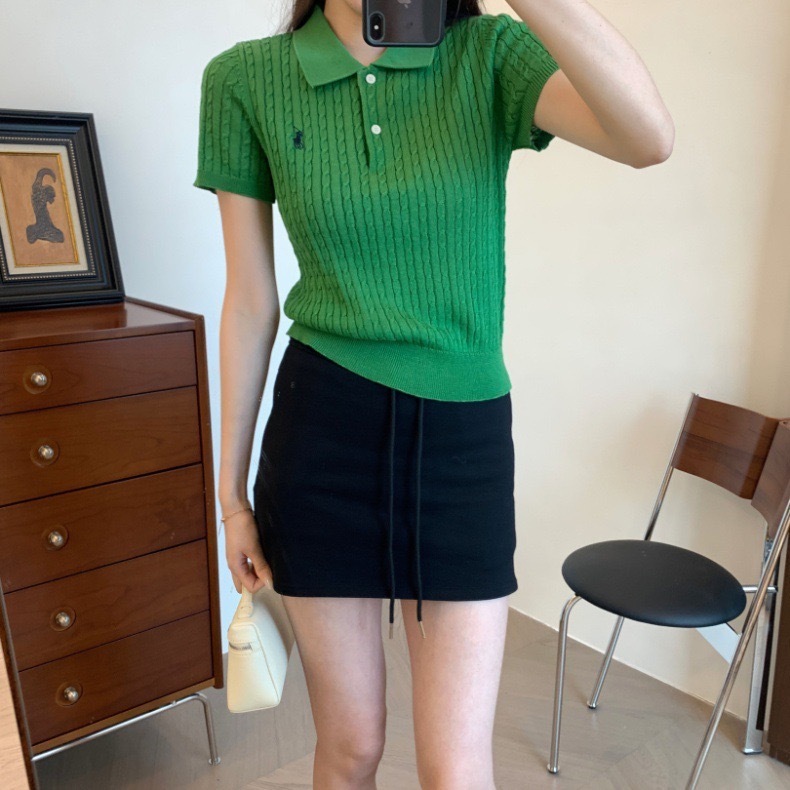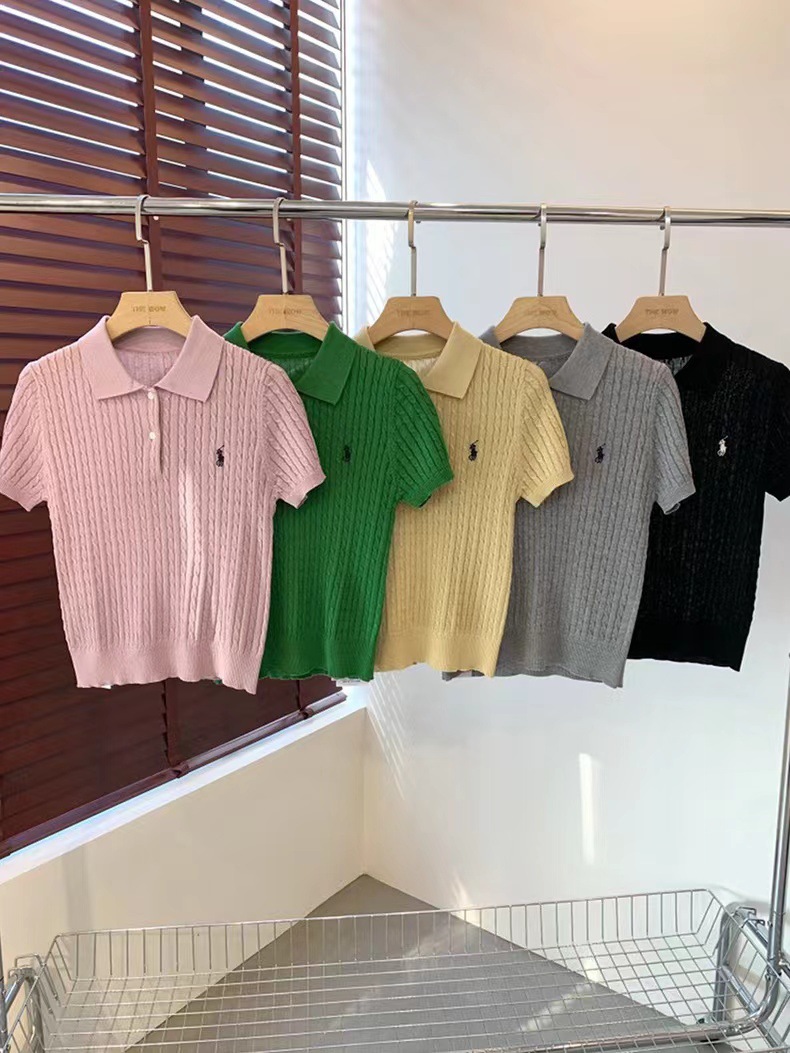 2024 여름 새로운 통근 클래식 폴로 칼라 트위스트 자수 니트 셔츠 짧은 소매 티셔츠 탑 여성스토어 가기