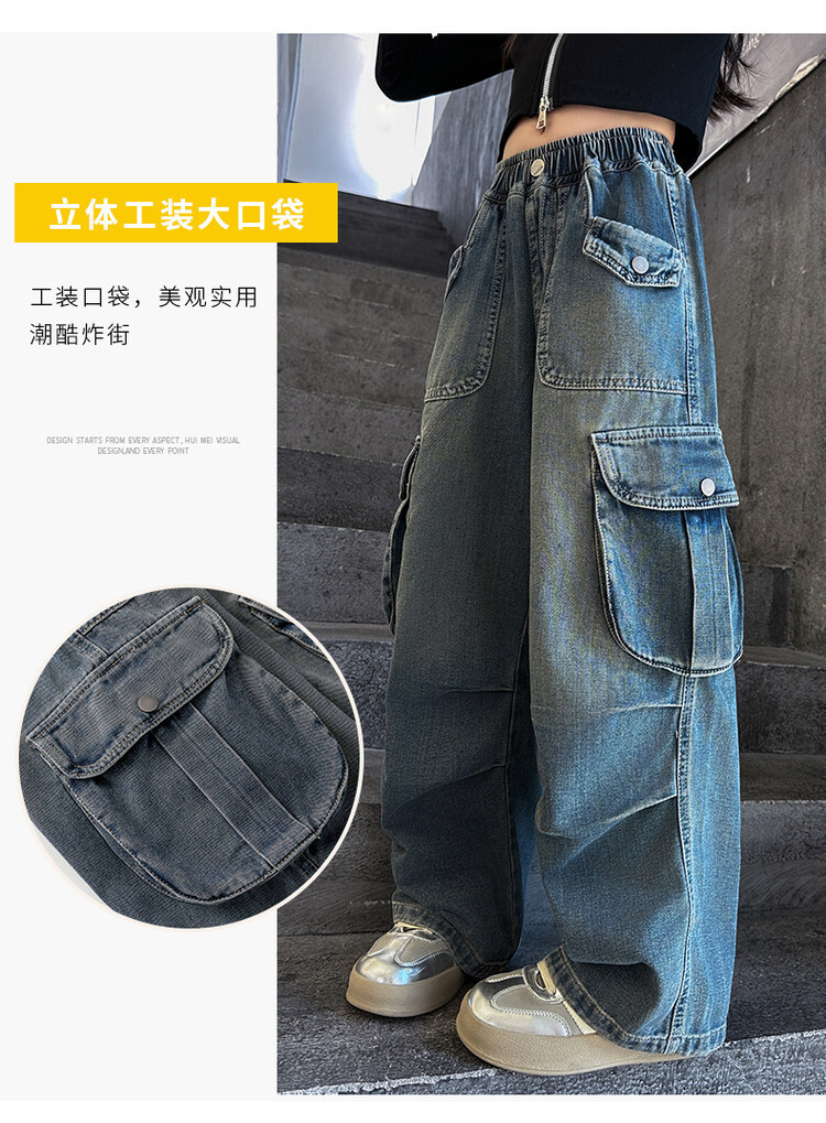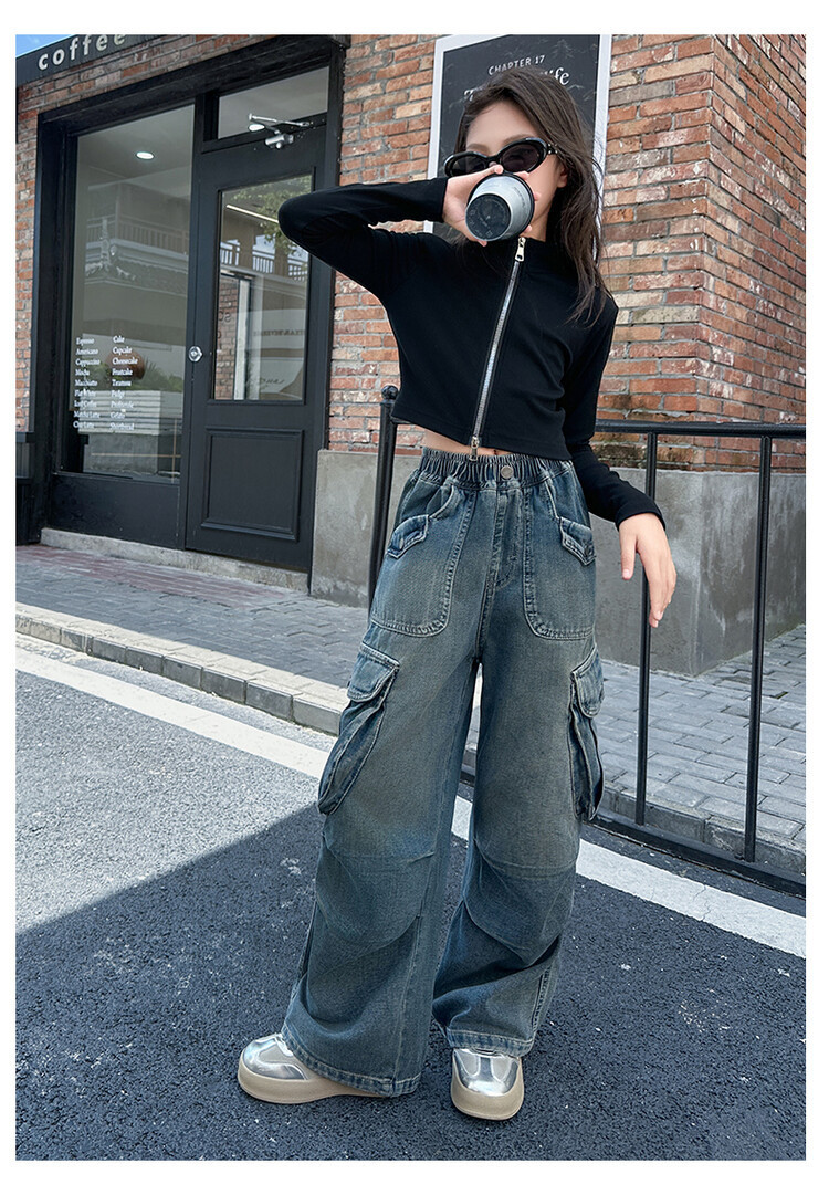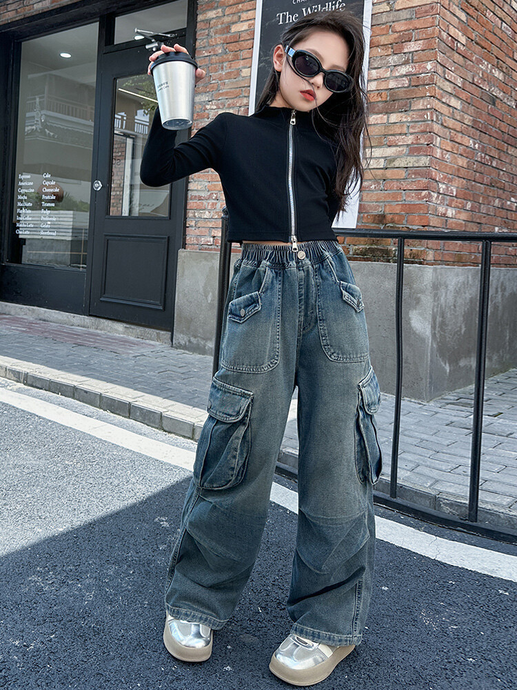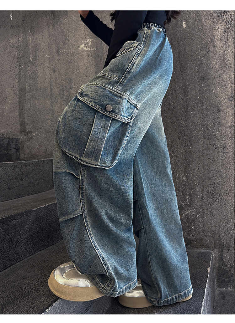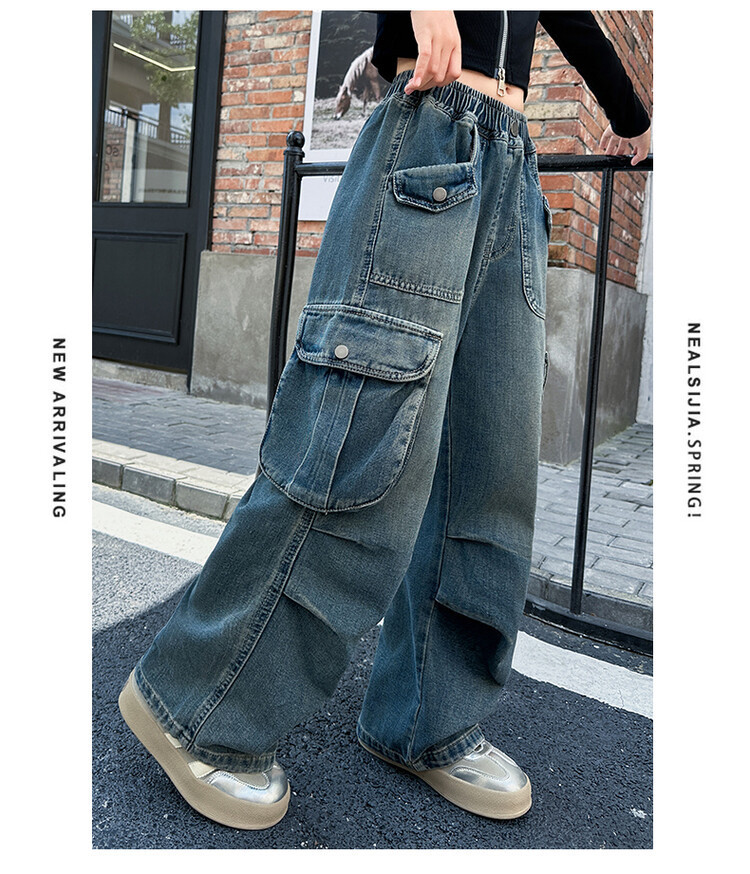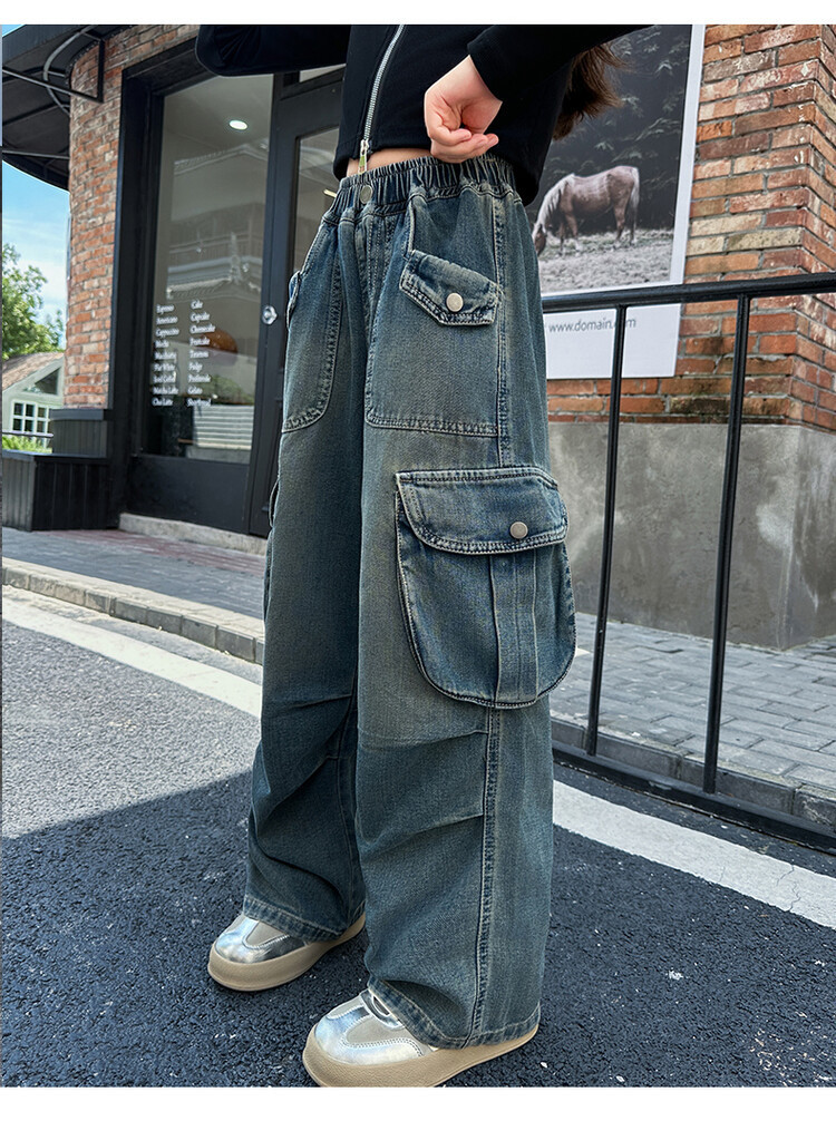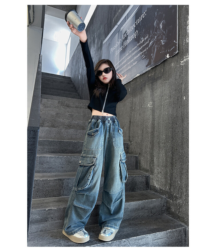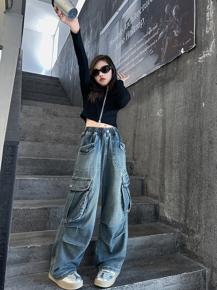 2025년 봄 가을 여아용 크로스보더 데님 팬츠, 중대형 아동용 트렌디하고 멋진 스트릿 댄스 바지, 여아용 와이드 팬츠 도매스토어 가기
