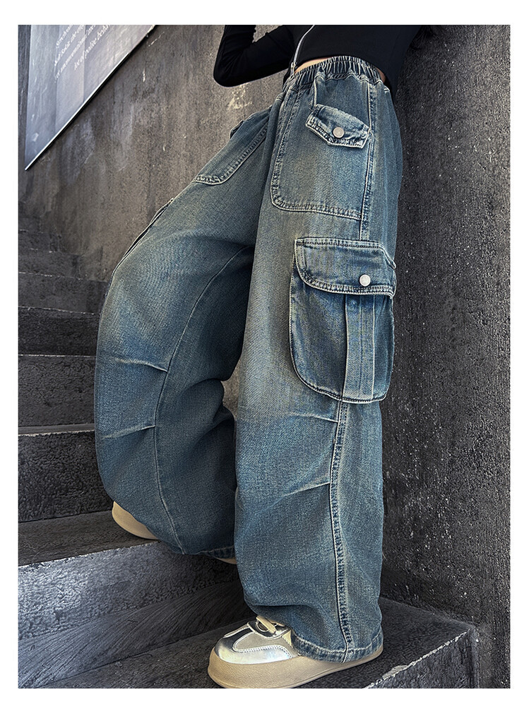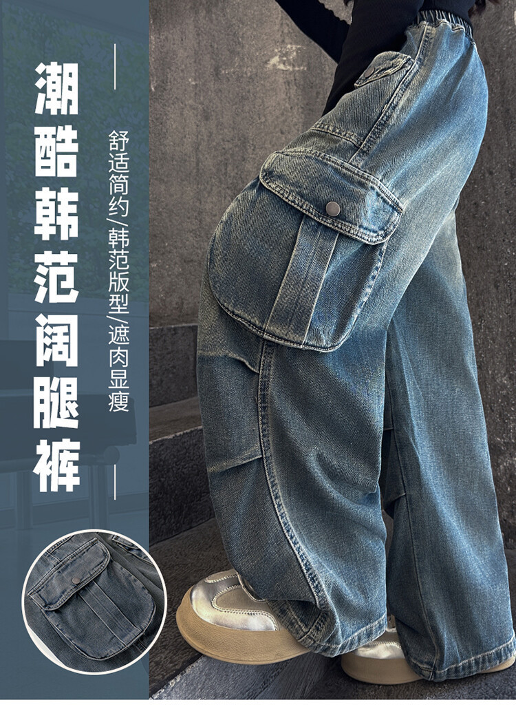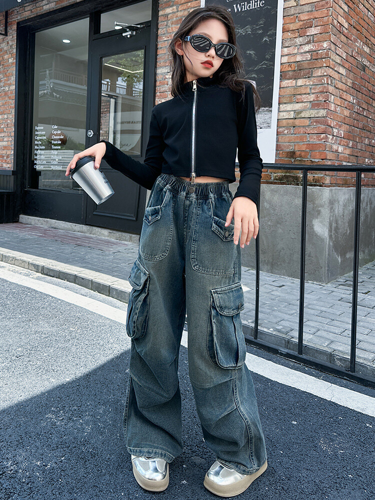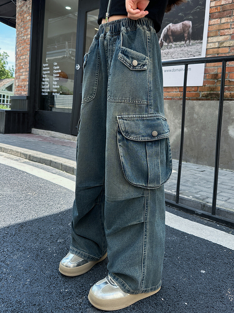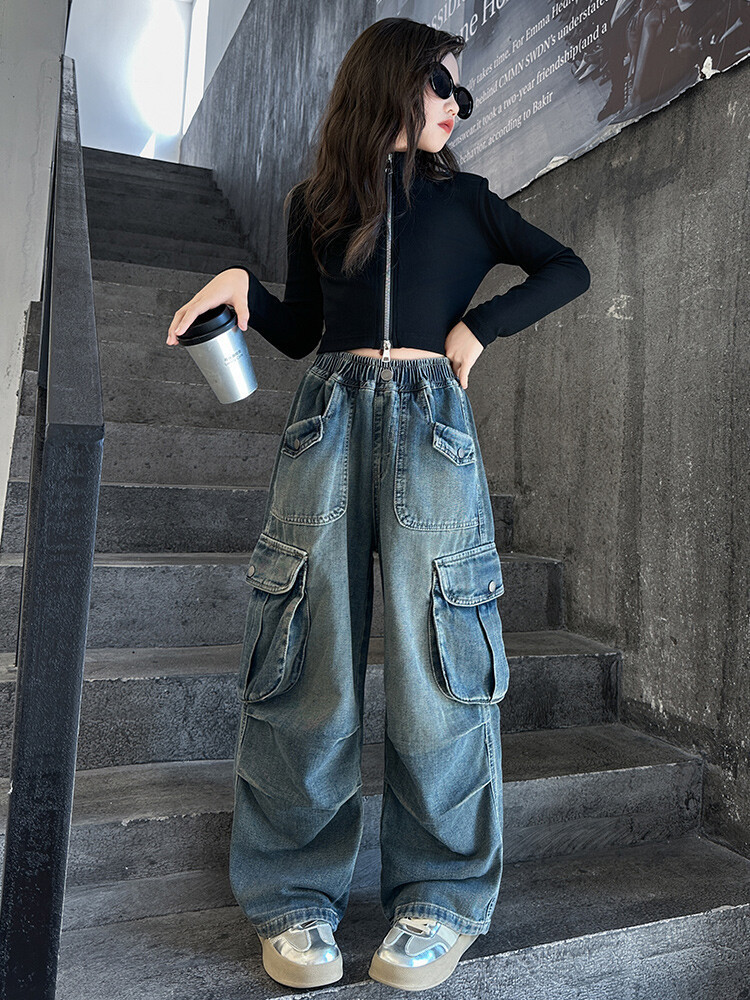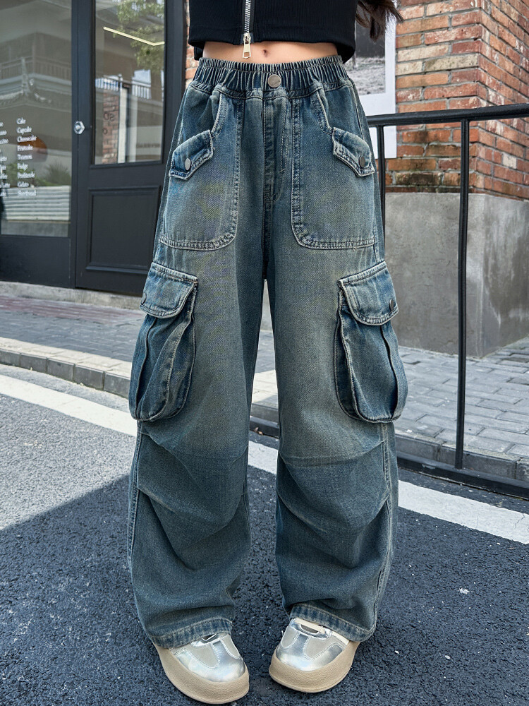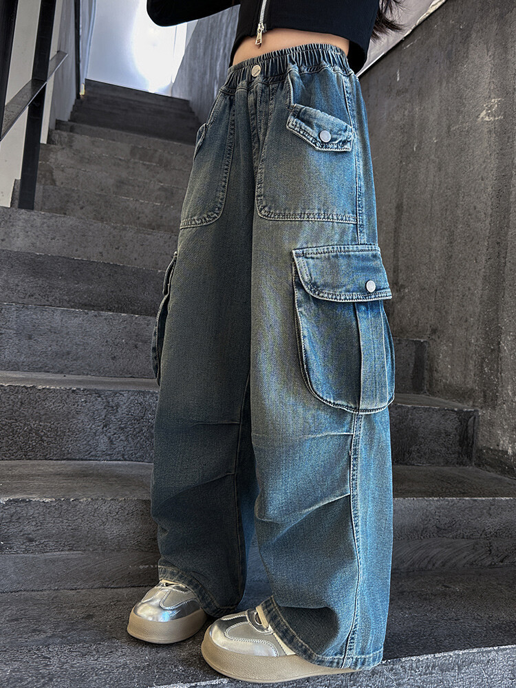 2025년 봄 가을 여아용 크로스보더 데님 팬츠, 중대형 아동용 트렌디하고 멋진 스트릿 댄스 바지, 여아용 와이드 팬츠 도매스토어 가기