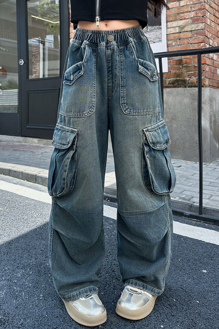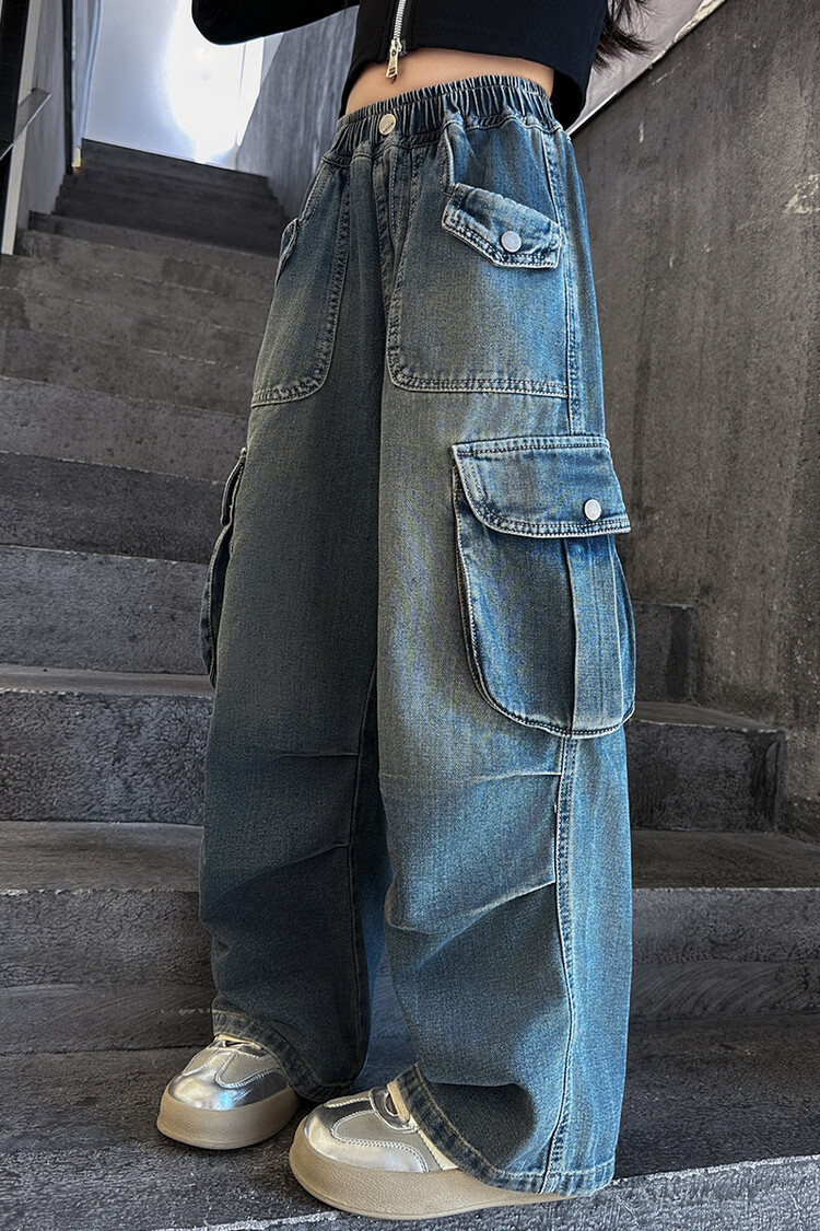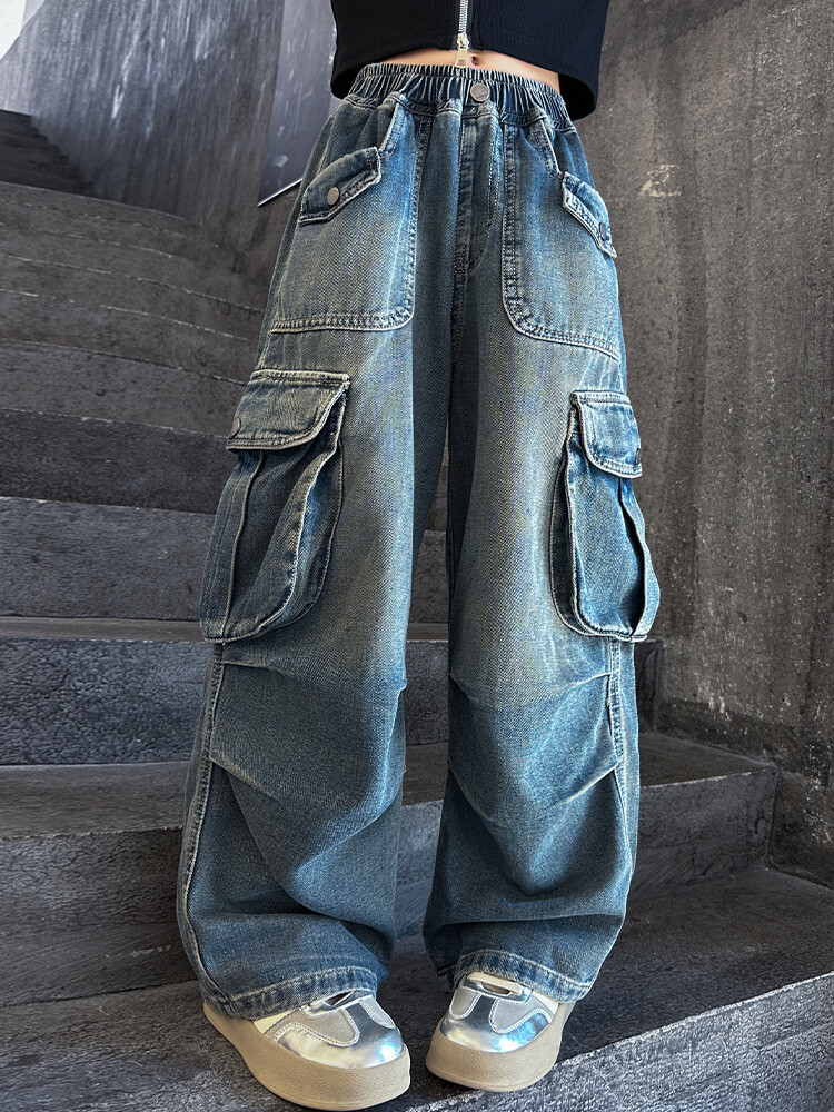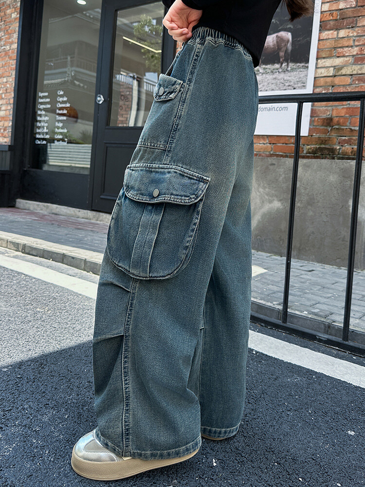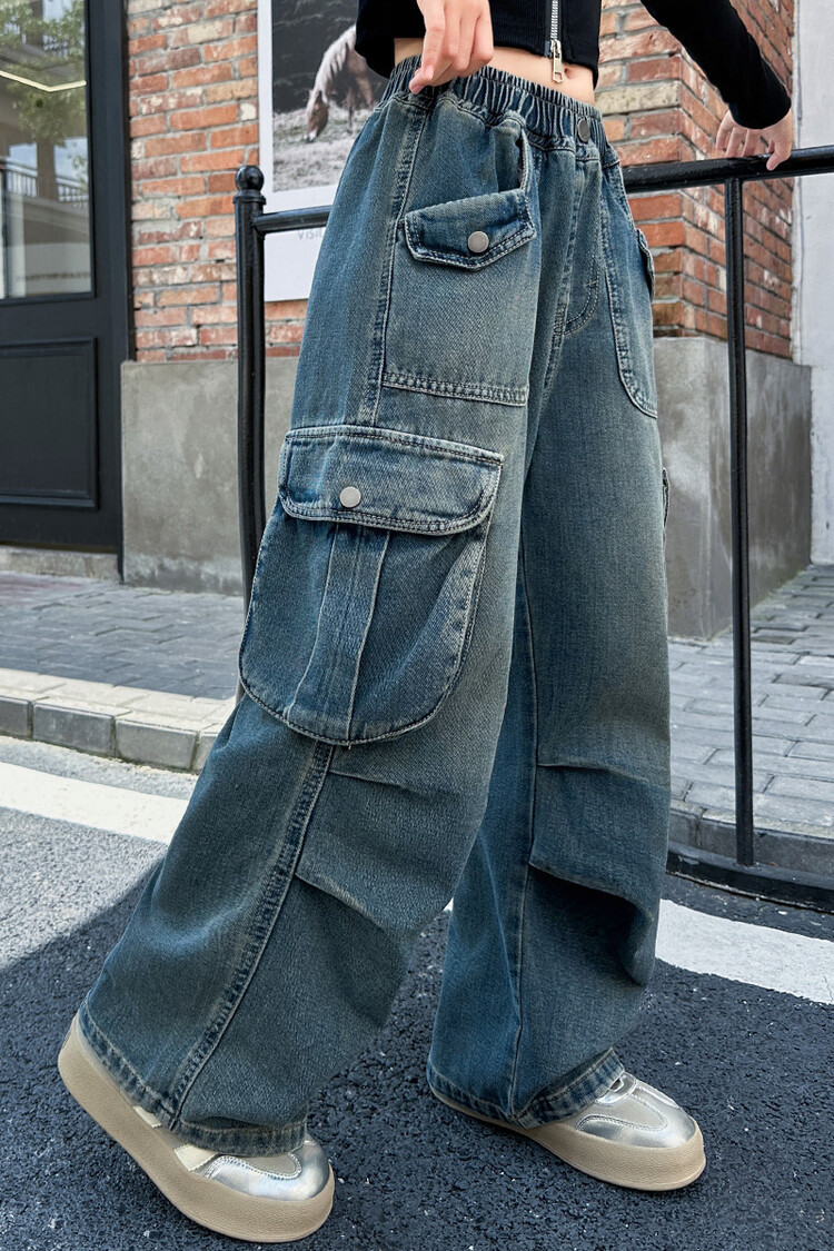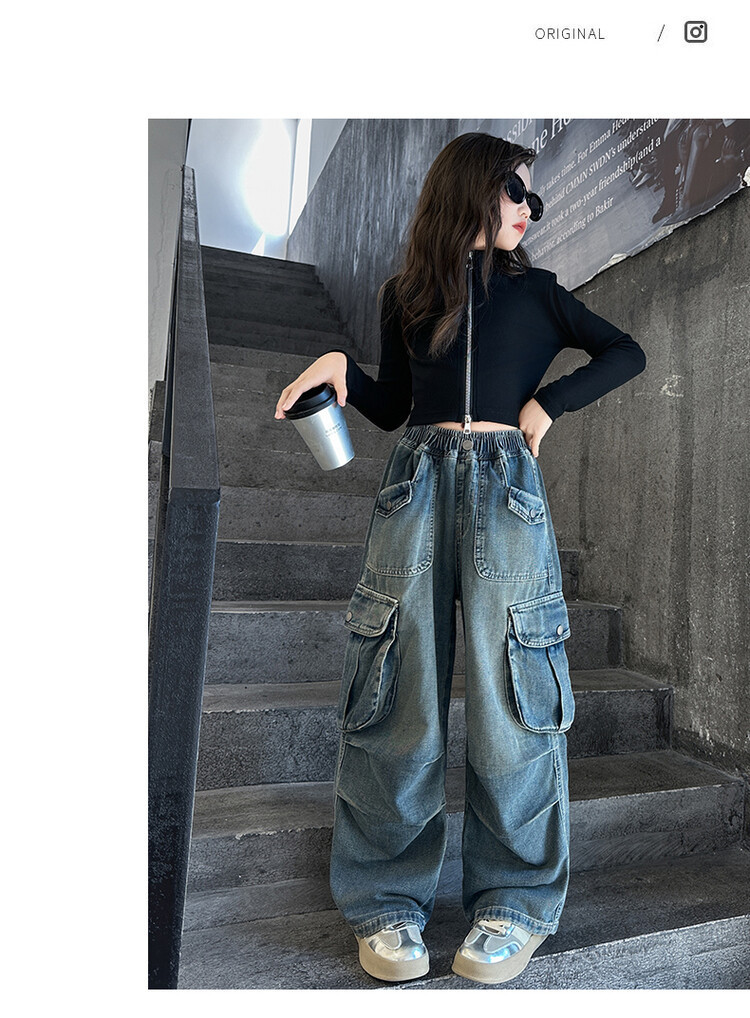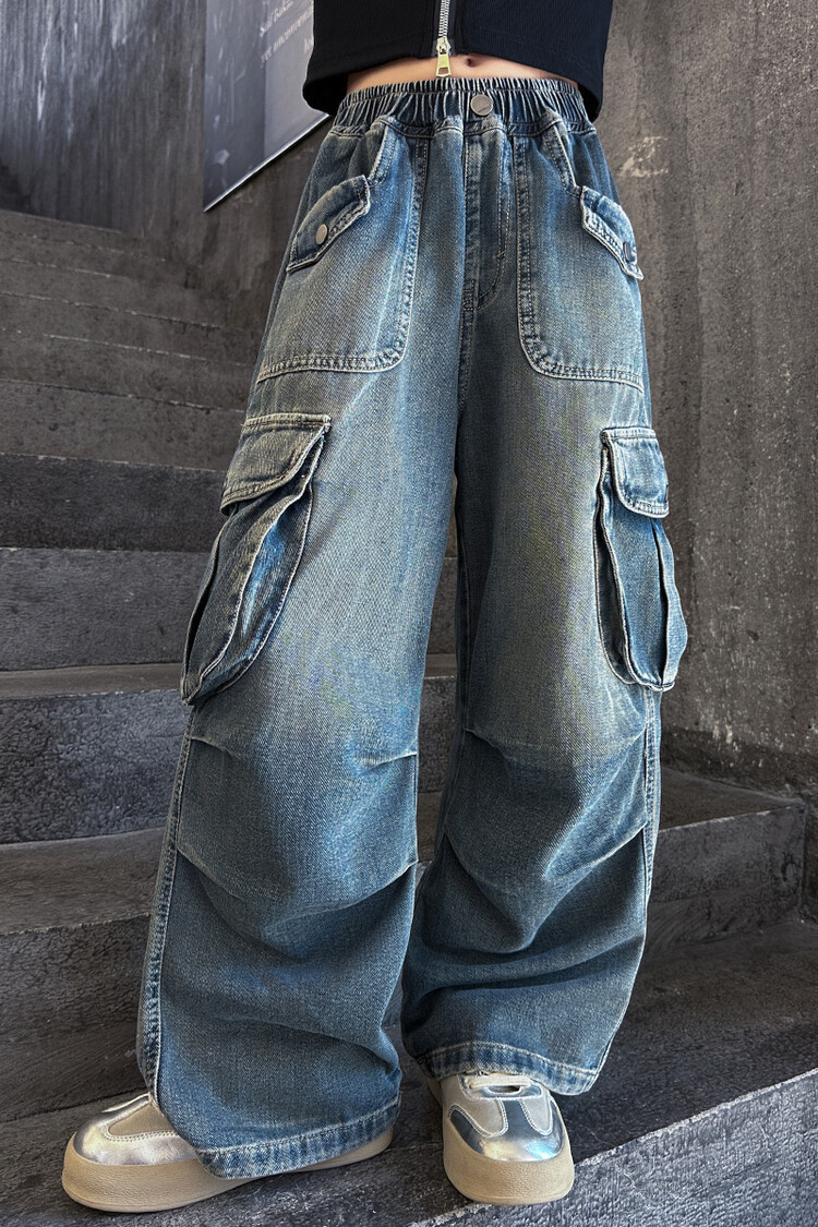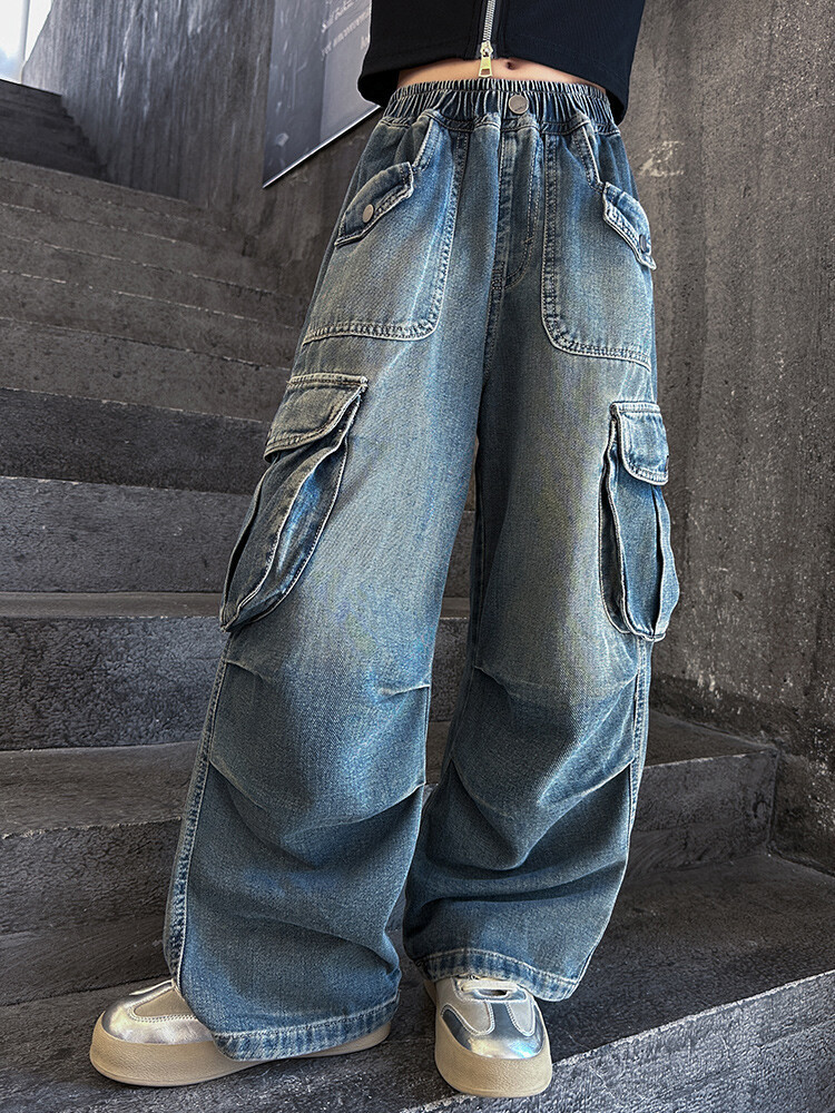 2025년 봄 가을 여아용 크로스보더 데님 팬츠, 중대형 아동용 트렌디하고 멋진 스트릿 댄스 바지, 여아용 와이드 팬츠 도매스토어 가기