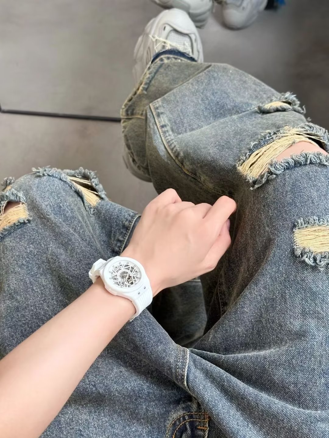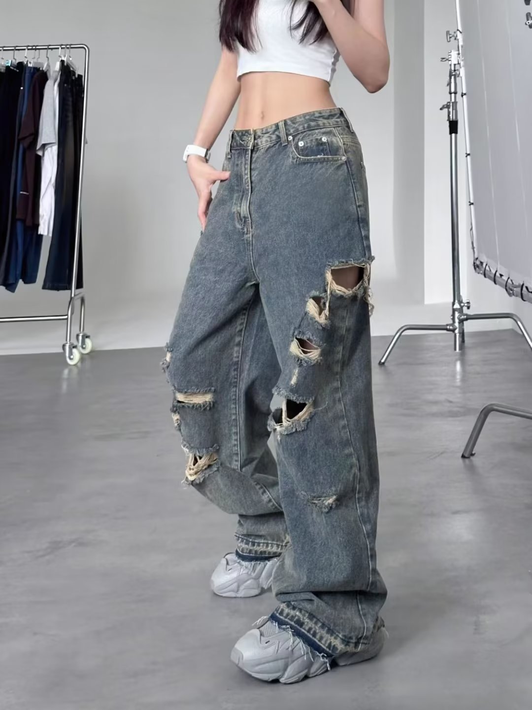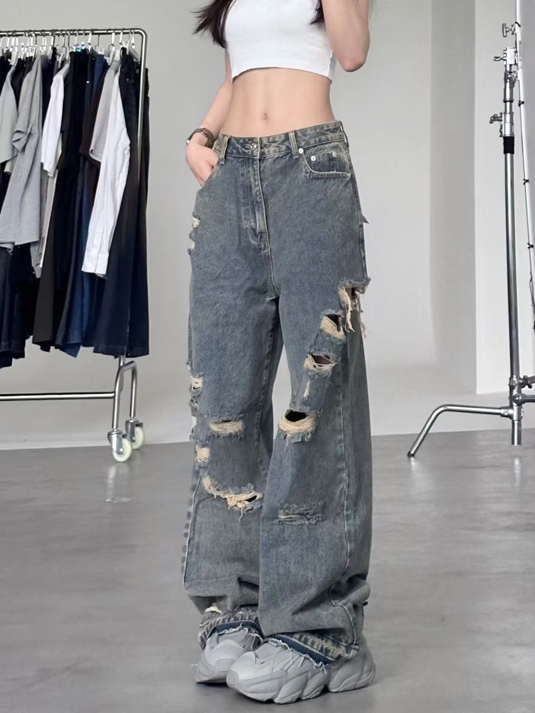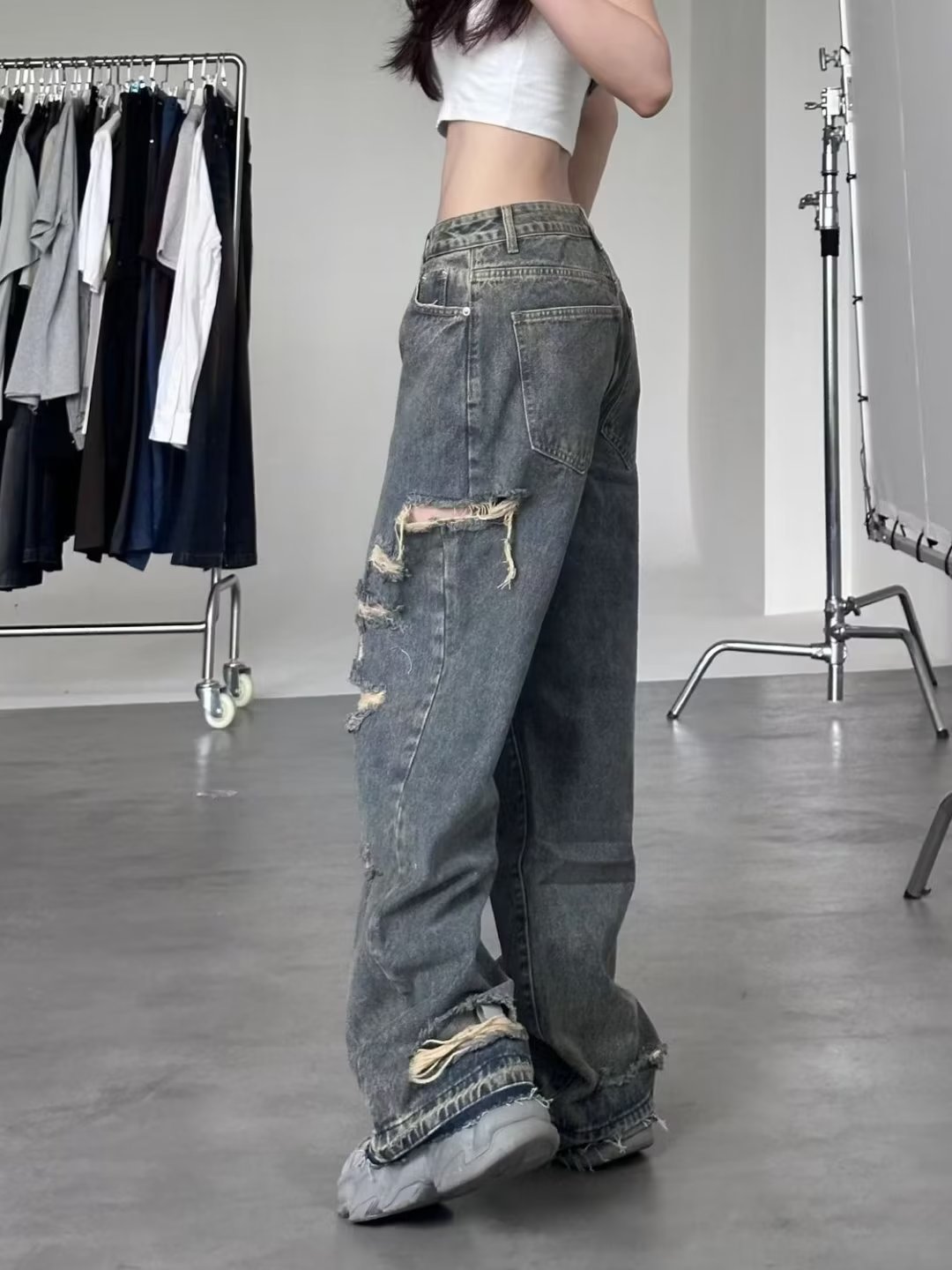 아메리칸 스타일 하이 스트리트 청바지 여성 한국 스타일 루즈 슬리밍 워시 와이드 레그 바지 하이 웨이스트 올드 리핑 스트레이트 팬츠