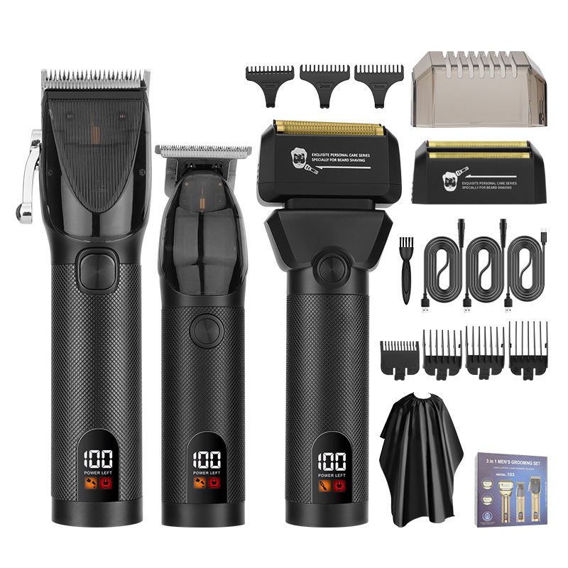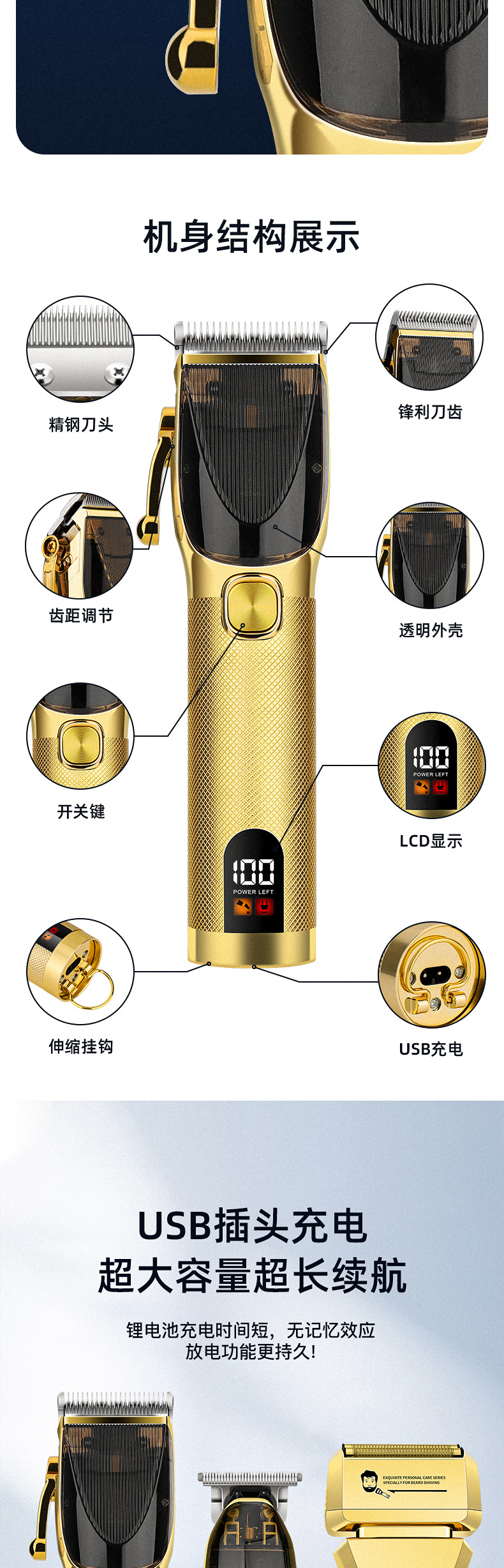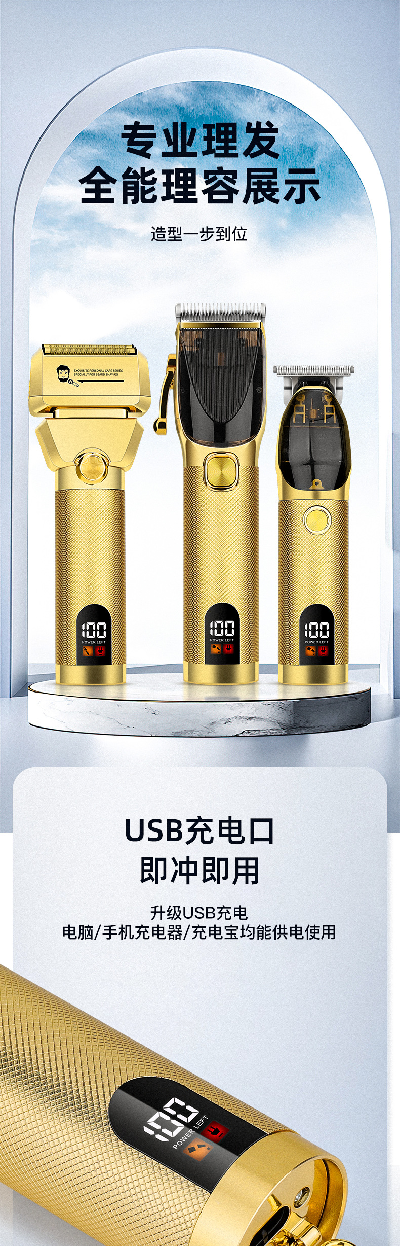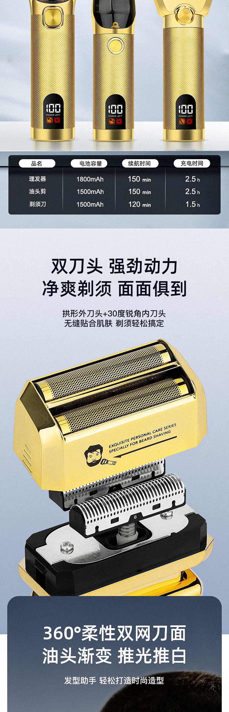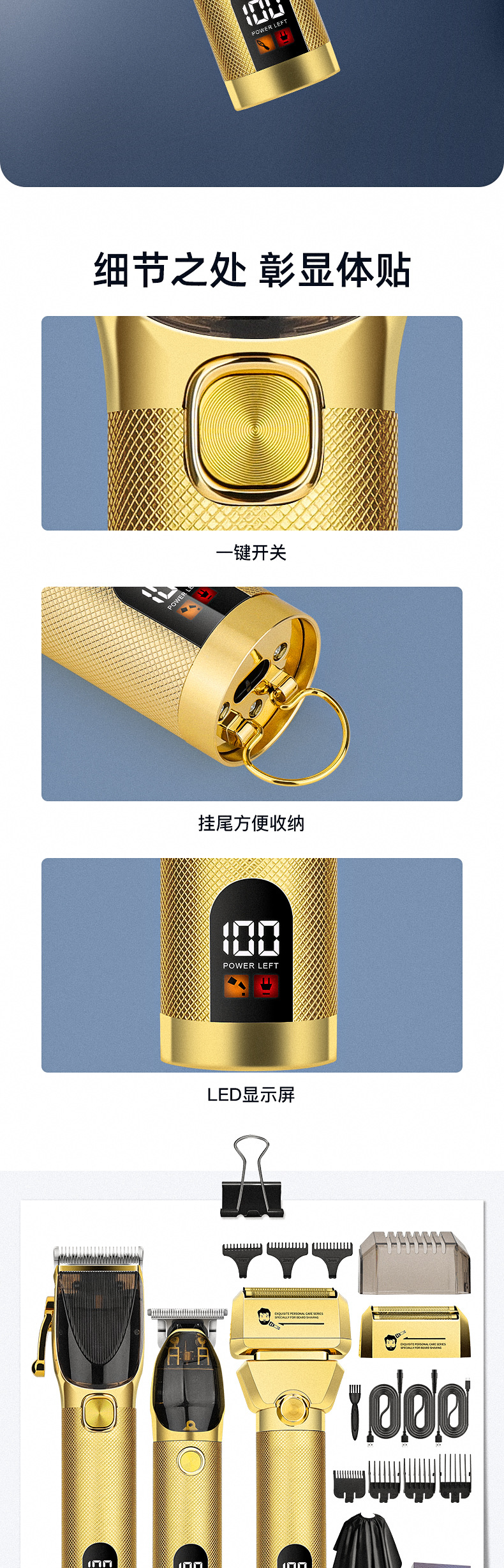 产品配件:专业理发器+雕刻理发器+往复式剃须刀+可更换剃须刀头+剃须刀刀头保护盖+大限位梳*4+雕刻限位梳*3+USB充电线*3+梳子+清洁刷+英文说明书.