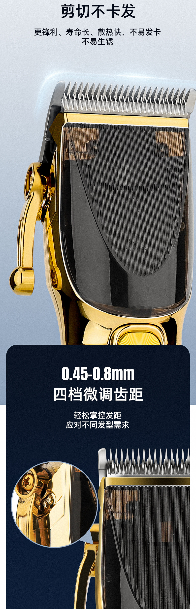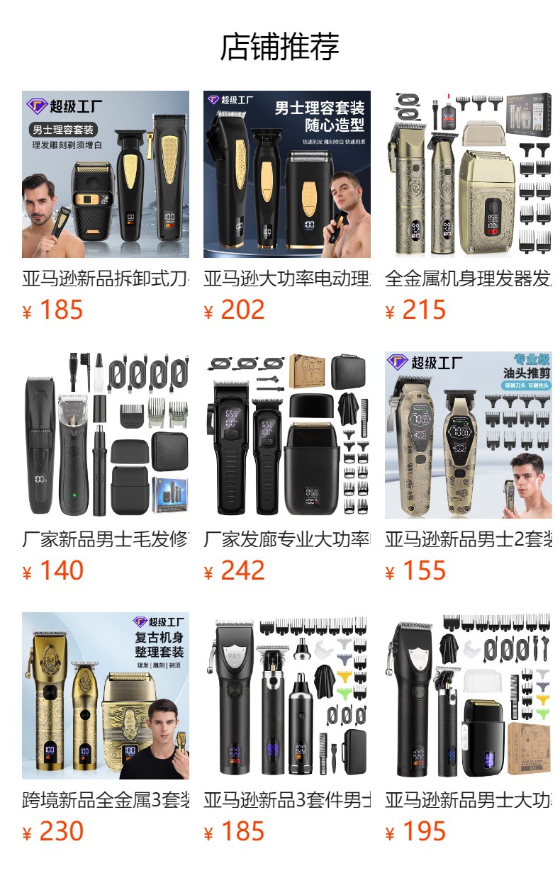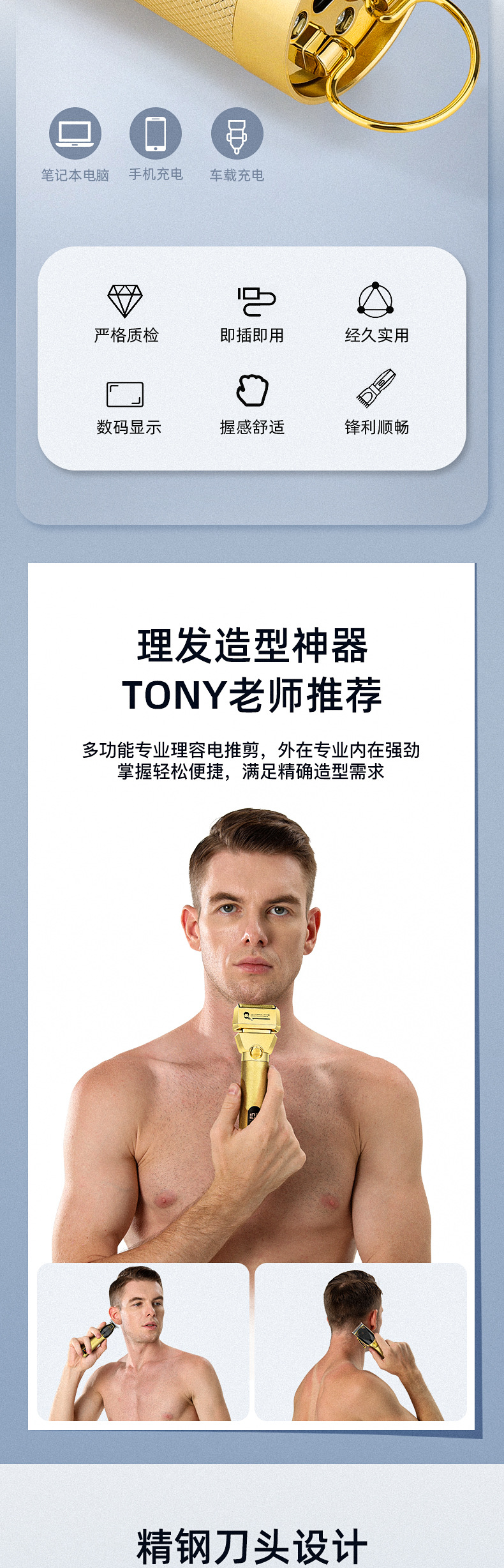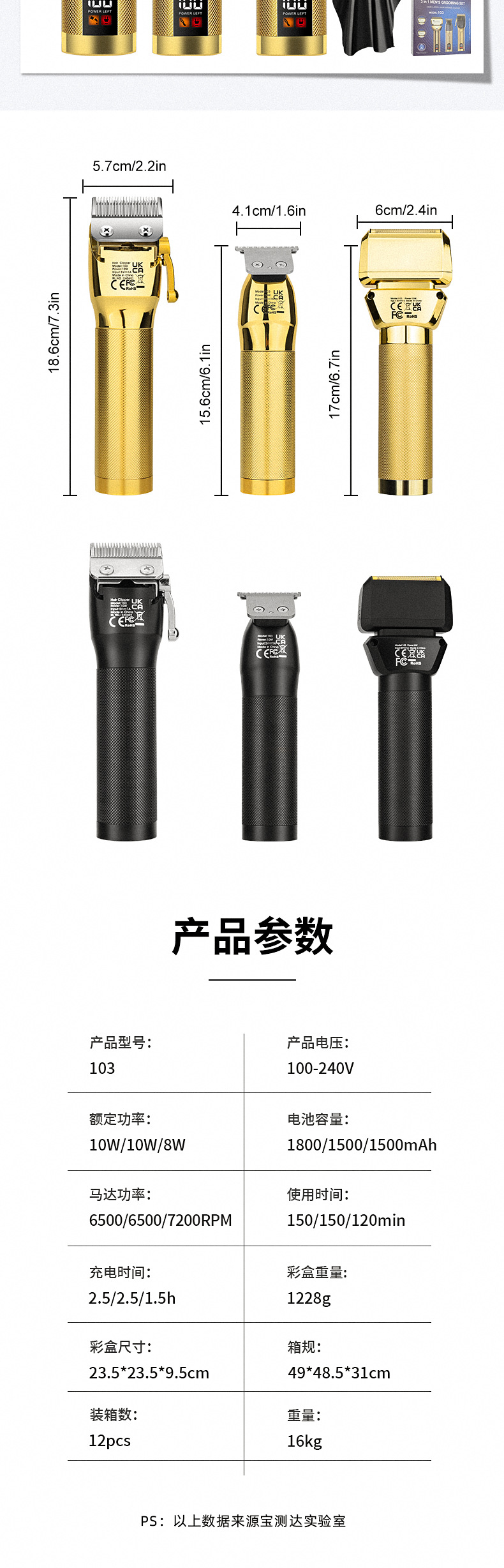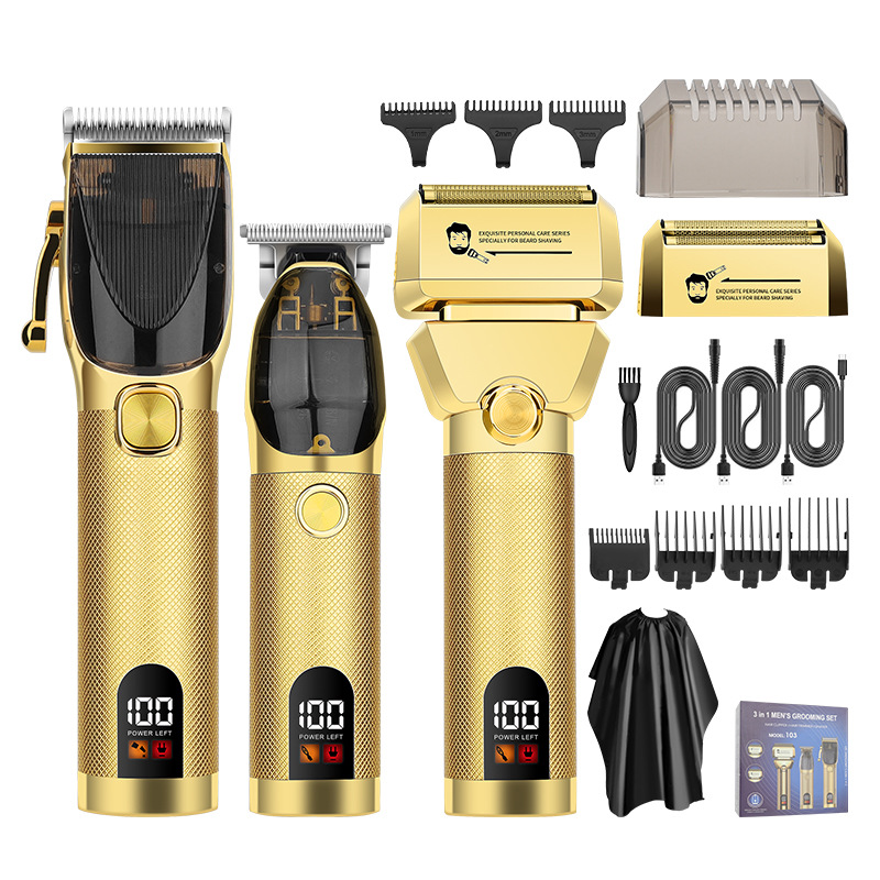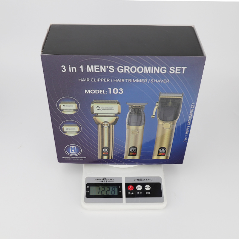 产品配件:专业理发器+雕刻理发器+往复式剃须刀+可更换剃须刀头+剃须刀刀头保护盖+大限位梳*4+雕刻限位梳*3+USB充电线*3+梳子+清洁刷+英文说明书.