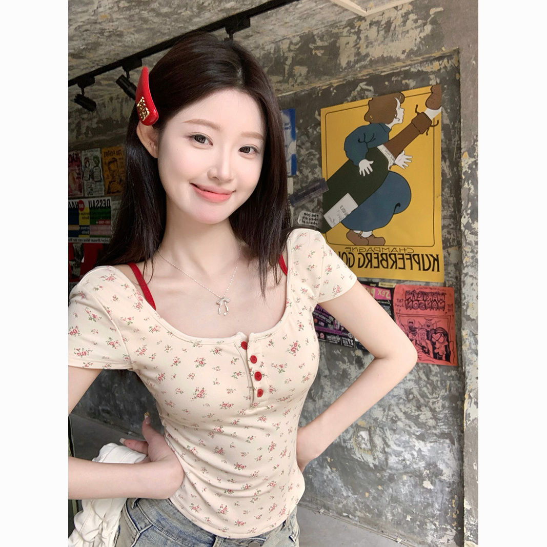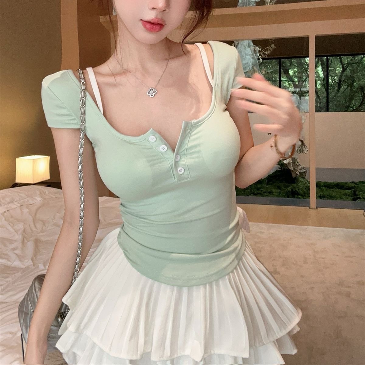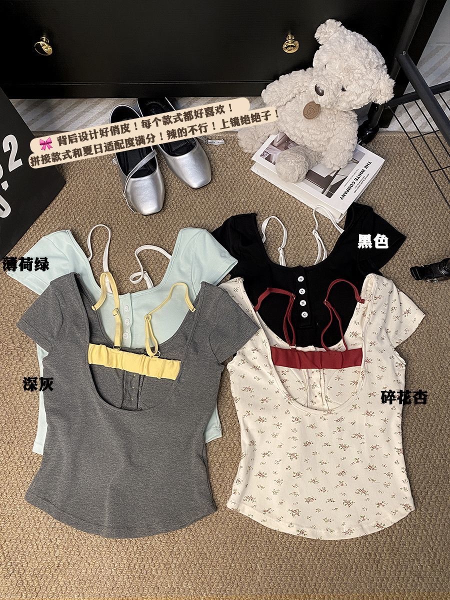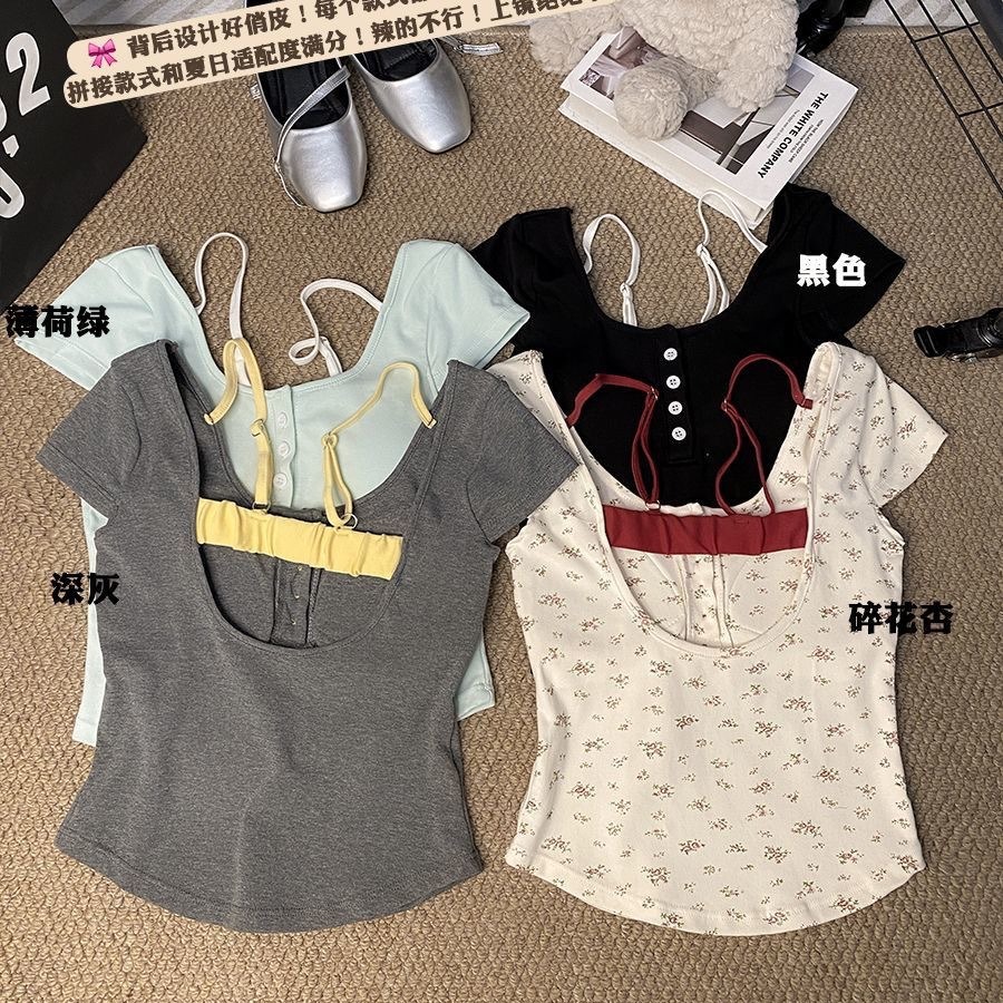 틈새 순수한 욕망 달콤한 인쇄 콘트라스트 슬링 백리스 페이크 2 피스 티셔츠 탑 여성용 스파이스 걸 여름 가슴 패드와 올매치