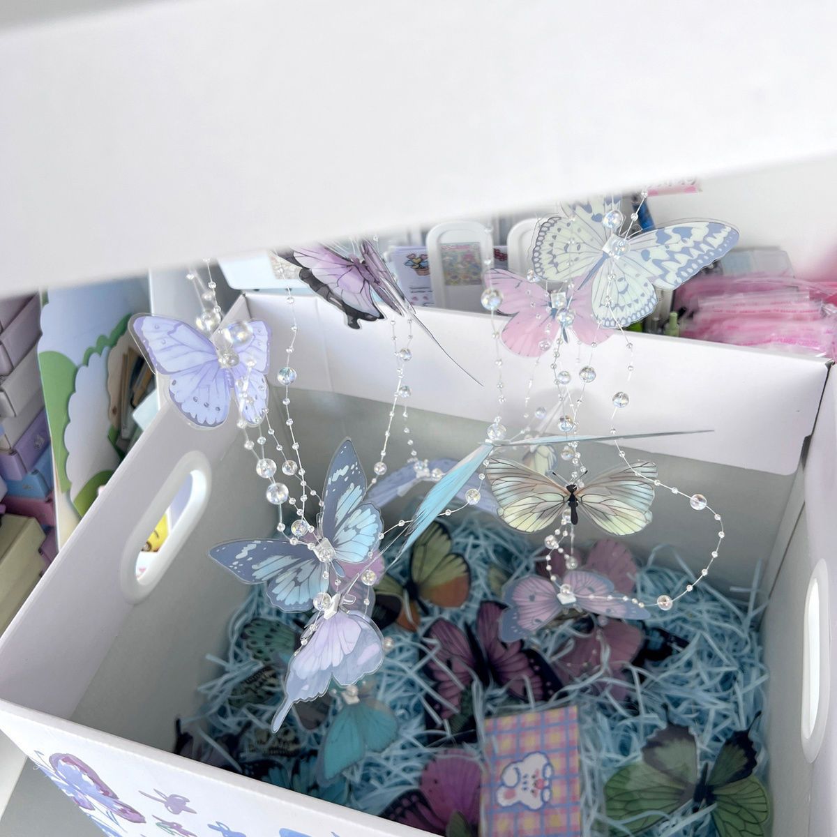 • 1세트 [나비 선물 상자 1개 + 나비 36개 + 후크 6개 + 물고기 구슬 체인 6m + 핑크 라피아 1팩]