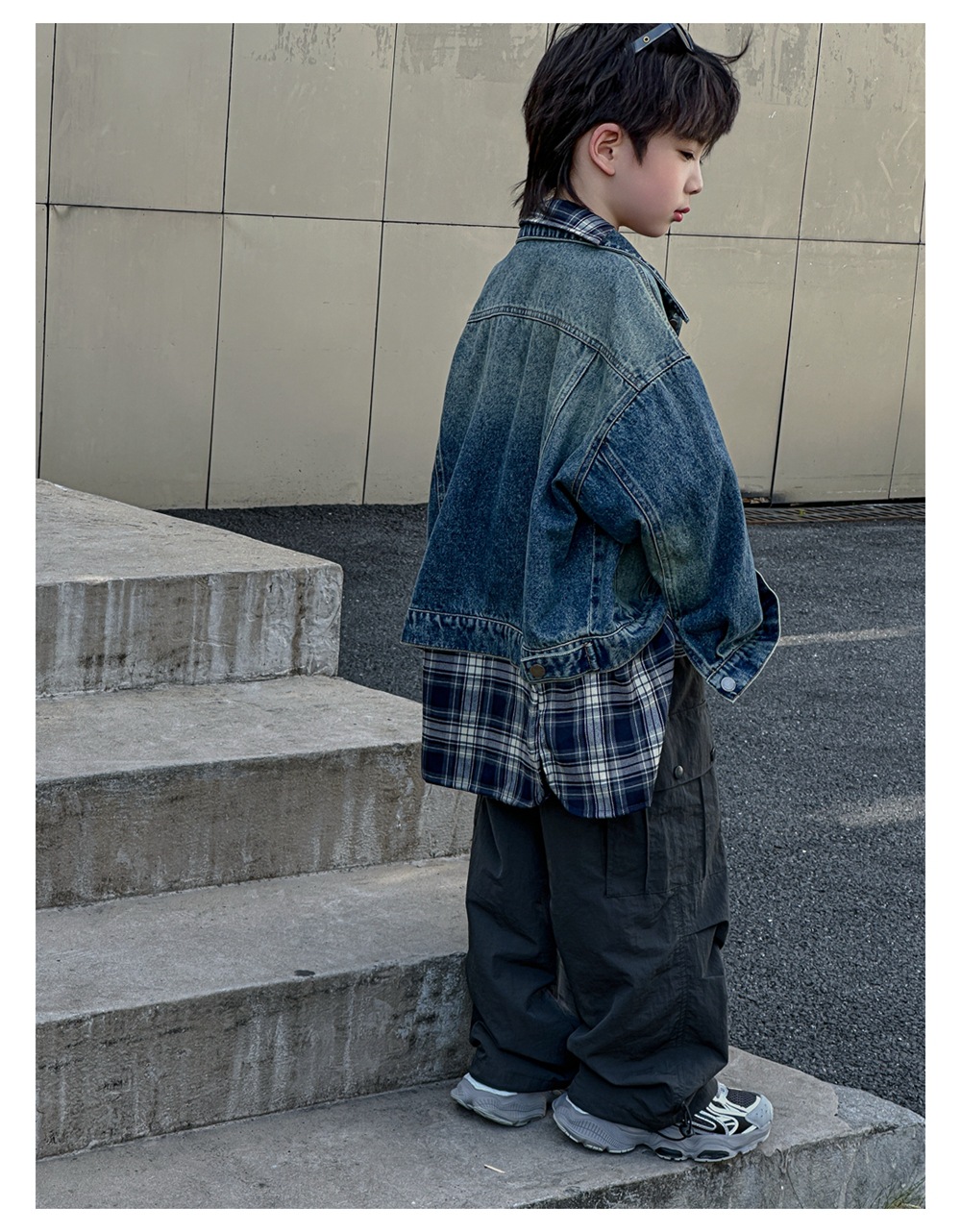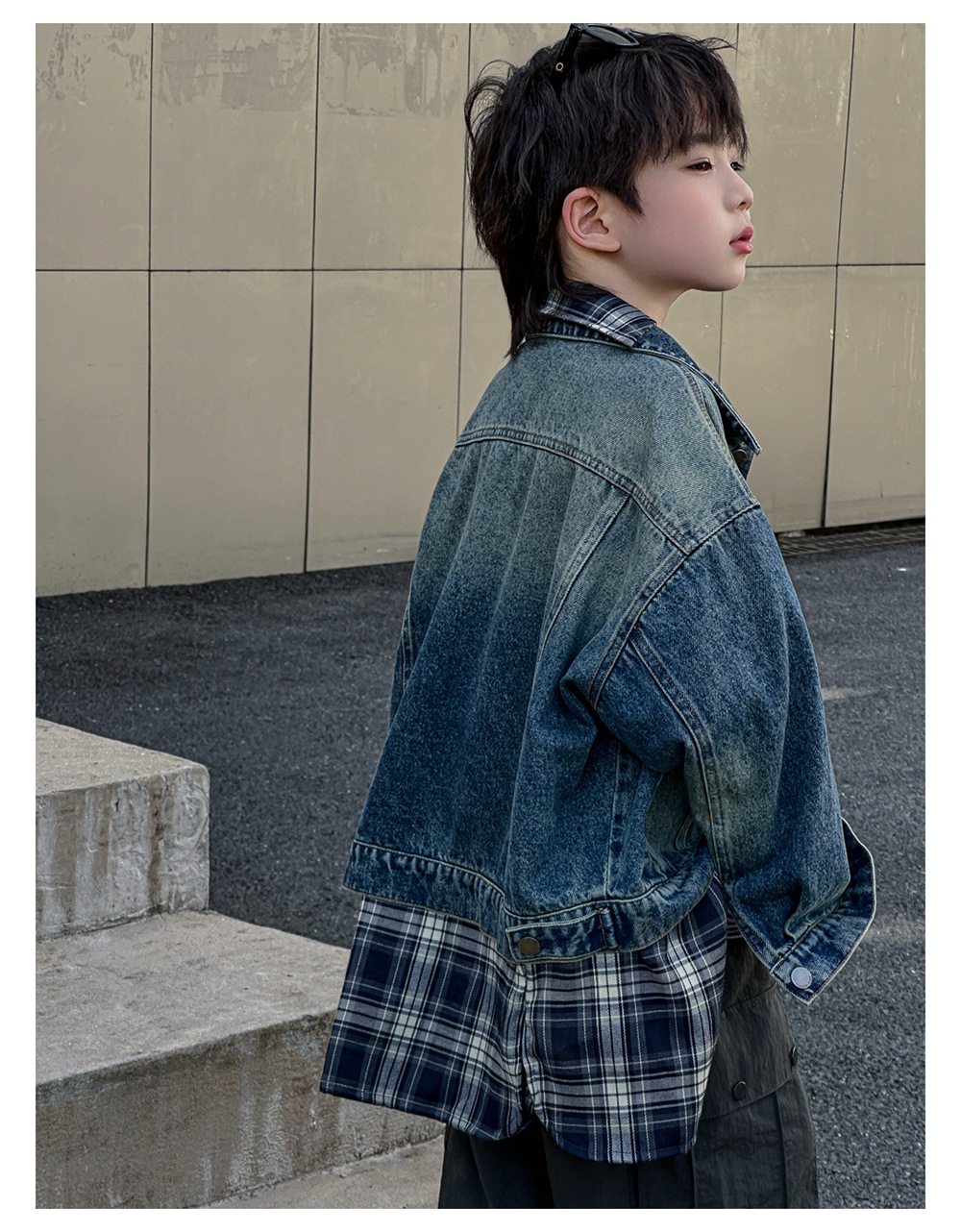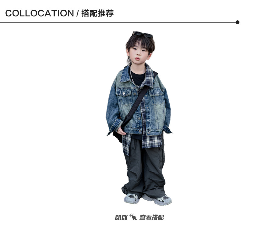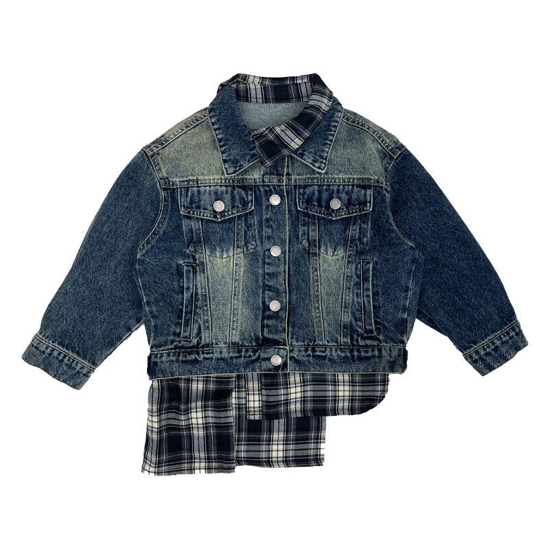 Xiner 2024 가을 새로운 어린이 격자 무늬 가짜 투피스 데님 재킷 소년 데님 재킷 탑스토어 가기