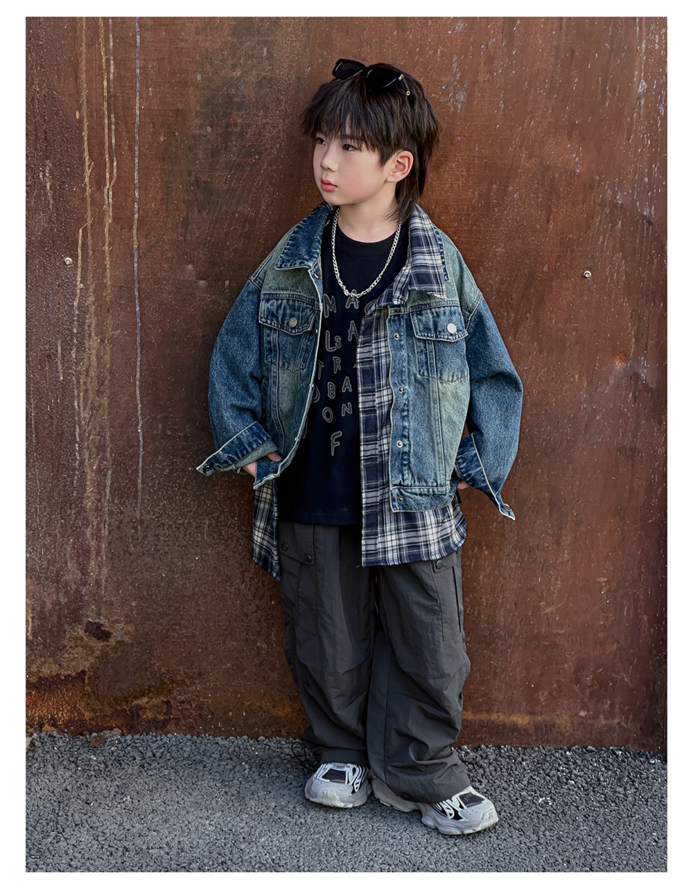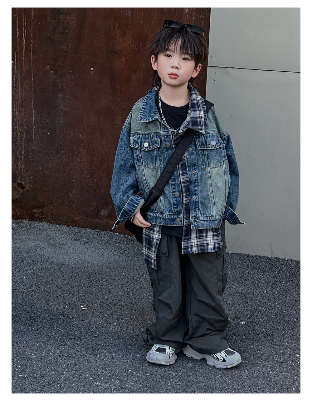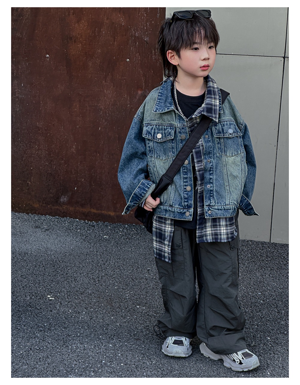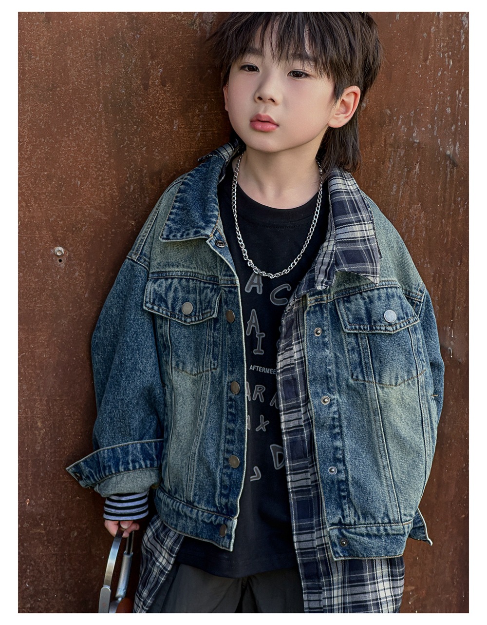 Xiner 2024 가을 새로운 어린이 격자 무늬 가짜 투피스 데님 재킷 소년 데님 재킷 탑