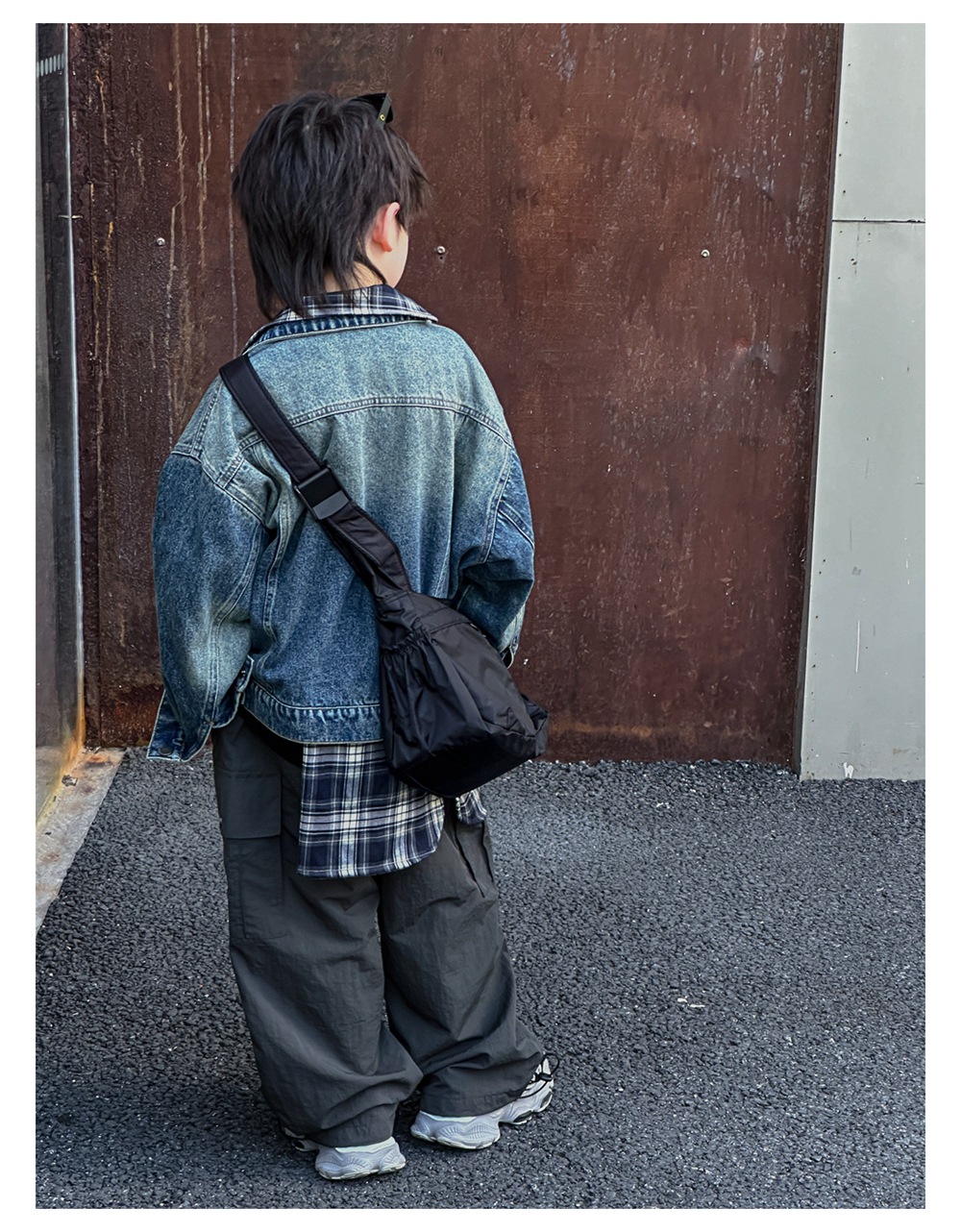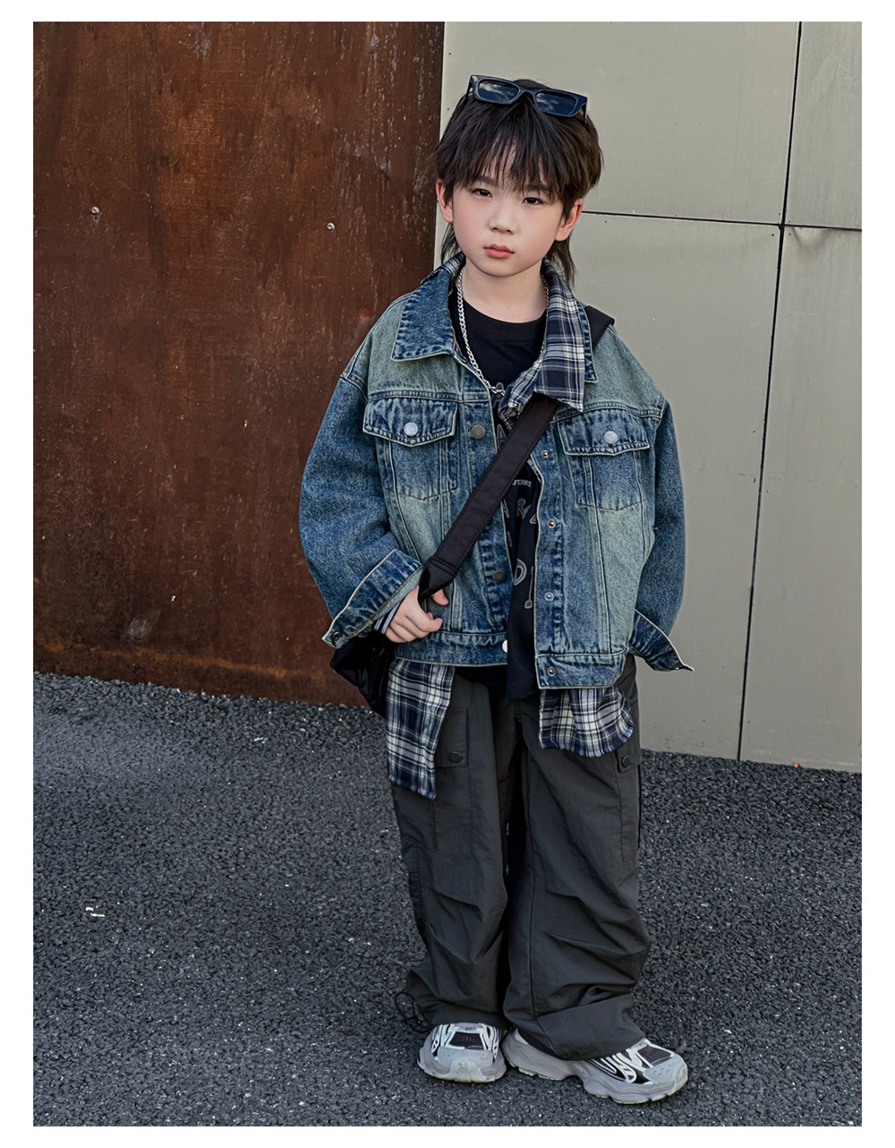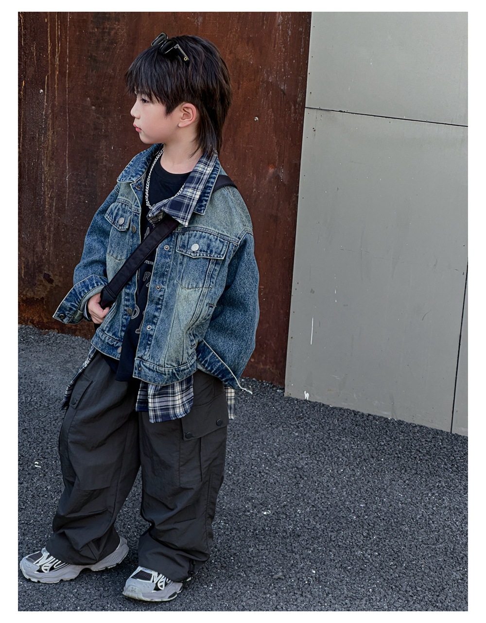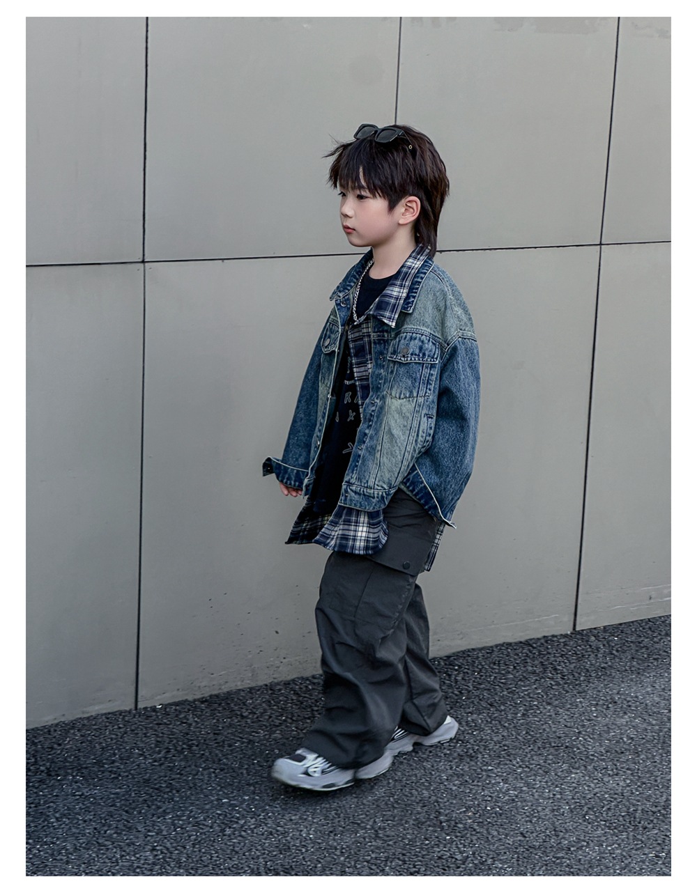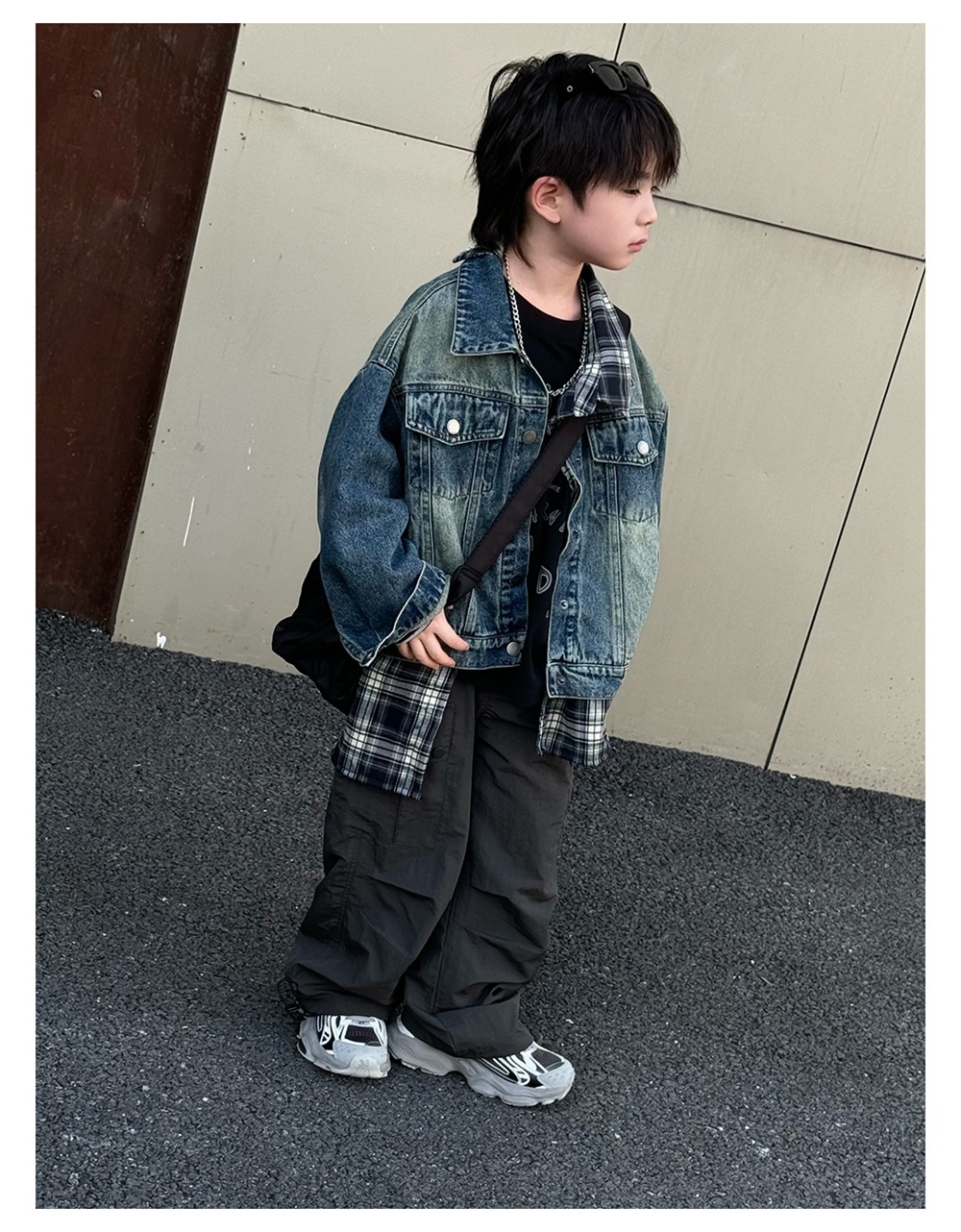 Xiner 2024 가을 새로운 어린이 격자 무늬 가짜 투피스 데님 재킷 소년 데님 재킷 탑
