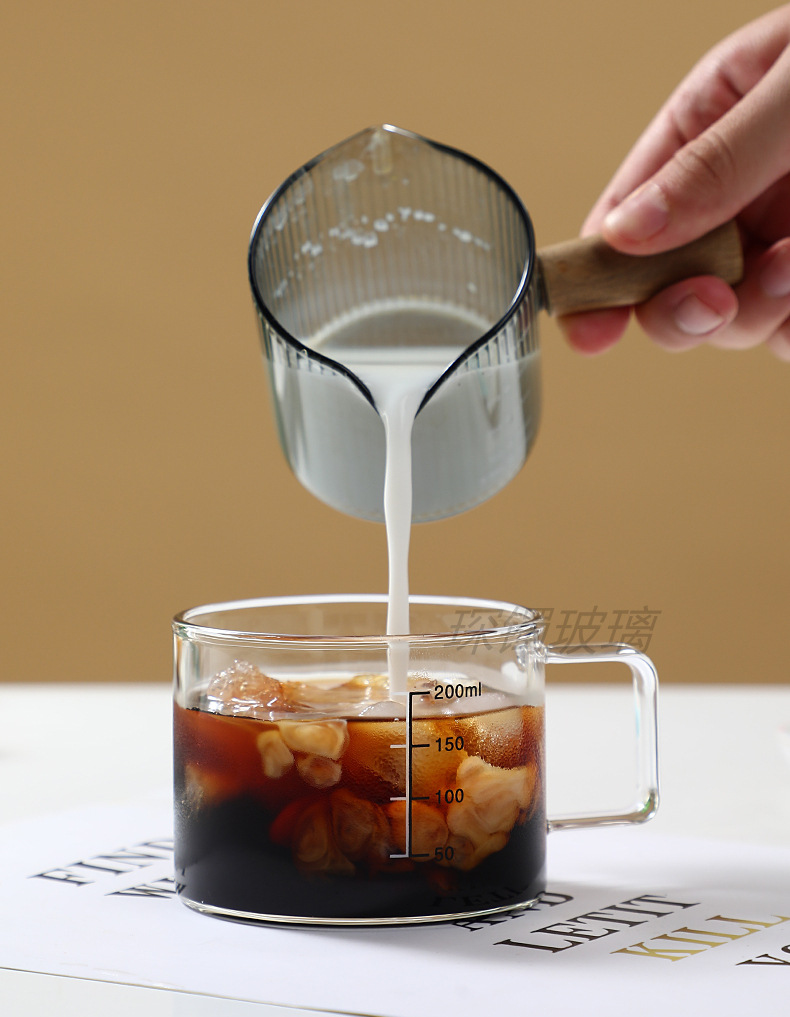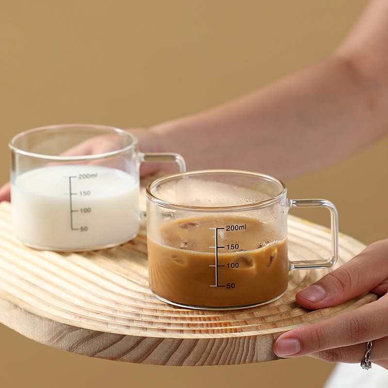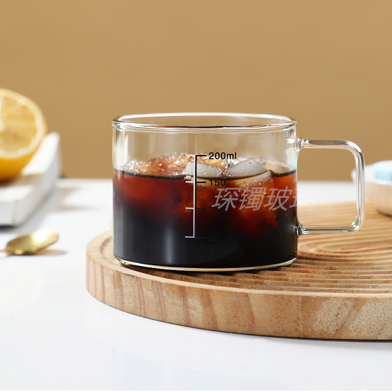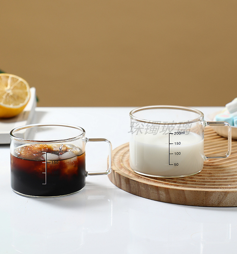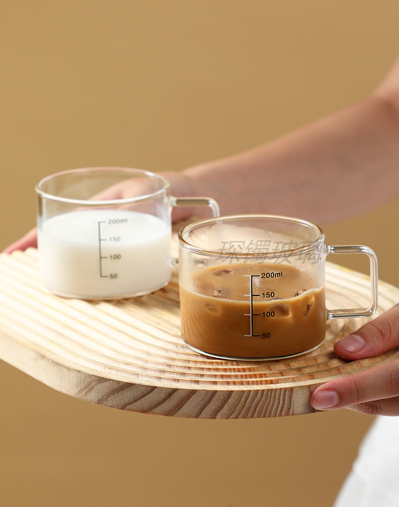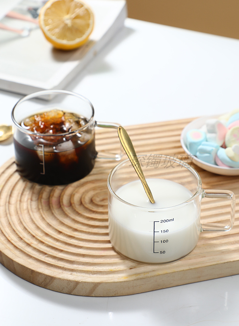 유리 컵 우유 컵 커피 컵 두꺼운 고온 저항하는 투명한 물 컵 손잡이와 숟가락을 가진 가정용 물 컵
