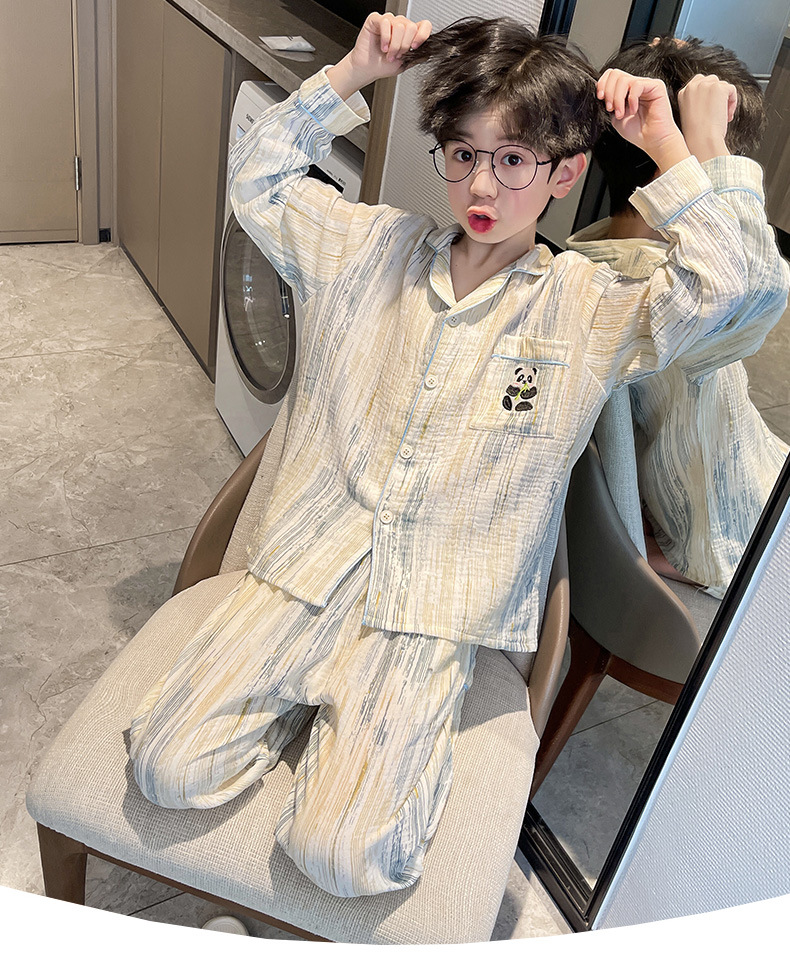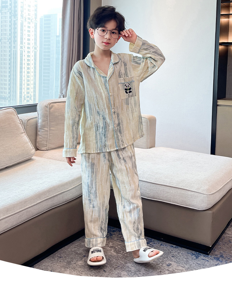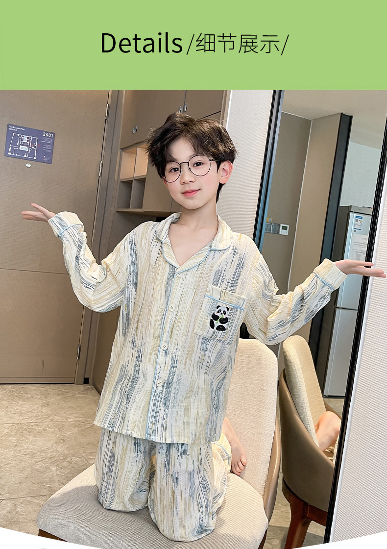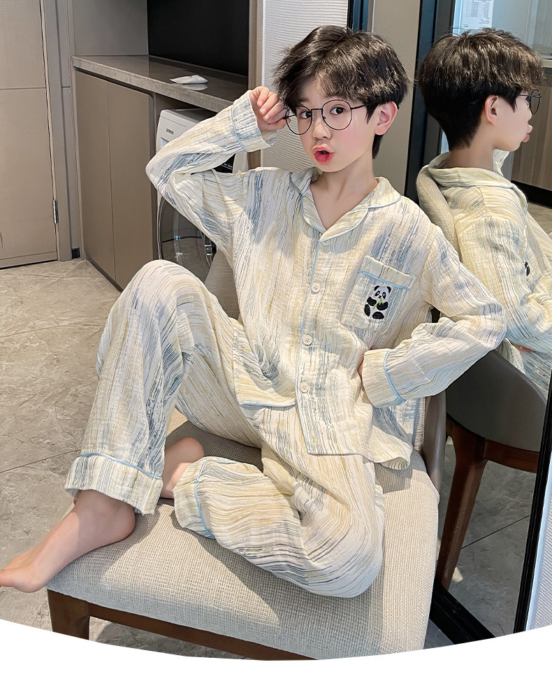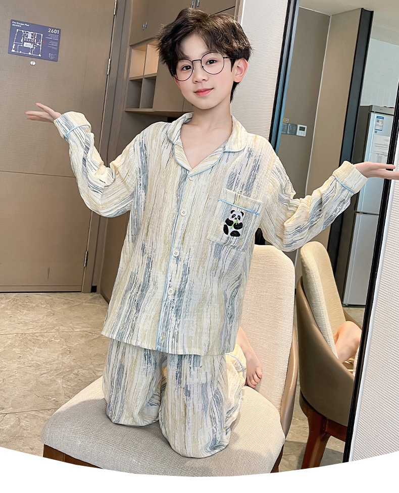 남자들의 긴 소매 셔츠 홈 의류 세트 가을 뉴 2024 미들 빅 보이즈 웨스턴 스타일 팬더 자수 파자마