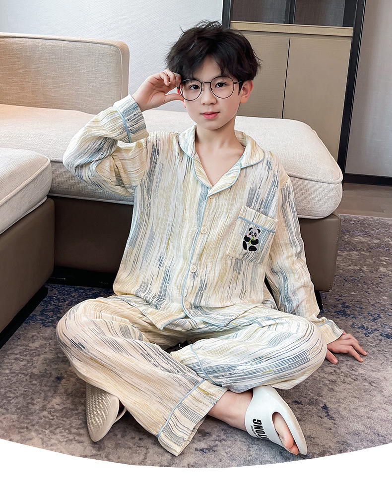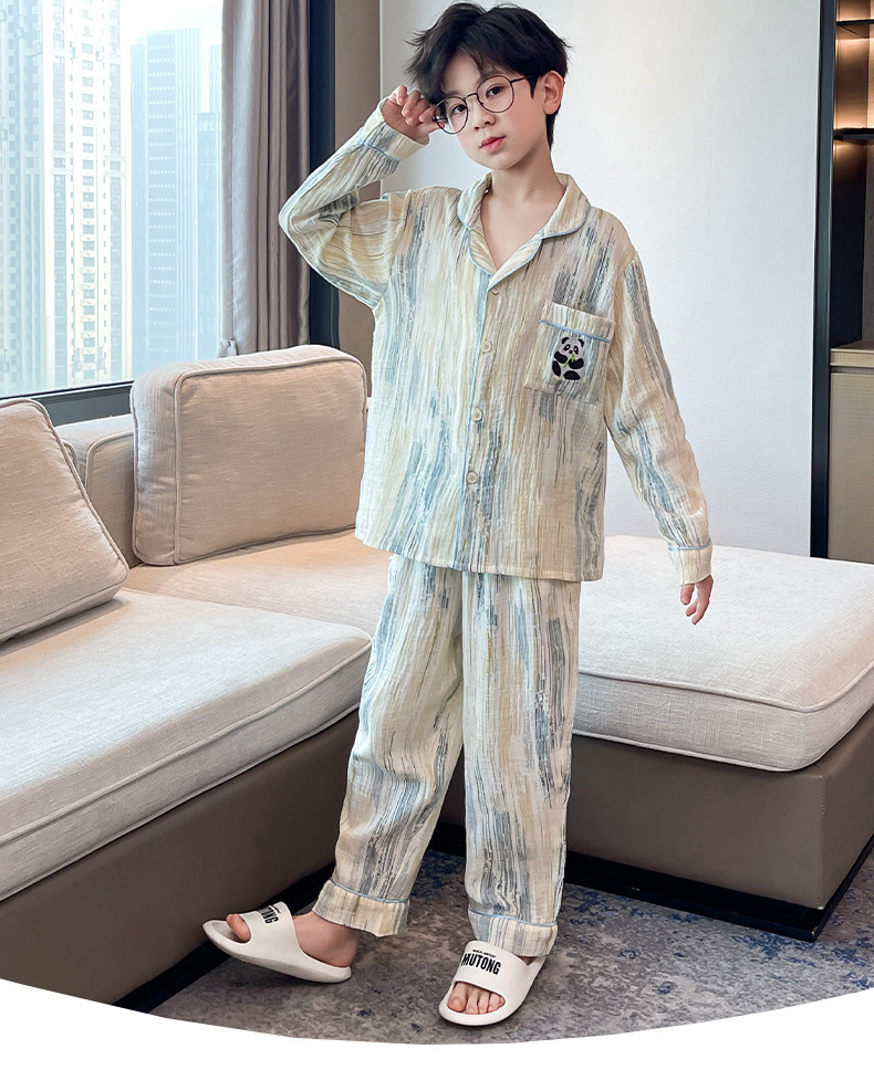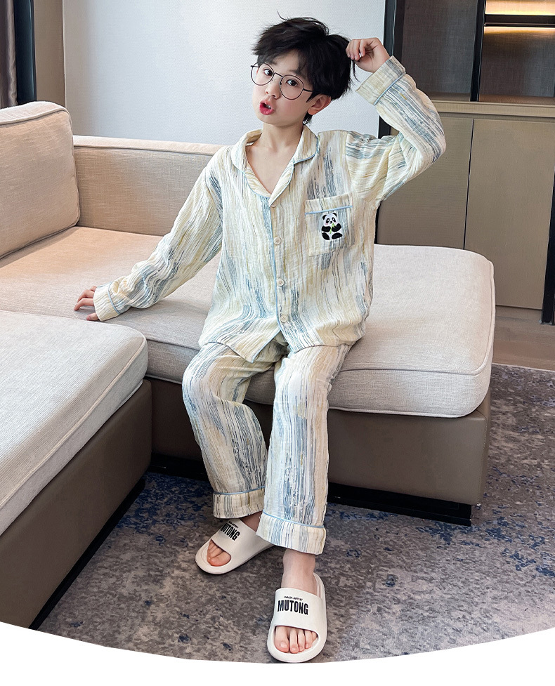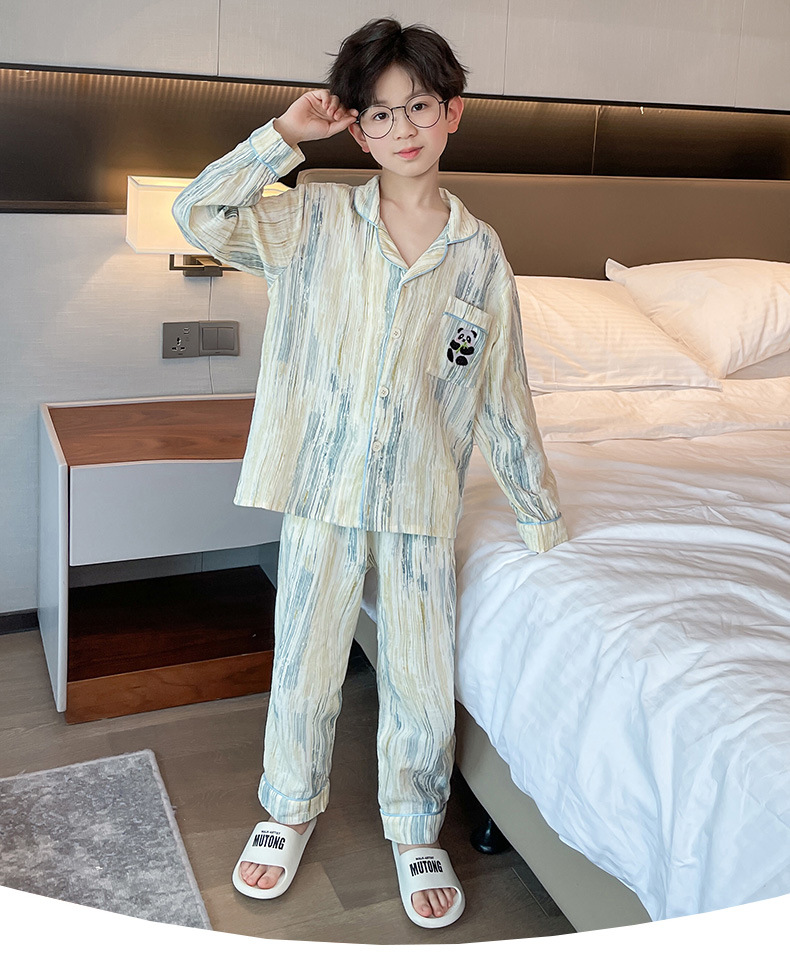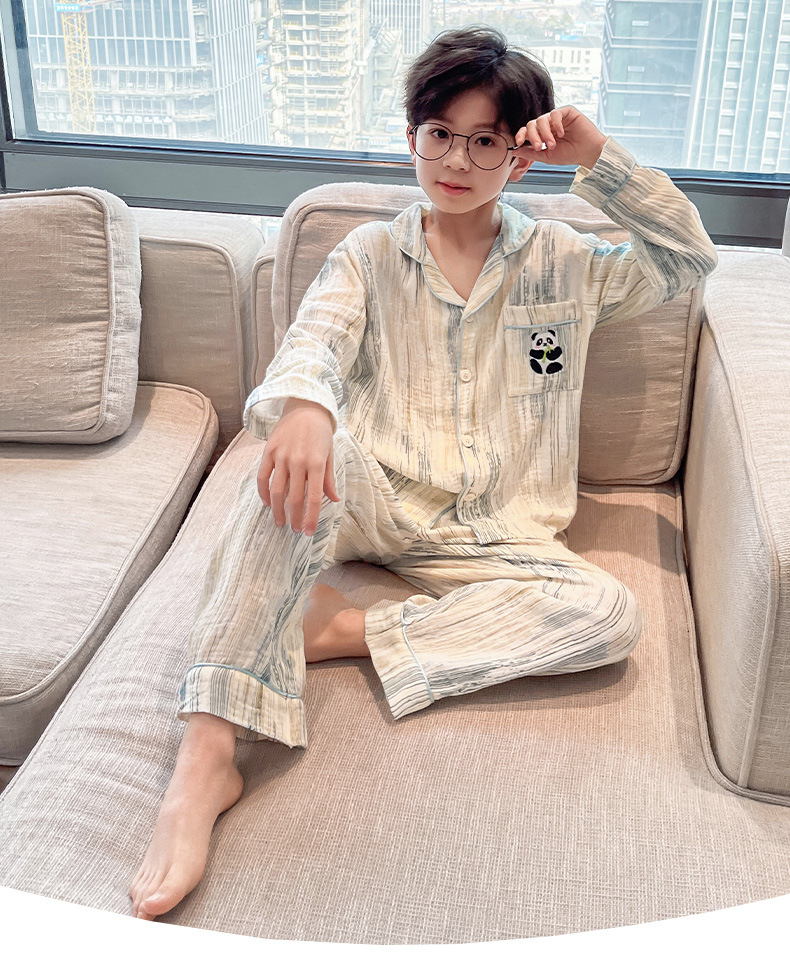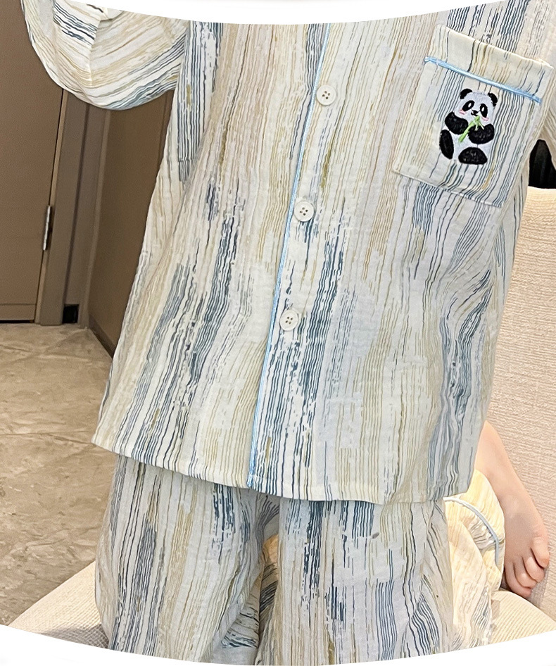 남자들의 긴 소매 셔츠 홈 의류 세트 가을 뉴 2024 미들 빅 보이즈 웨스턴 스타일 팬더 자수 파자마