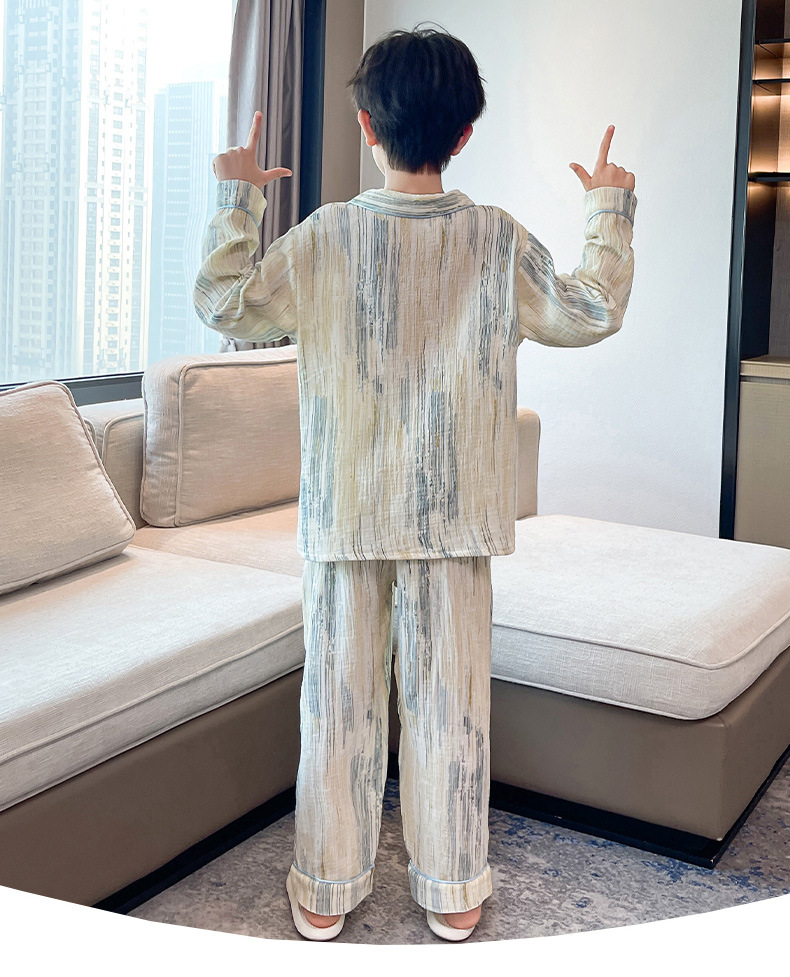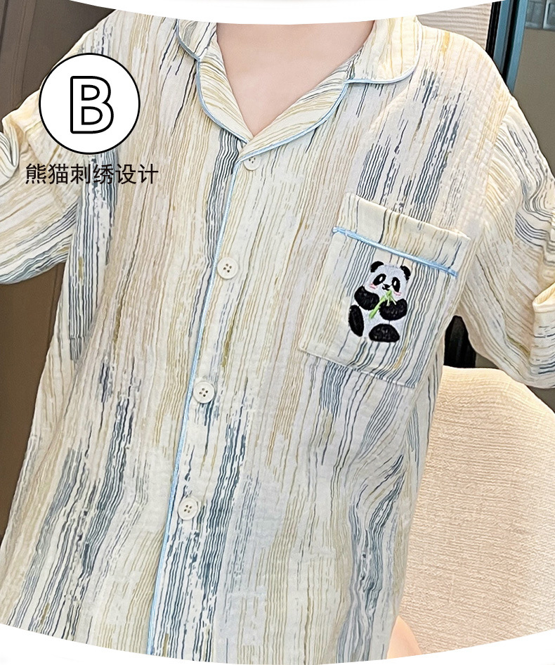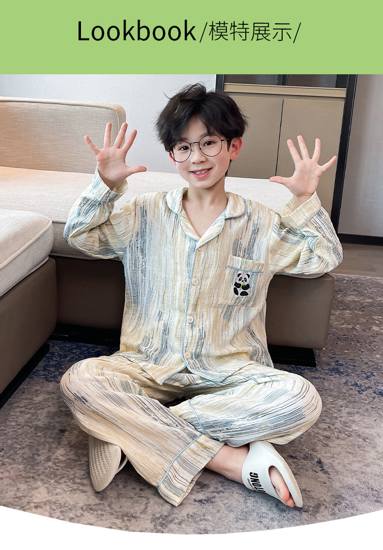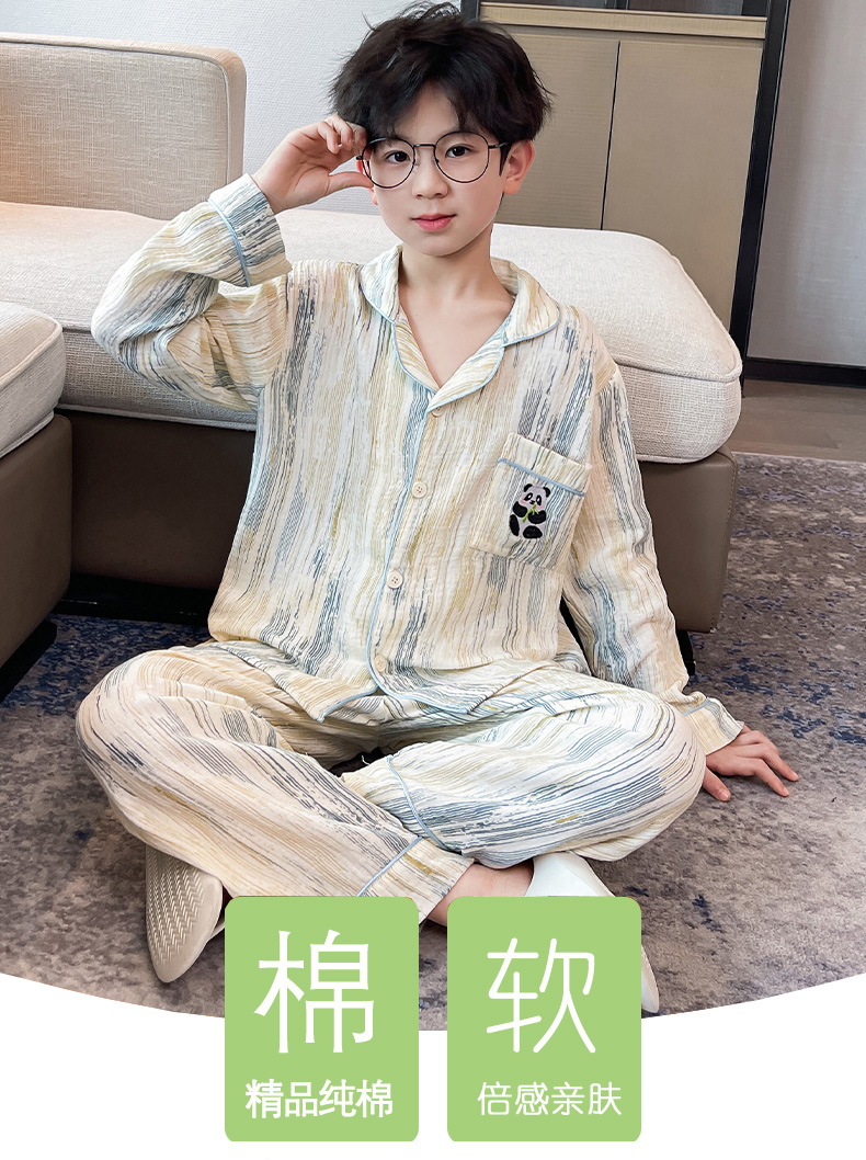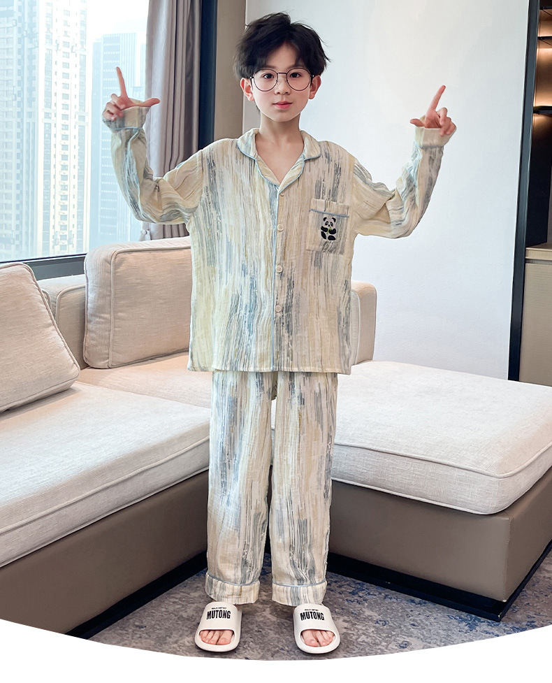 남자들의 긴 소매 셔츠 홈 의류 세트 가을 뉴 2024 미들 빅 보이즈 웨스턴 스타일 팬더 자수 파자마