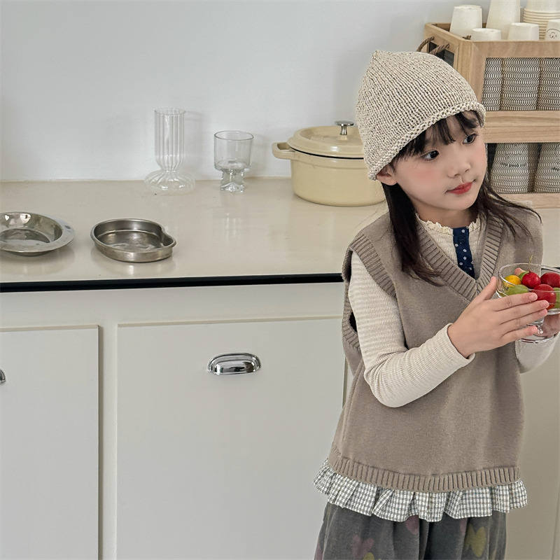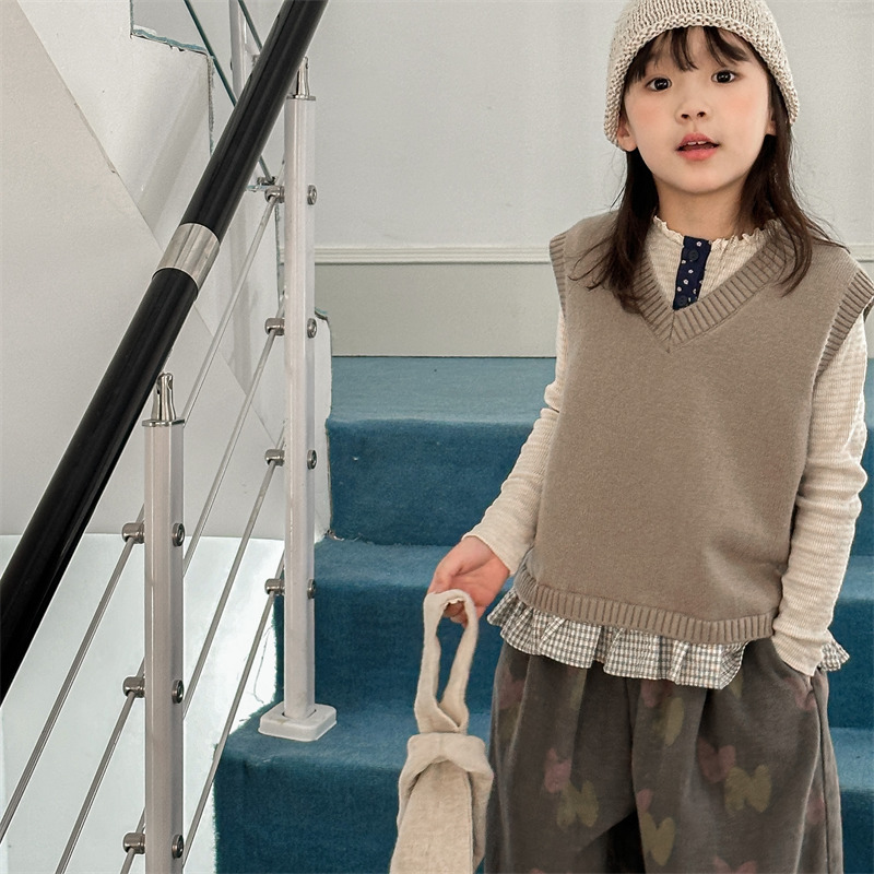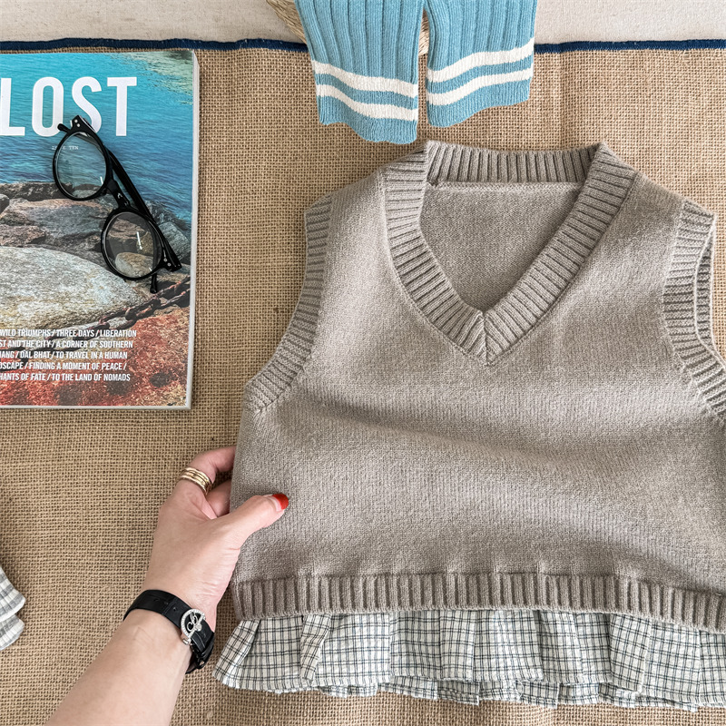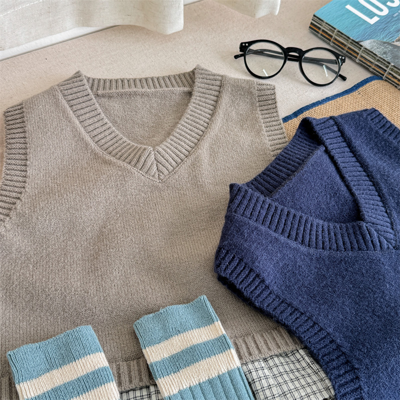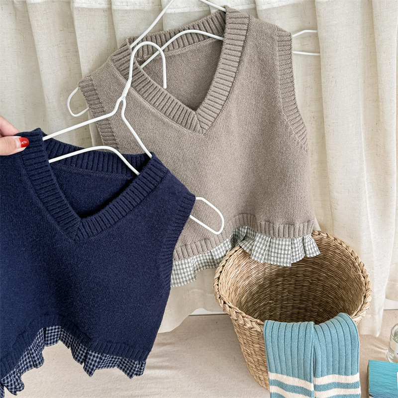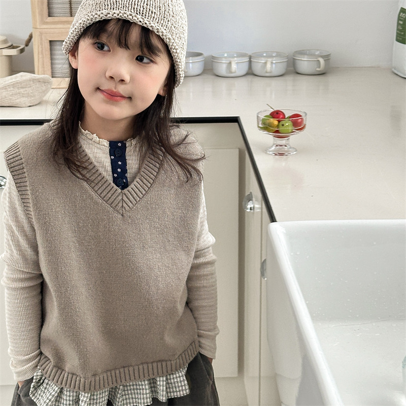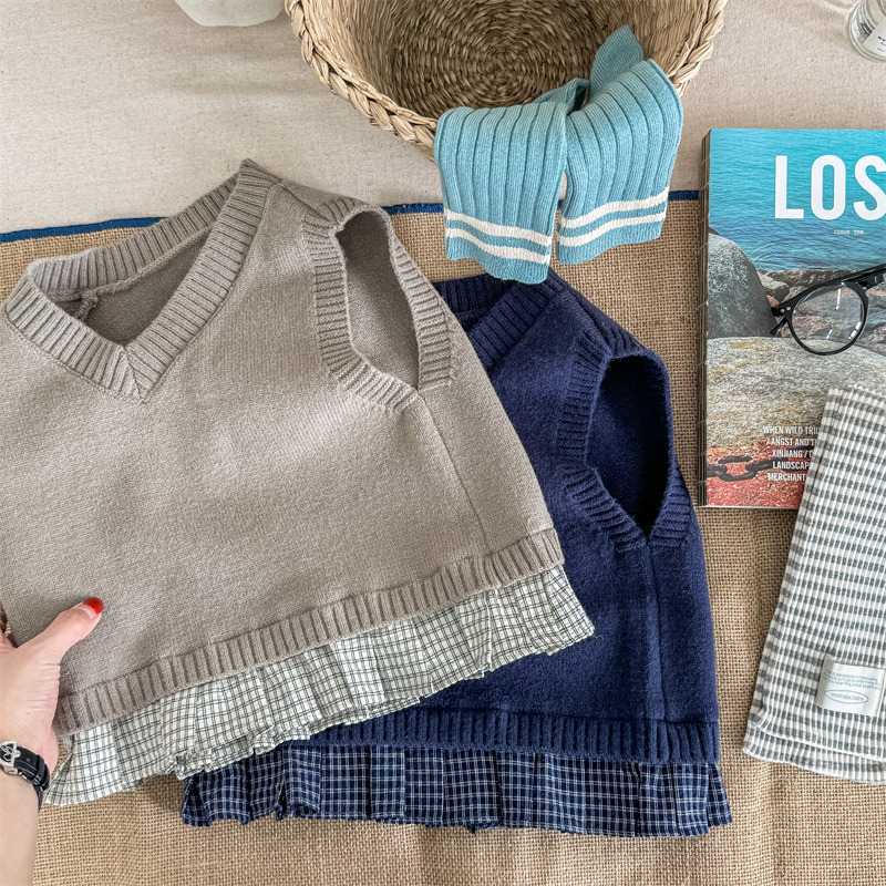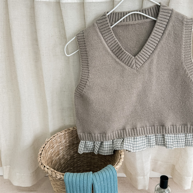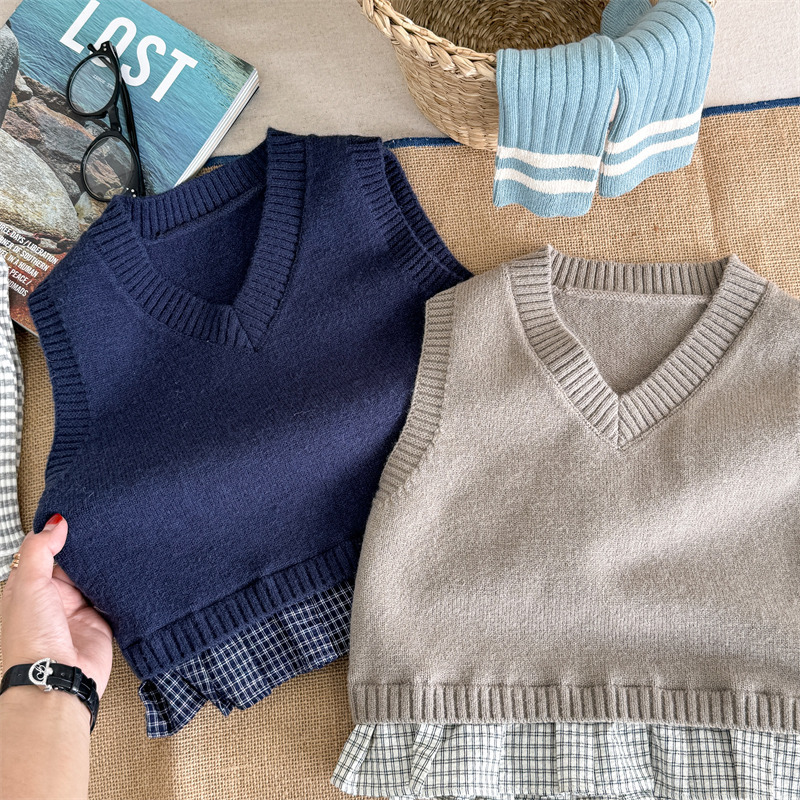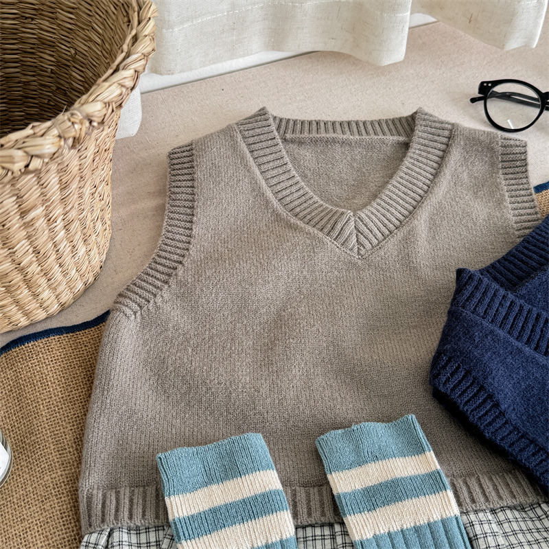 어린이 가을 양모 조끼 소녀 영국 머리 격자 무늬 니트 웨이스트 코트 아카데믹 스타일 풀오버 V-넥 조끼