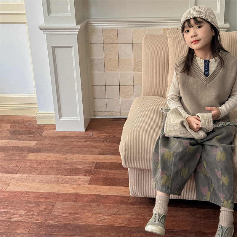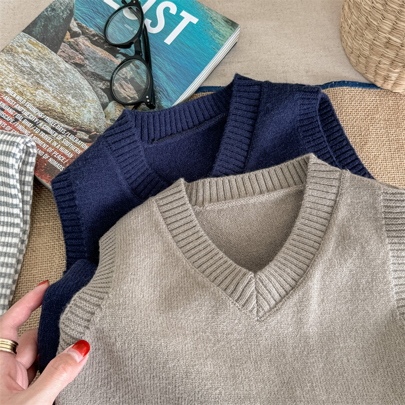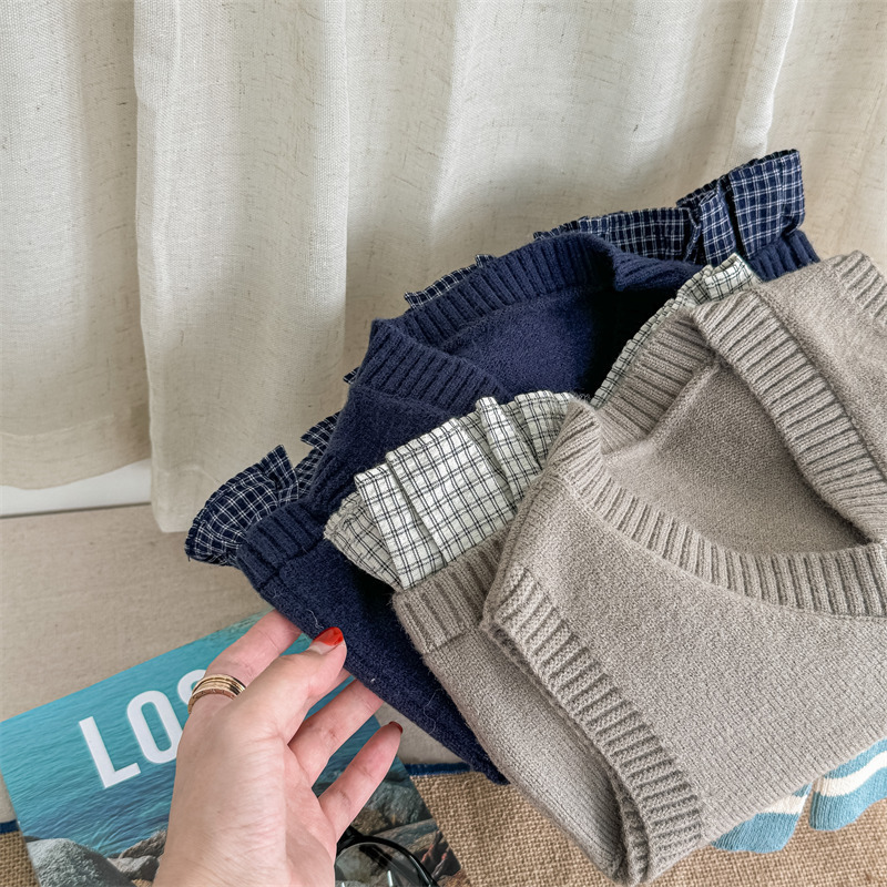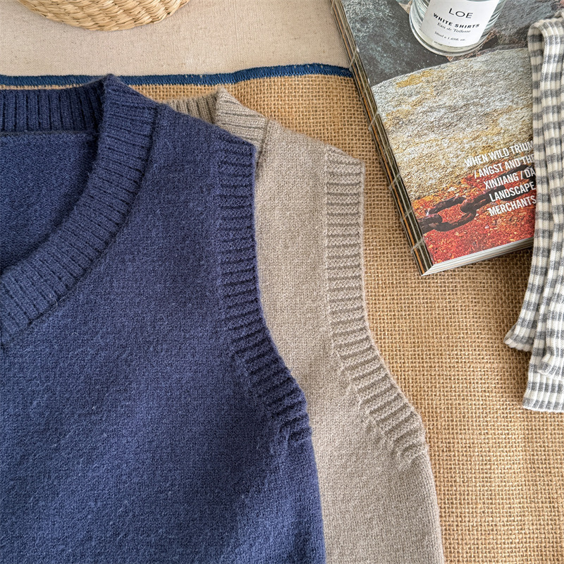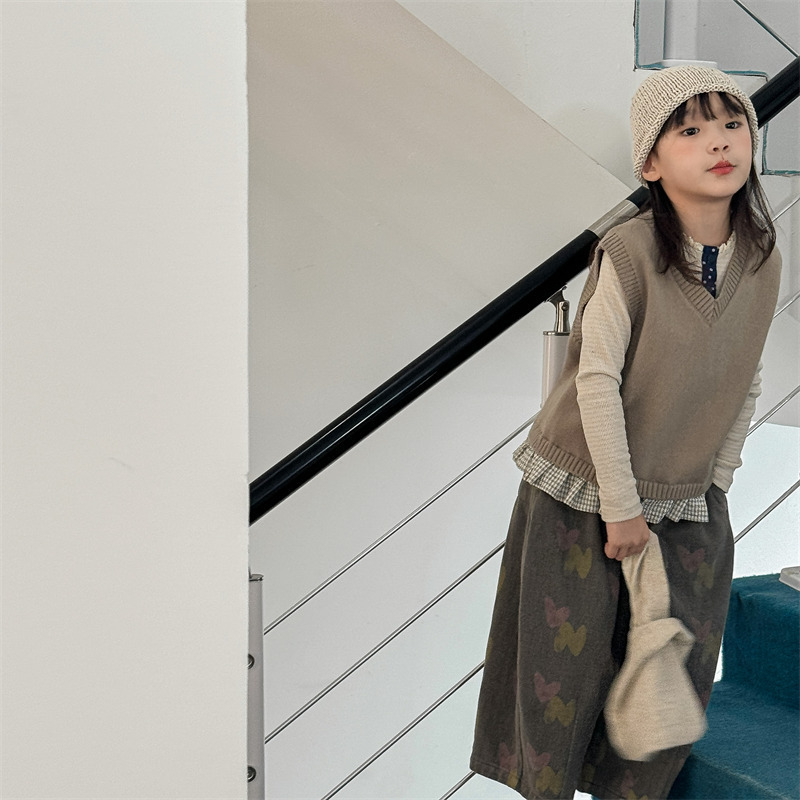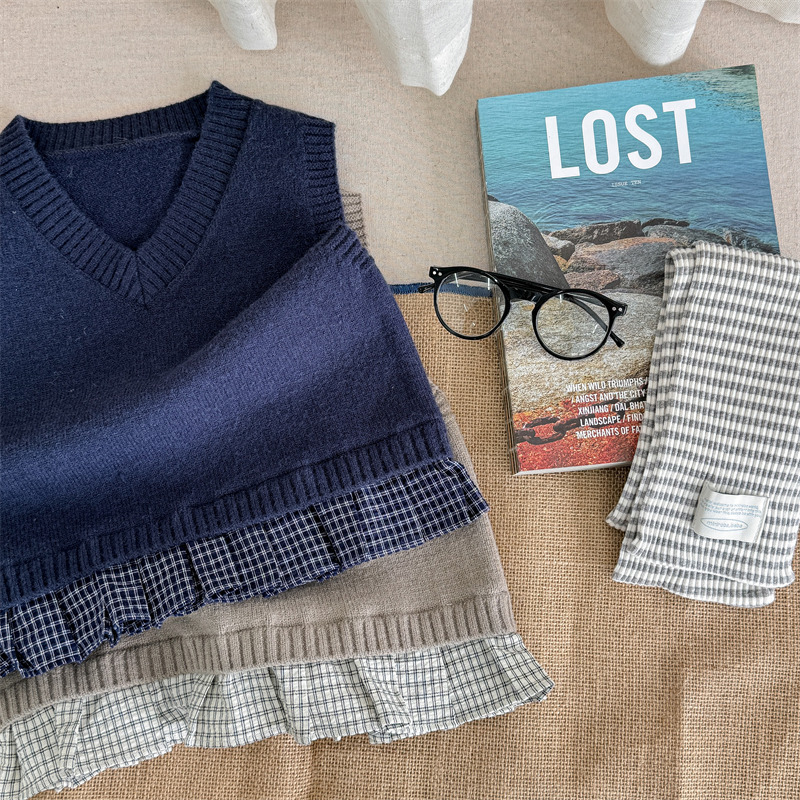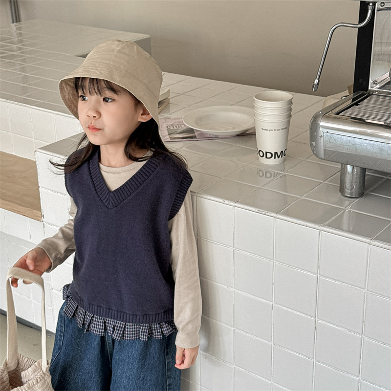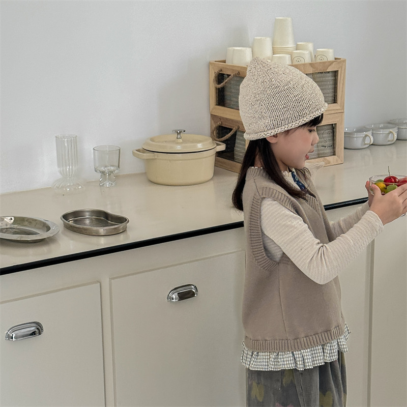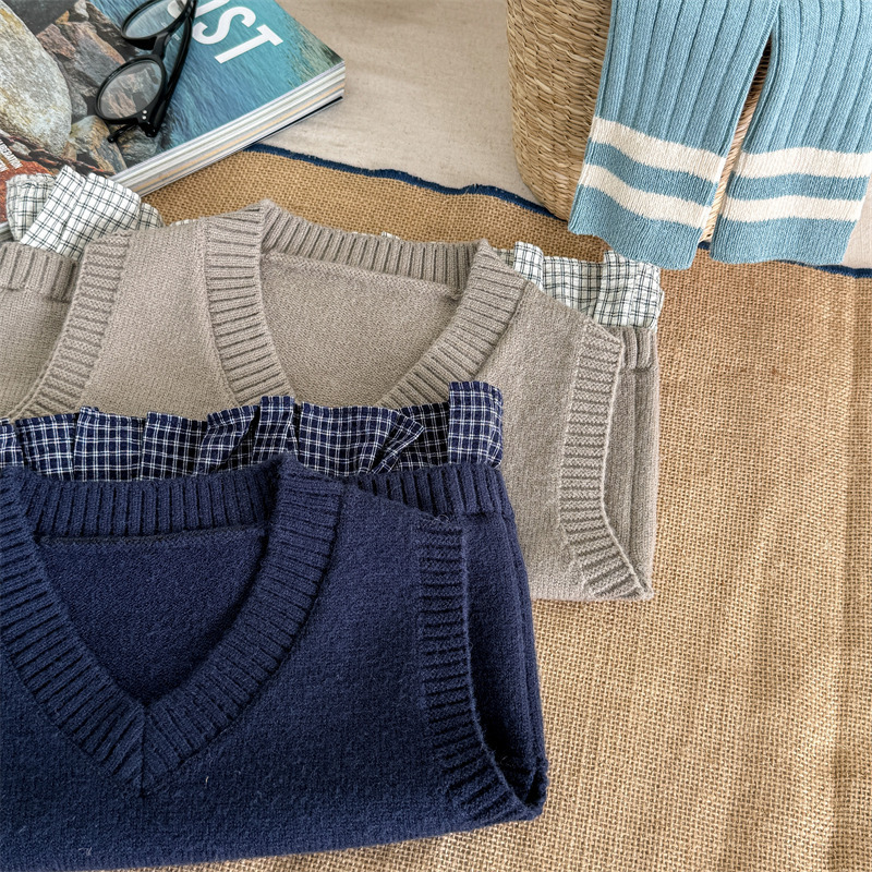 어린이 가을 양모 조끼 소녀 영국 머리 격자 무늬 니트 웨이스트 코트 아카데믹 스타일 풀오버 V-넥 조끼