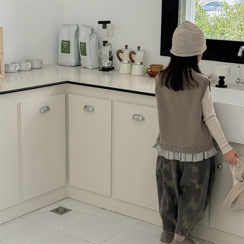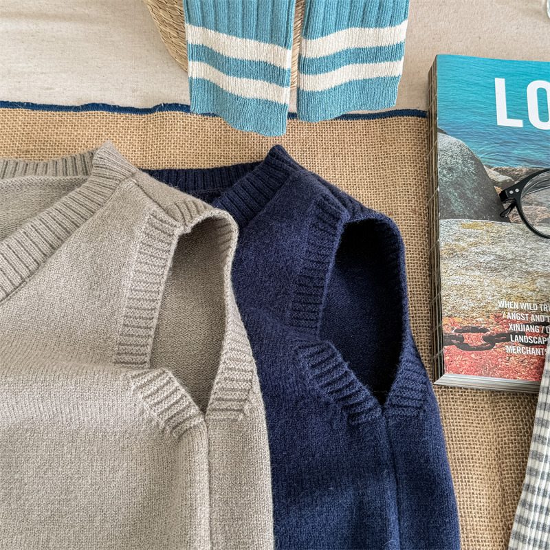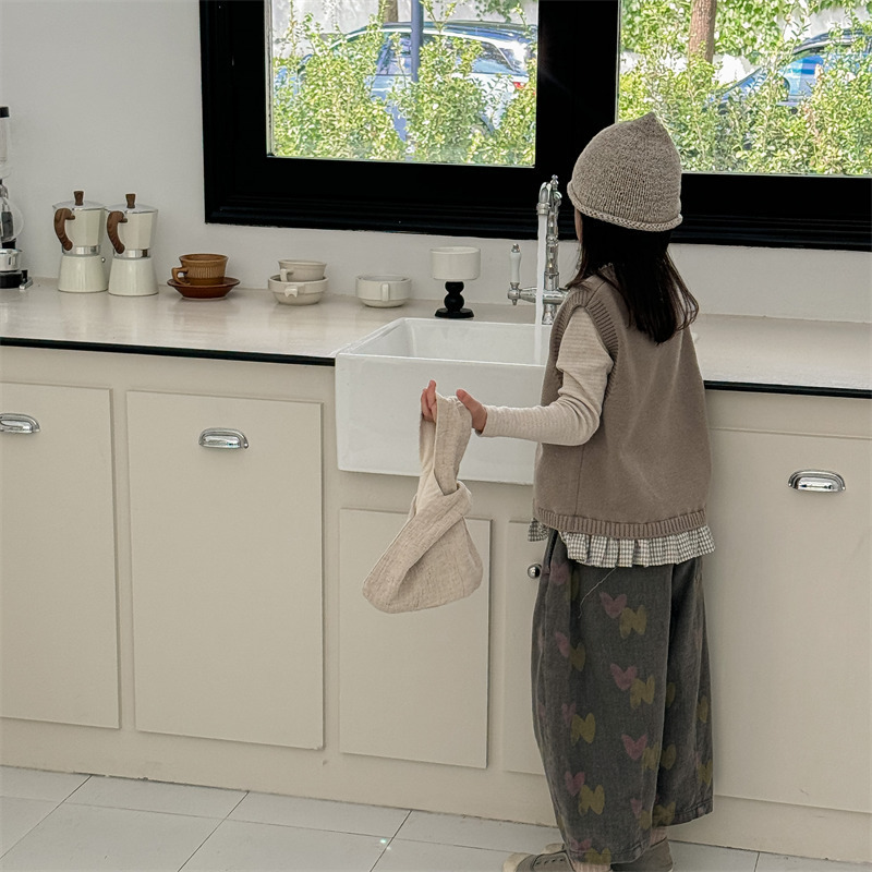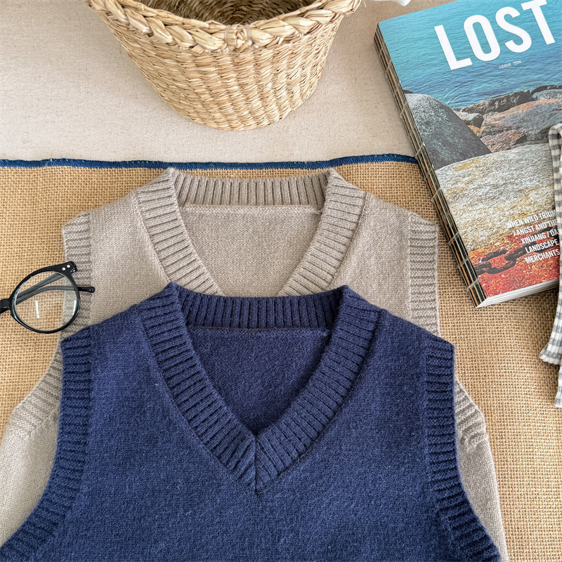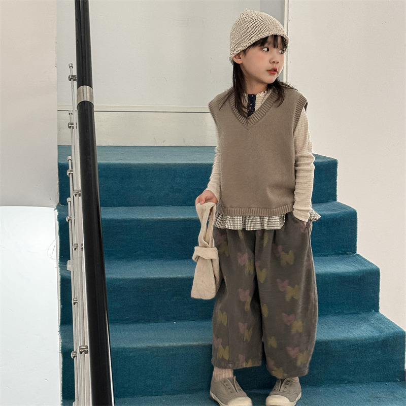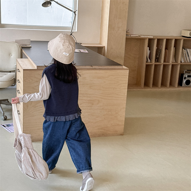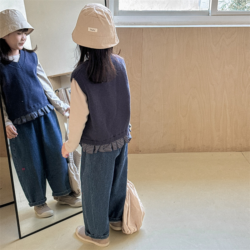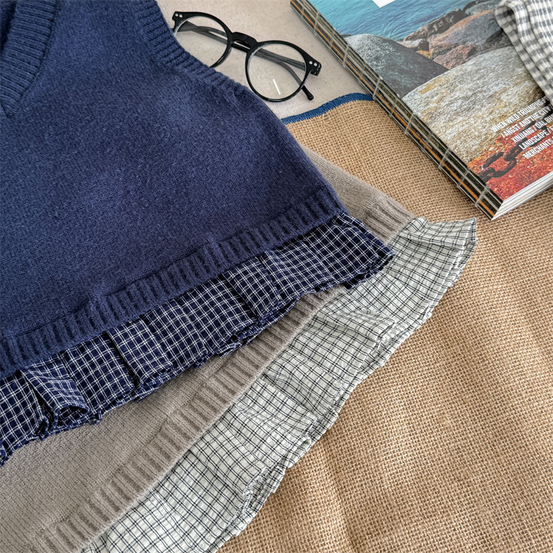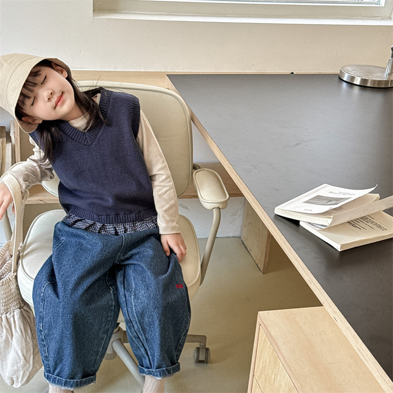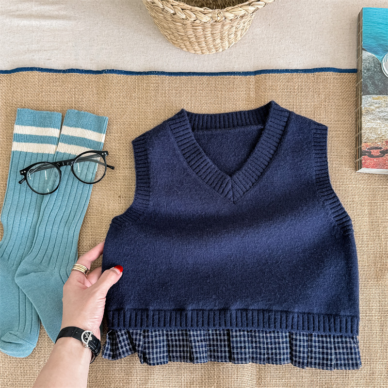 어린이 가을 양모 조끼 소녀 영국 머리 격자 무늬 니트 웨이스트 코트 아카데믹 스타일 풀오버 V-넥 조끼