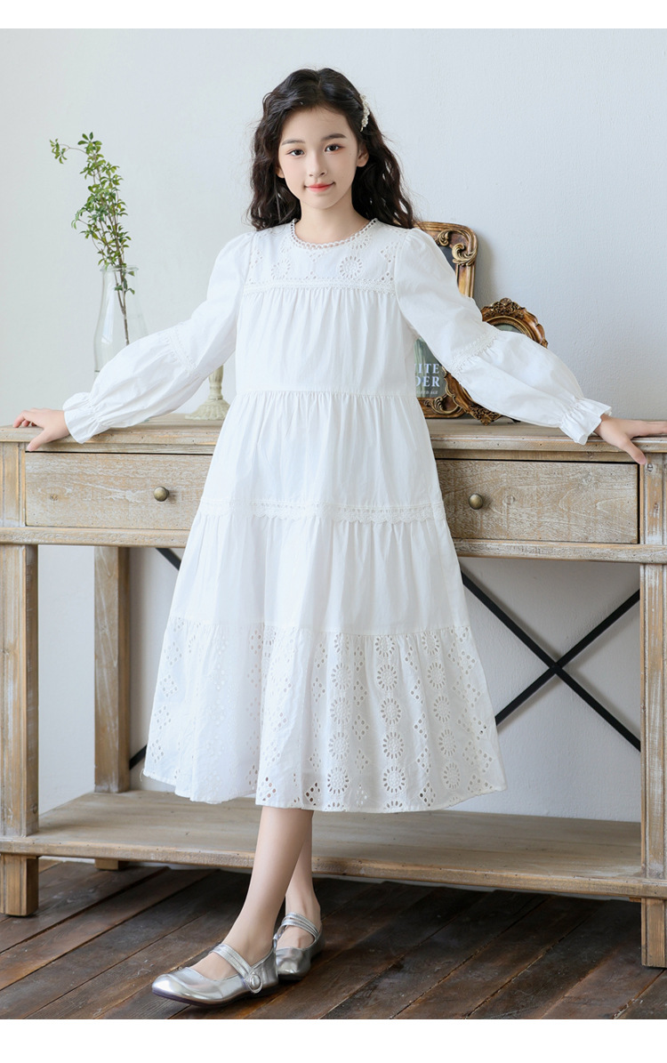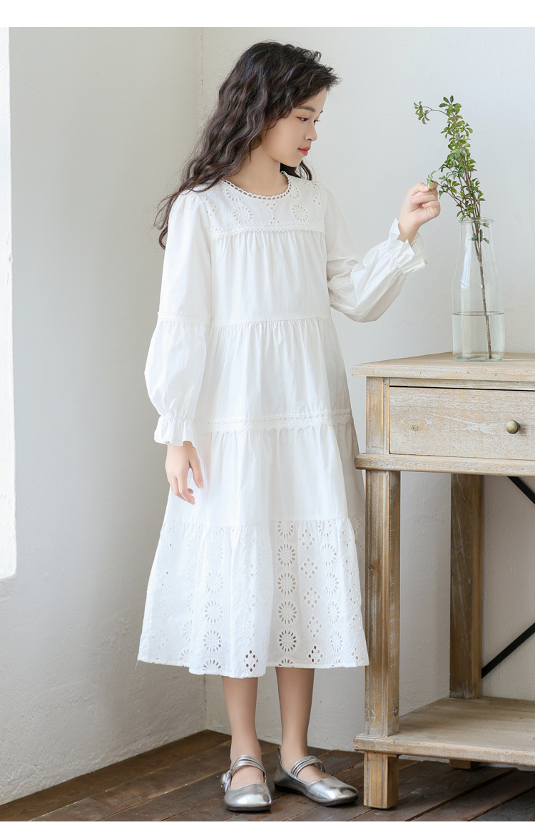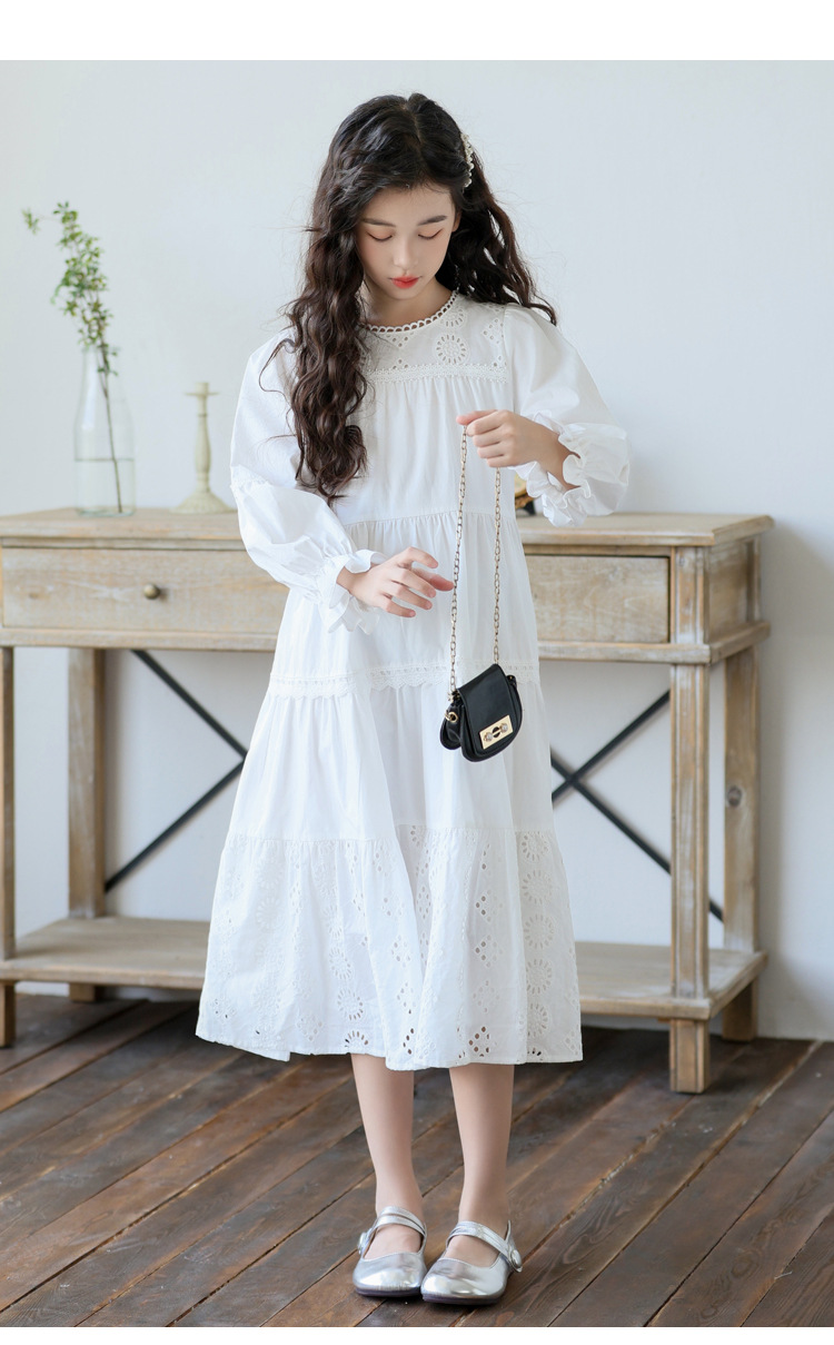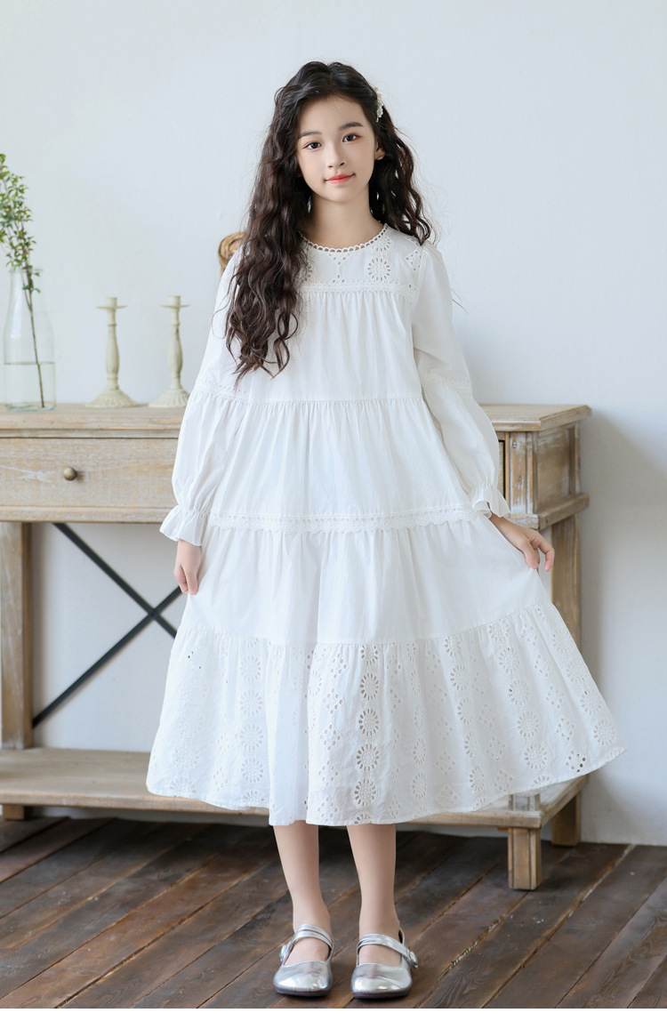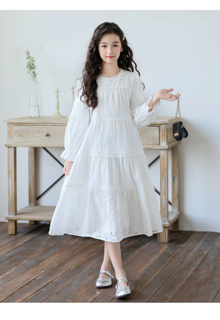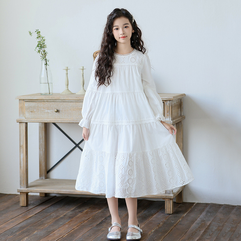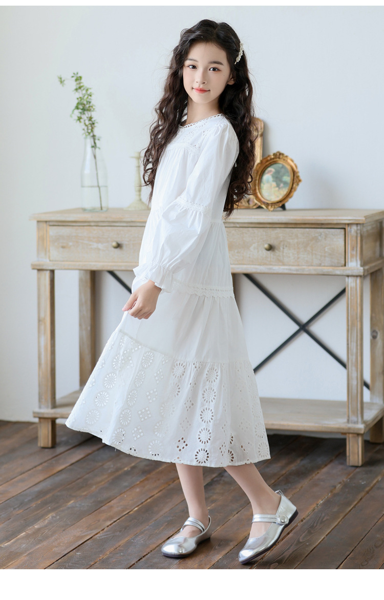 소녀 원피스 가을 긴 소매 레이스 할로우 스커트 2024 새로운 큰 어린이 어린 소녀 공주 스커트