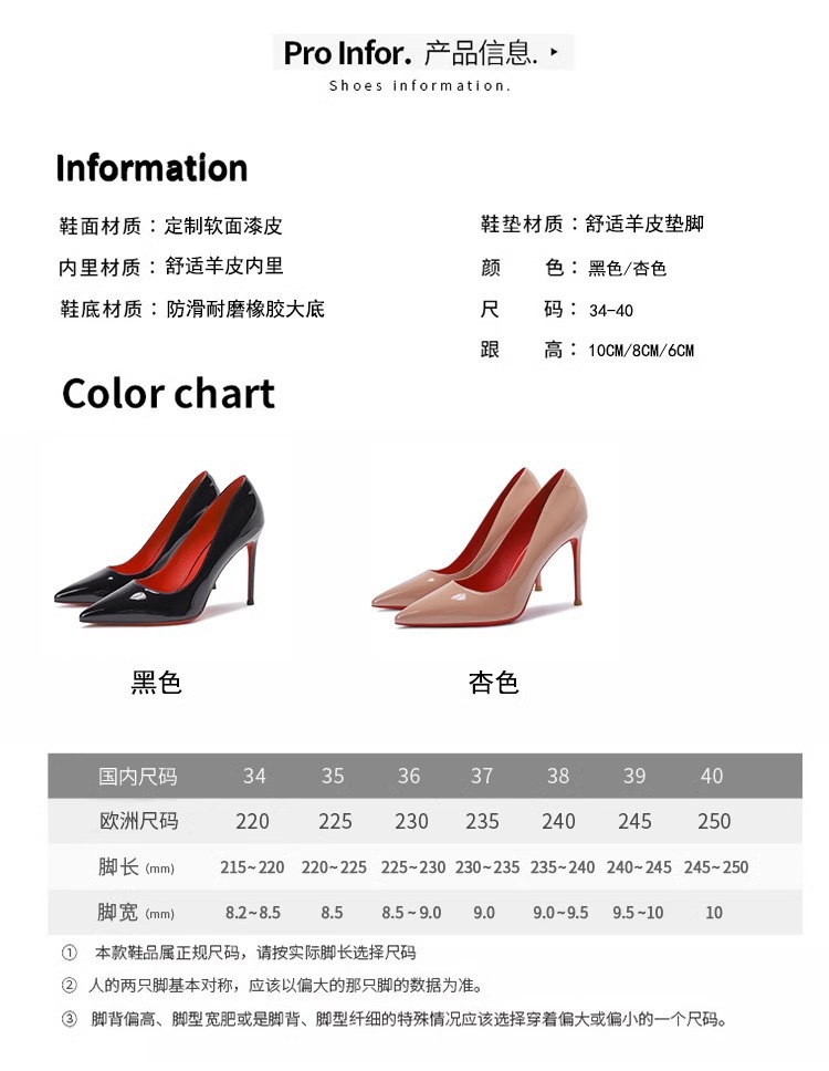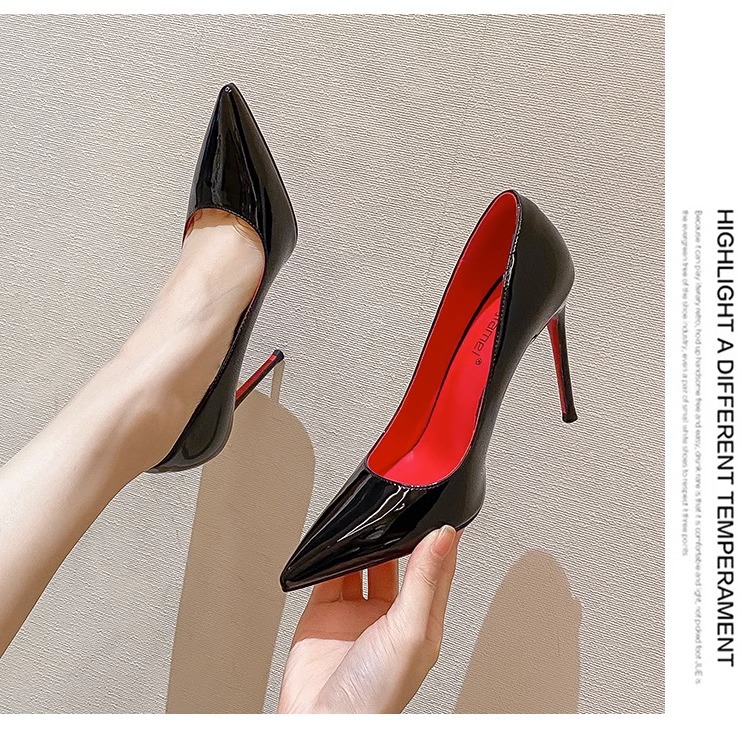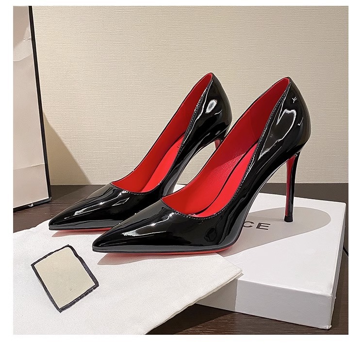 2024 빨간 밑바닥 하이힐 여성의 아름다운 섹시한 스틸레토 힐 블랙 뾰족한 하이 엔드 특허 가죽 프랑스 전문 싱글 레이어 신발스토어 가기