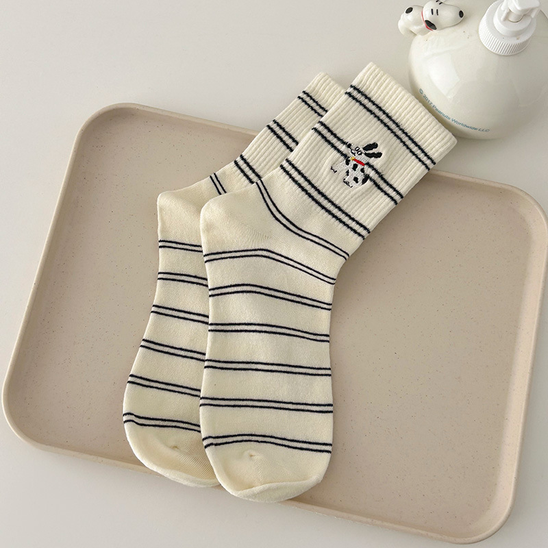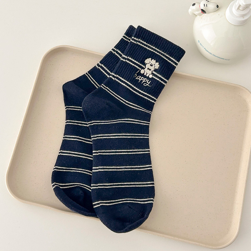 가을 새로운 귀여운 개 자수 유행 양말 치유 스트라이프 미드 양말 Ins 캐주얼 스태킹 양말 여성용 면화 양말