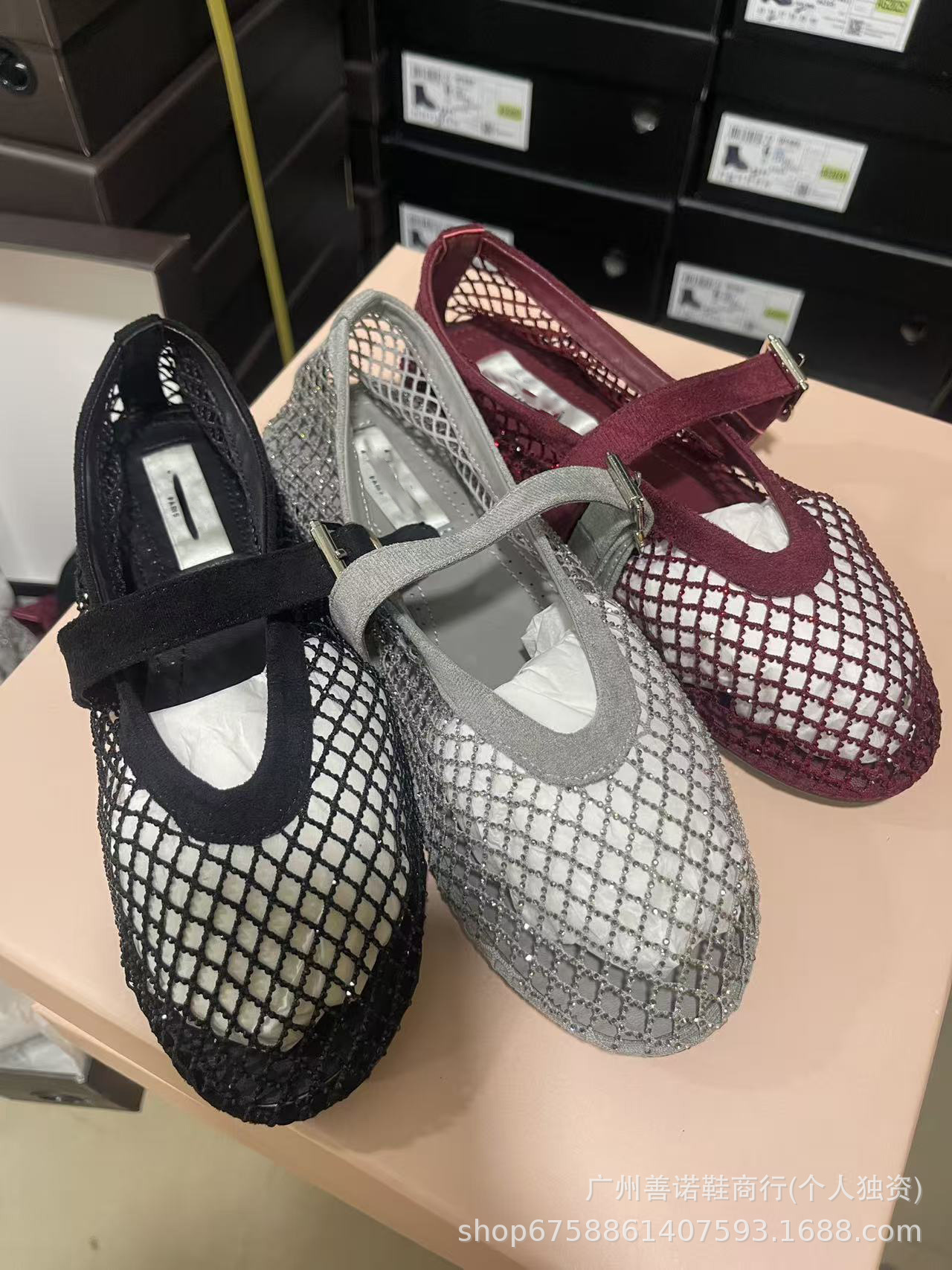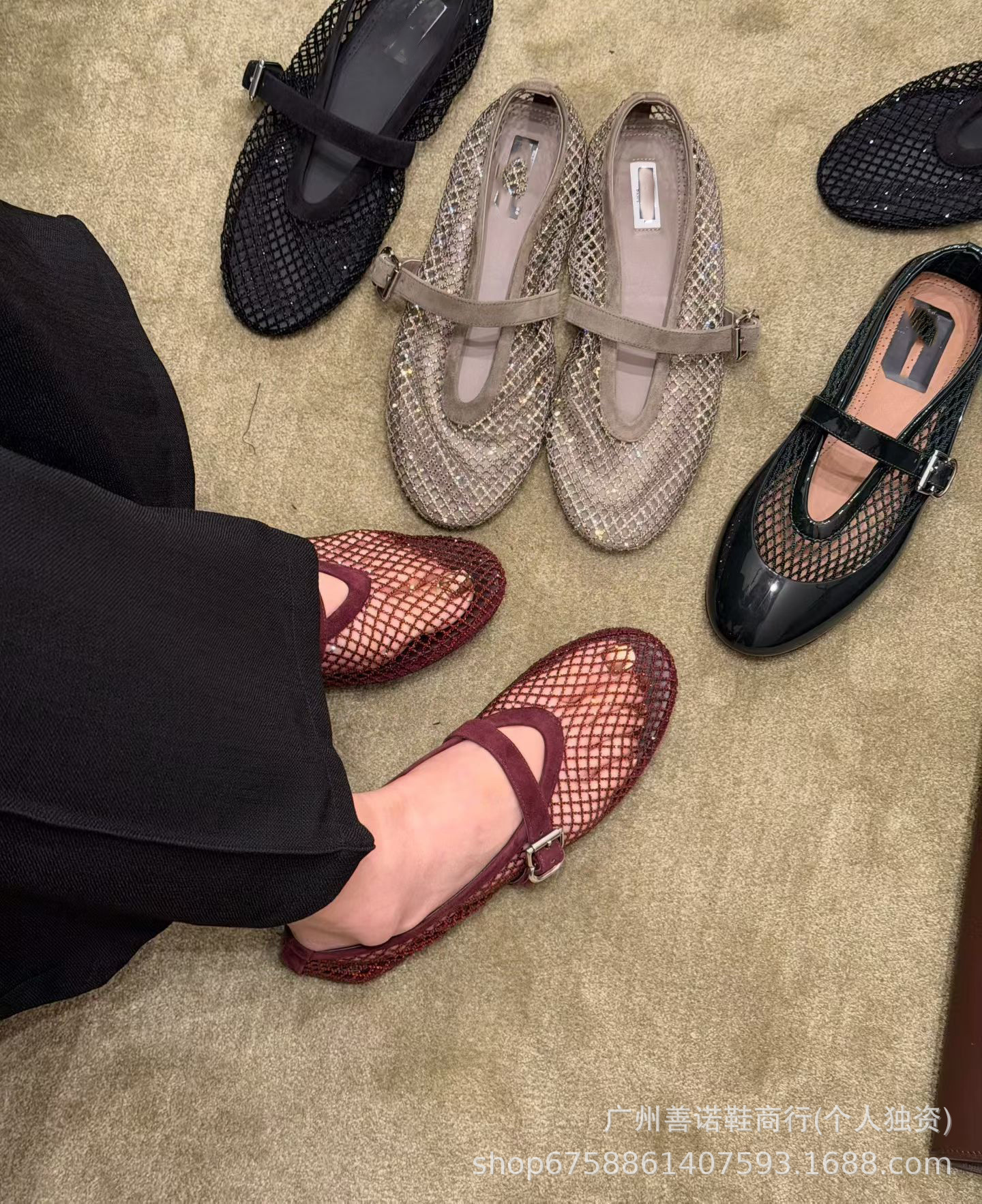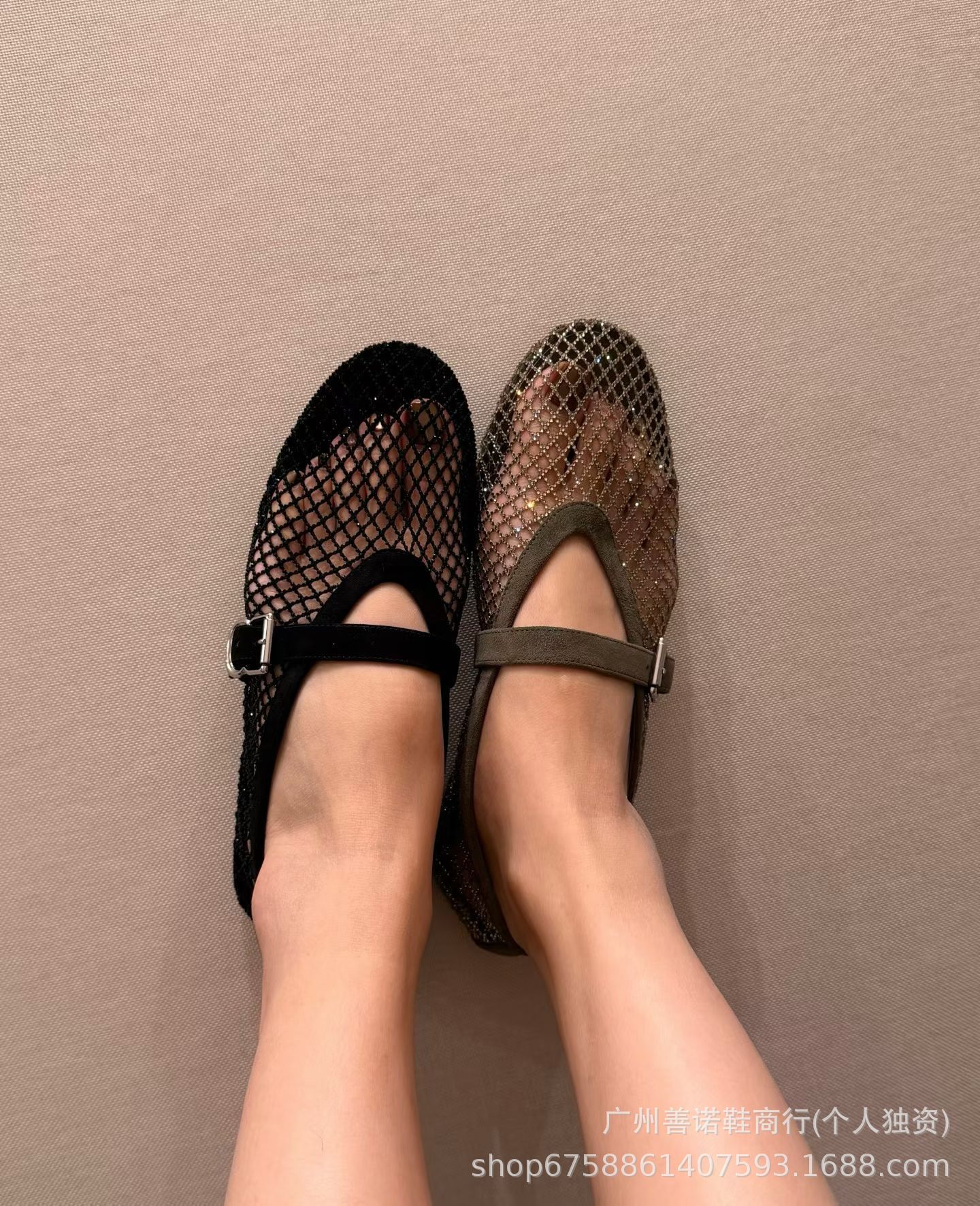 하이 에디션 AIaF 뉴 할로우 풀 라인스톤 낚시 그물 발레 신발 여성 플랫 메쉬 벨트 버클 메리 제인 신발스토어 가기