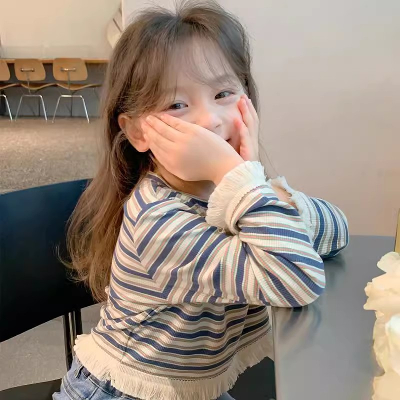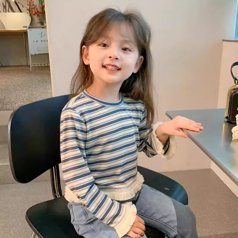 가을 2024 새로운 아동복 스트라이프 긴 소매 아기 소녀 티셔츠 커프 크루 넥 술 디자인 올 매치 걸스 티셔츠스토어 가기
