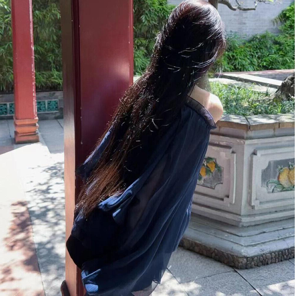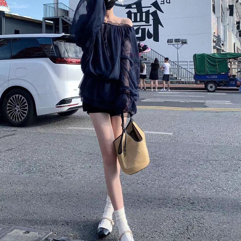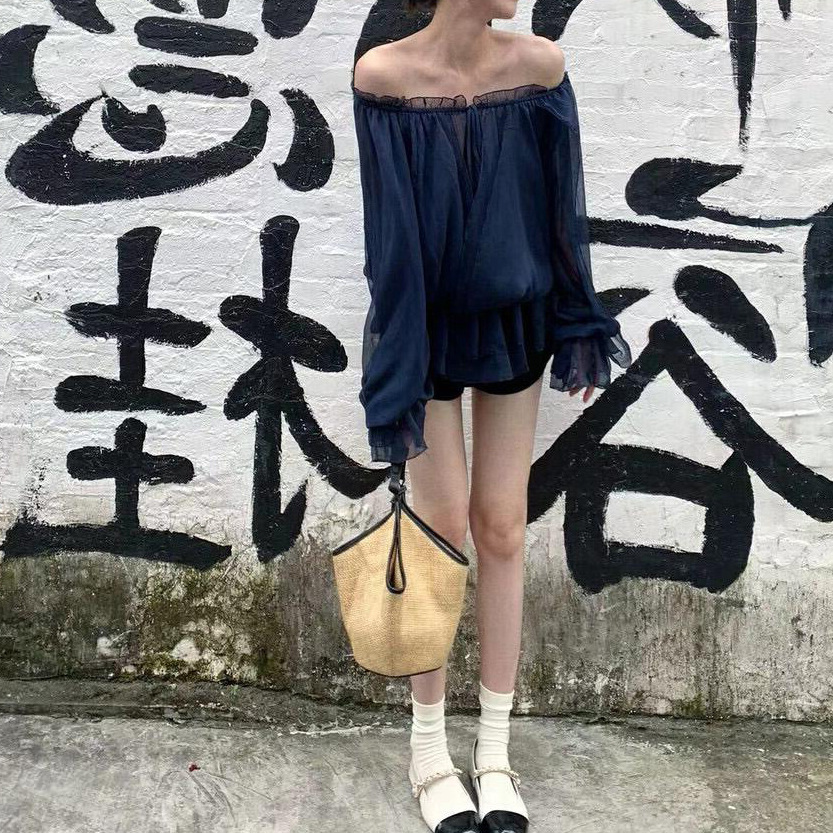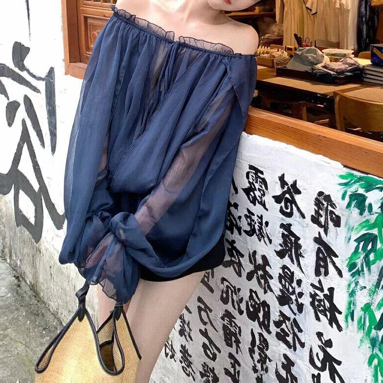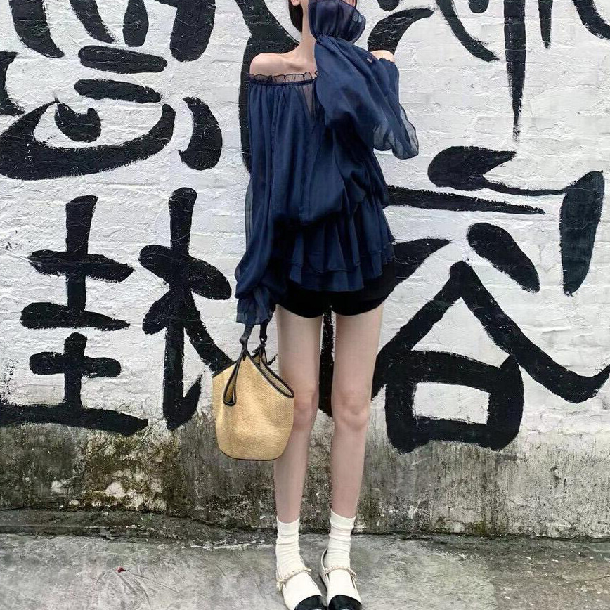 꽃잎 레벨 드로우 스트링 쉬폰 셔츠 여자 여름 오프 숄더 메쉬 탑 티베트어 블루 루즈 슬리밍 중간 길이