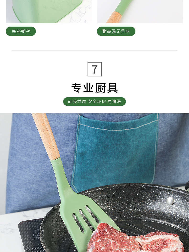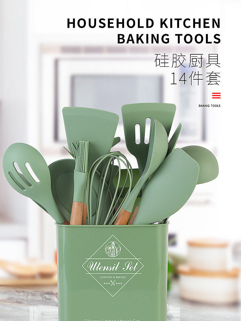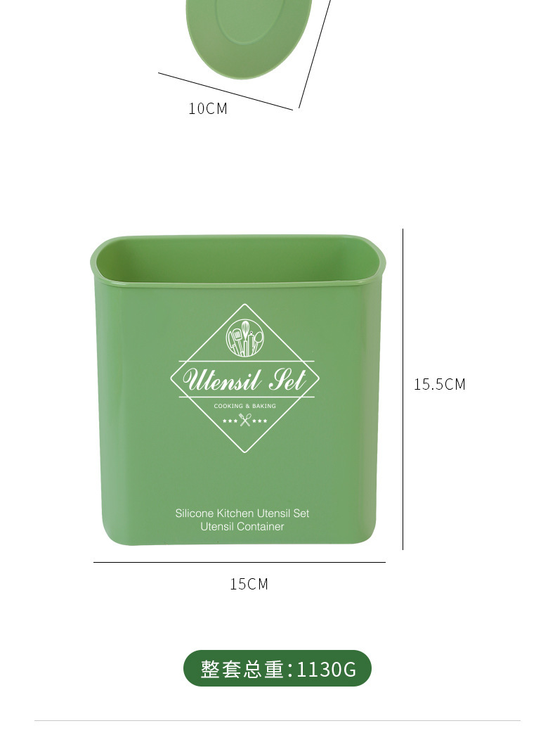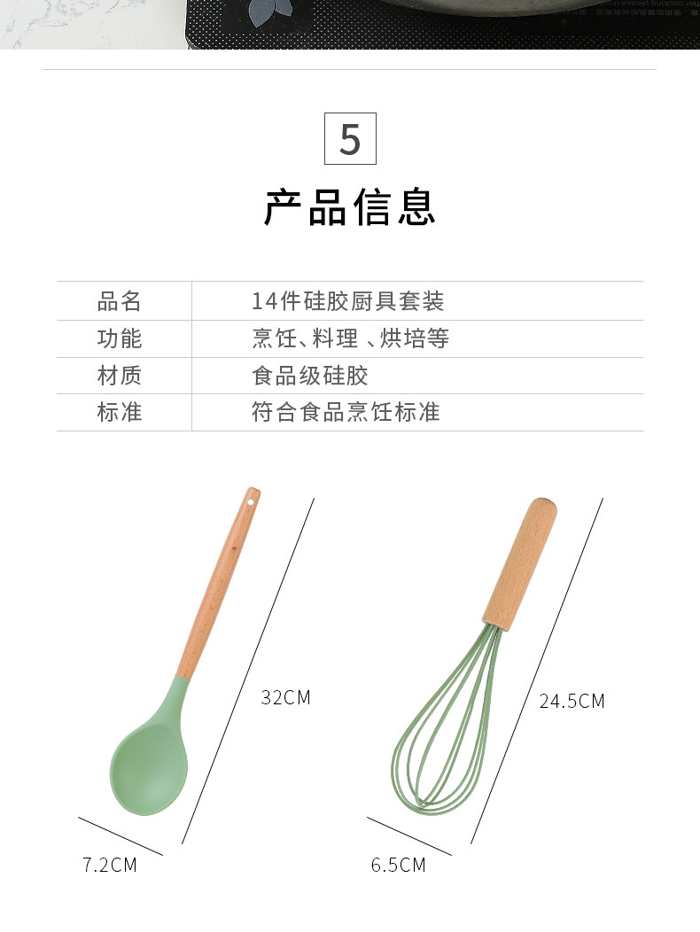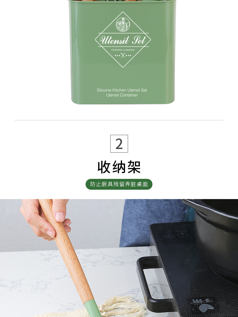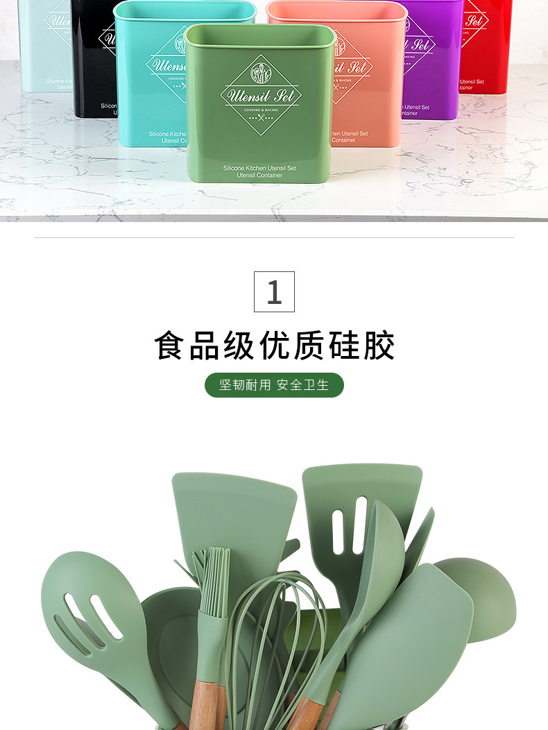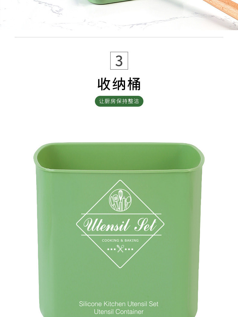 14件套包括:11支木柄硅胶厨具+1个塑料5孔厨具搁置盘+1个方形收纳桶+1个硅胶搁勺垫