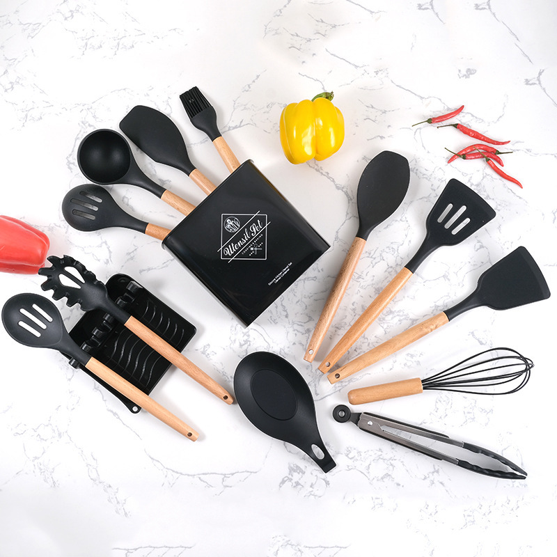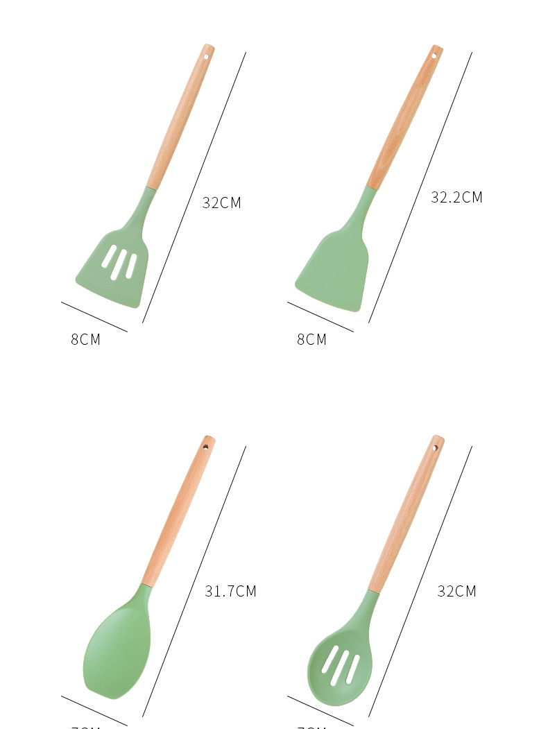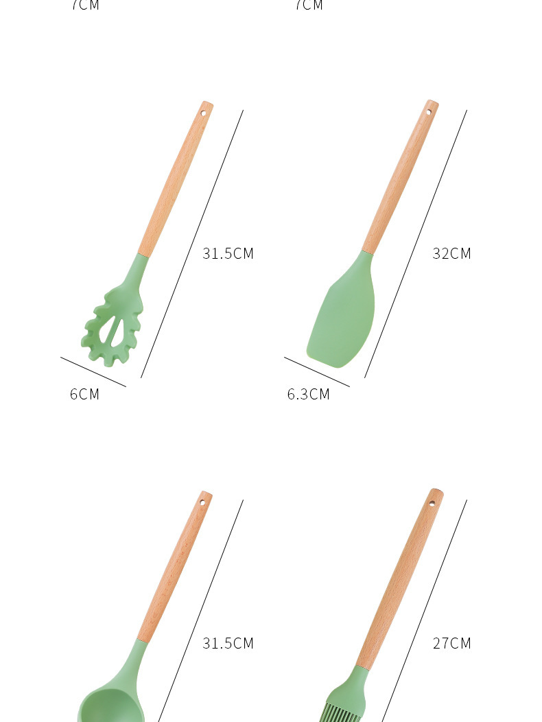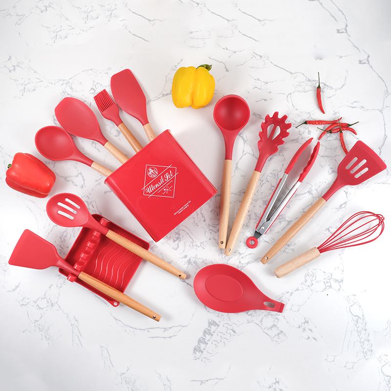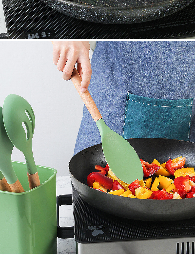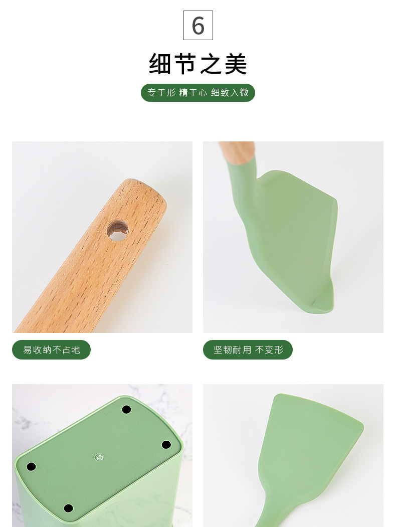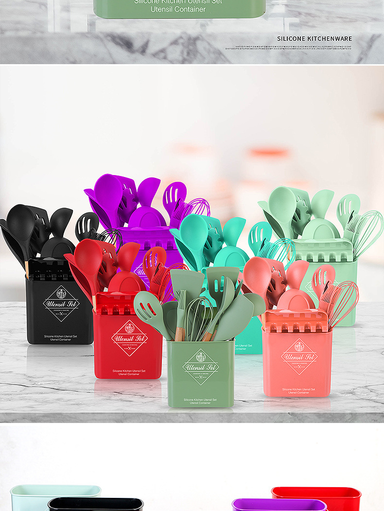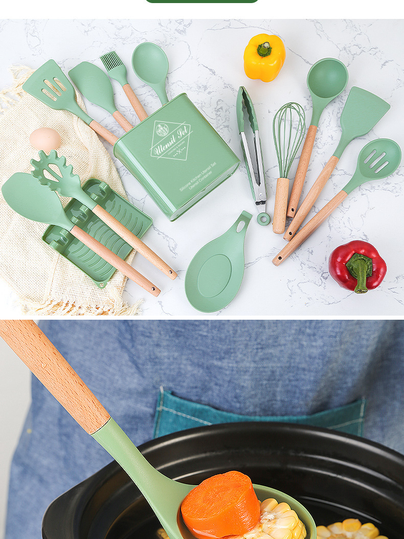 14件套包括:11支木柄硅胶厨具+1个塑料5孔厨具搁置盘+1个方形收纳桶+1个硅胶搁勺垫