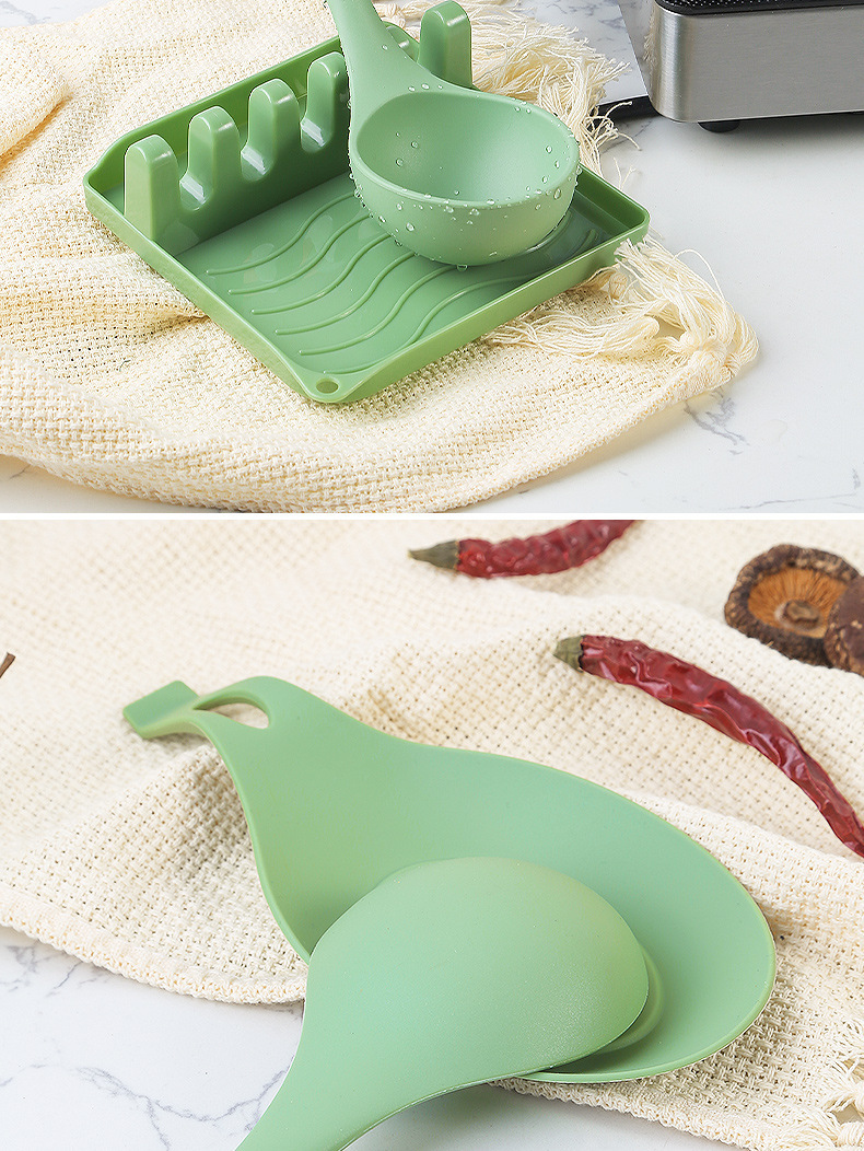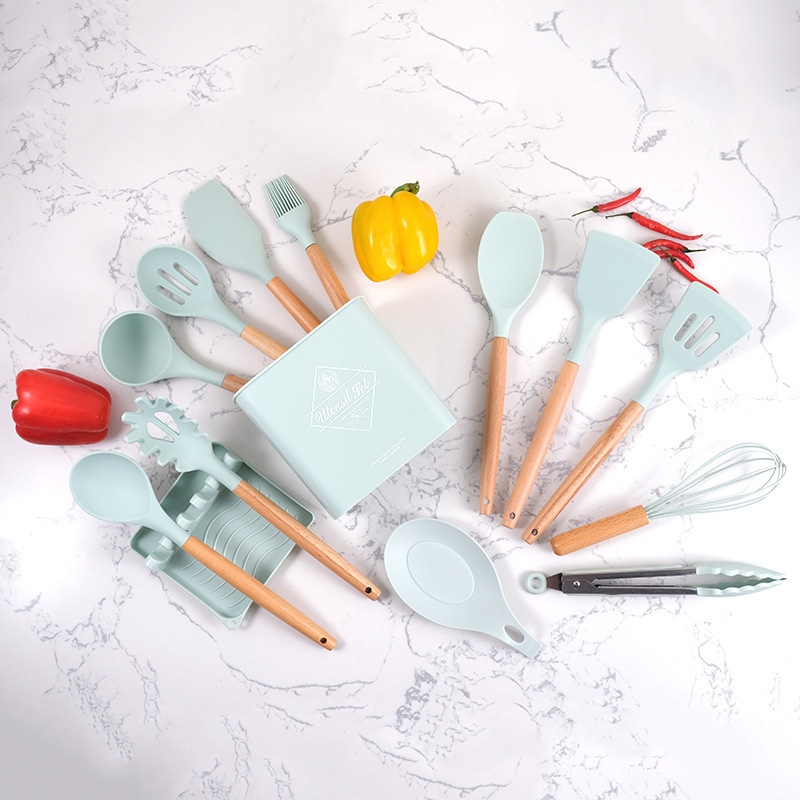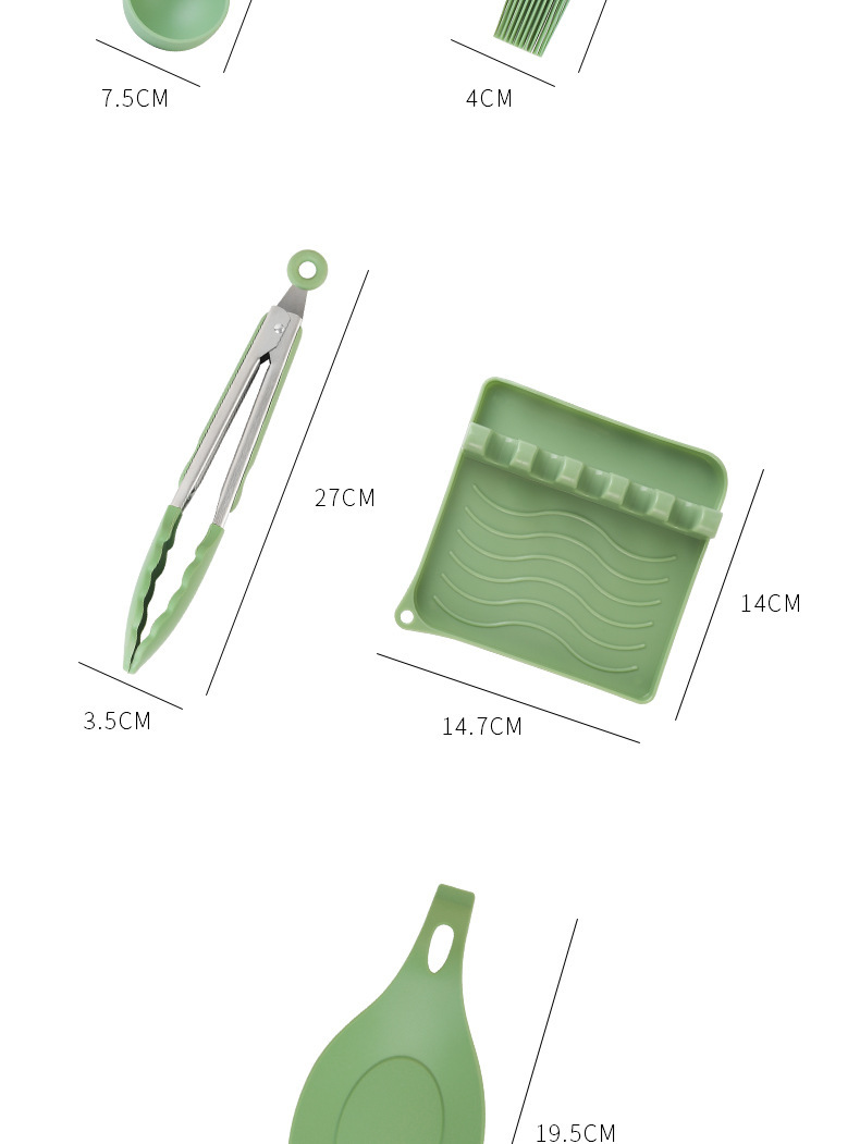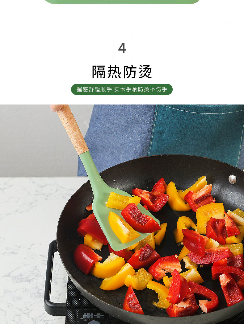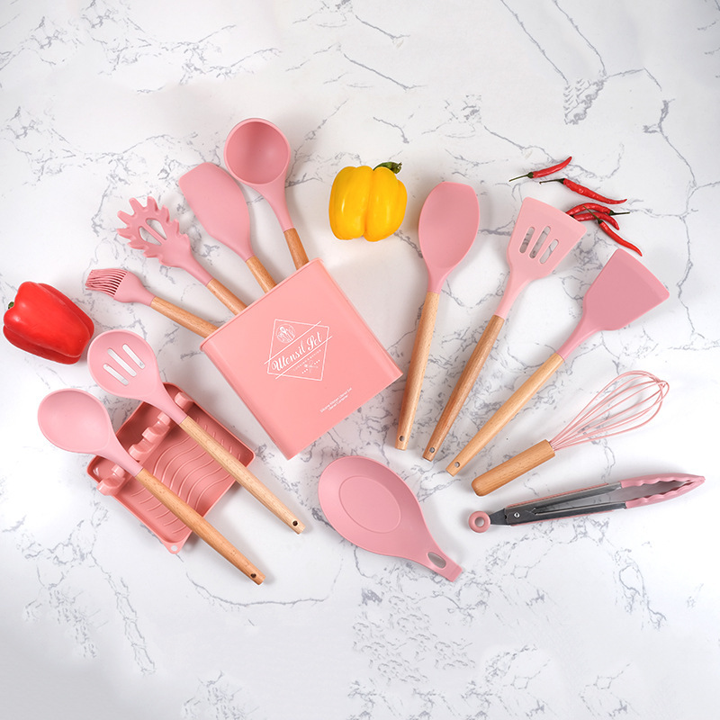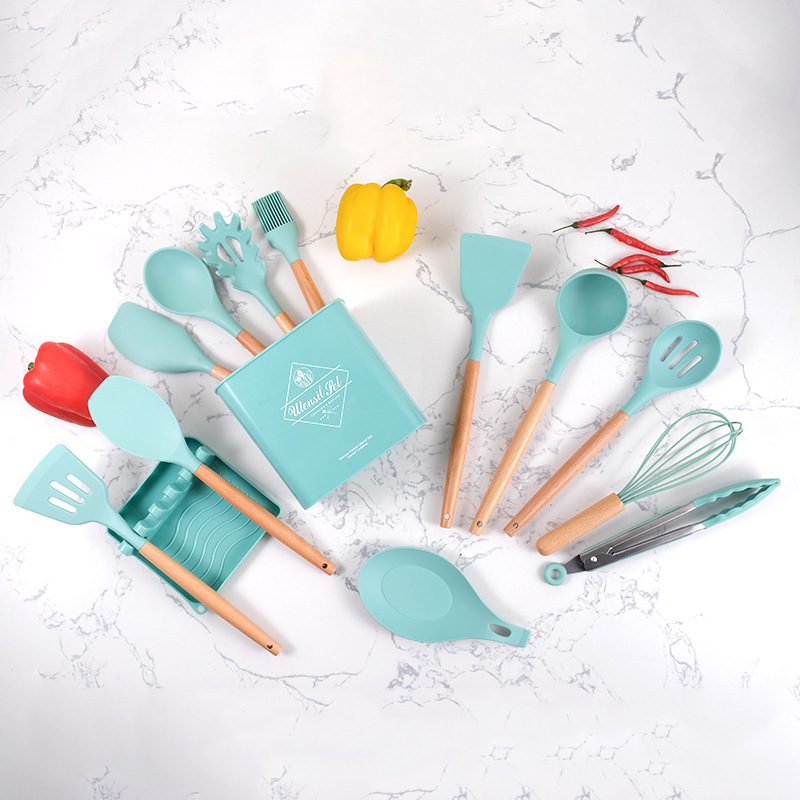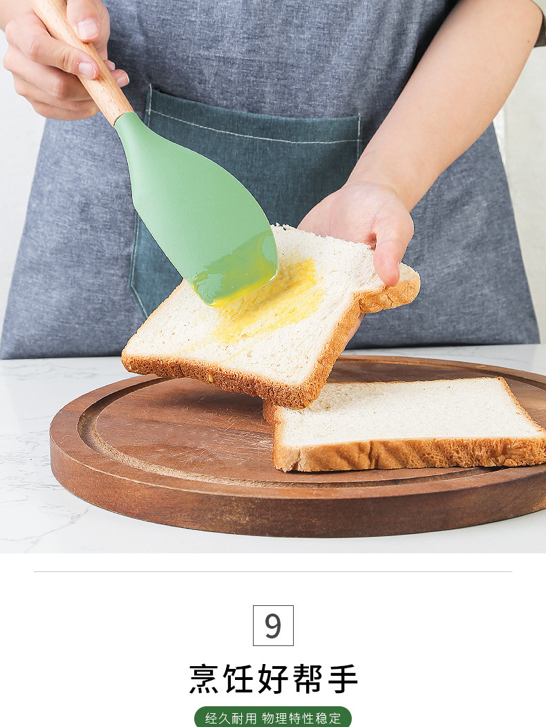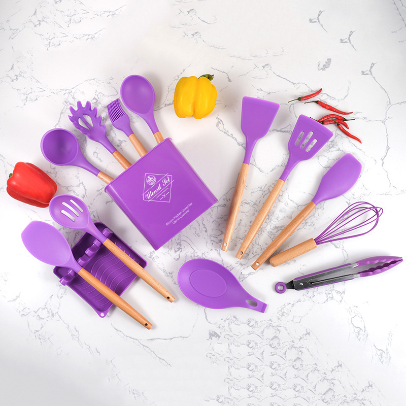 14件套包括:11支木柄硅胶厨具+1个塑料5孔厨具搁置盘+1个方形收纳桶+1个硅胶搁勺垫