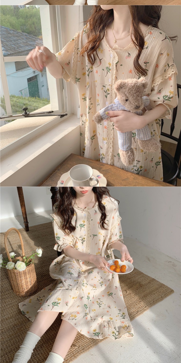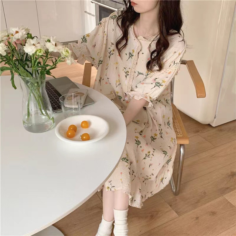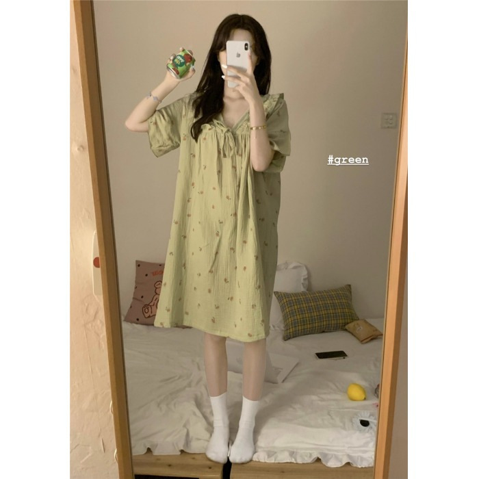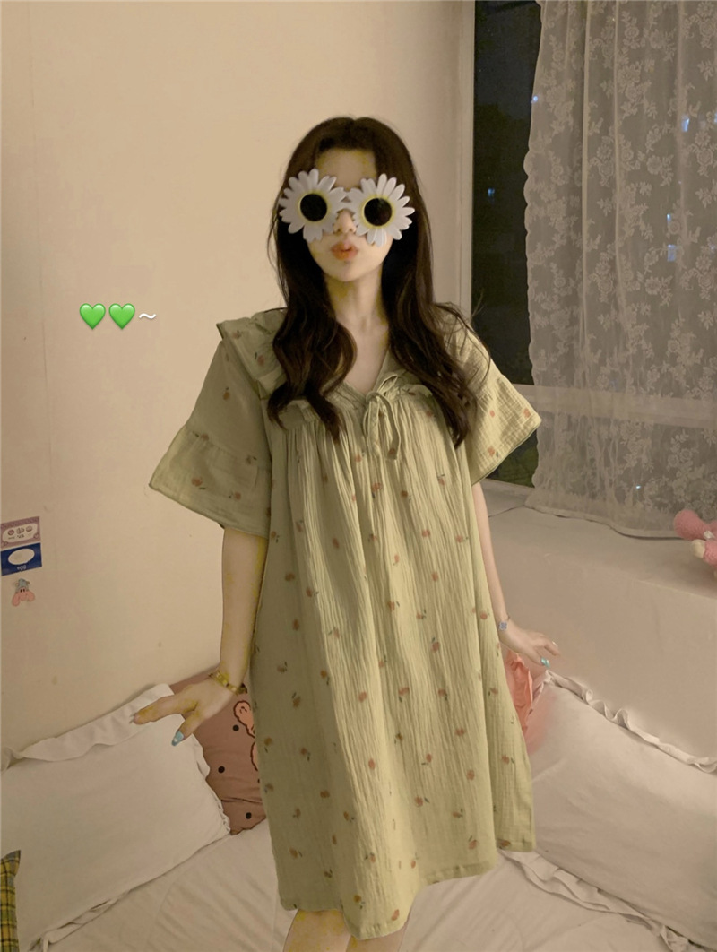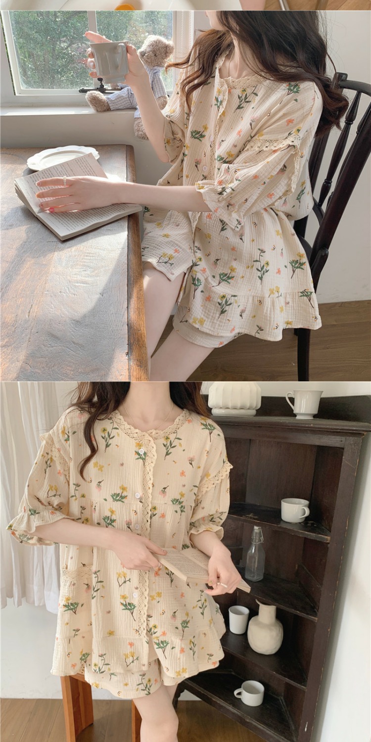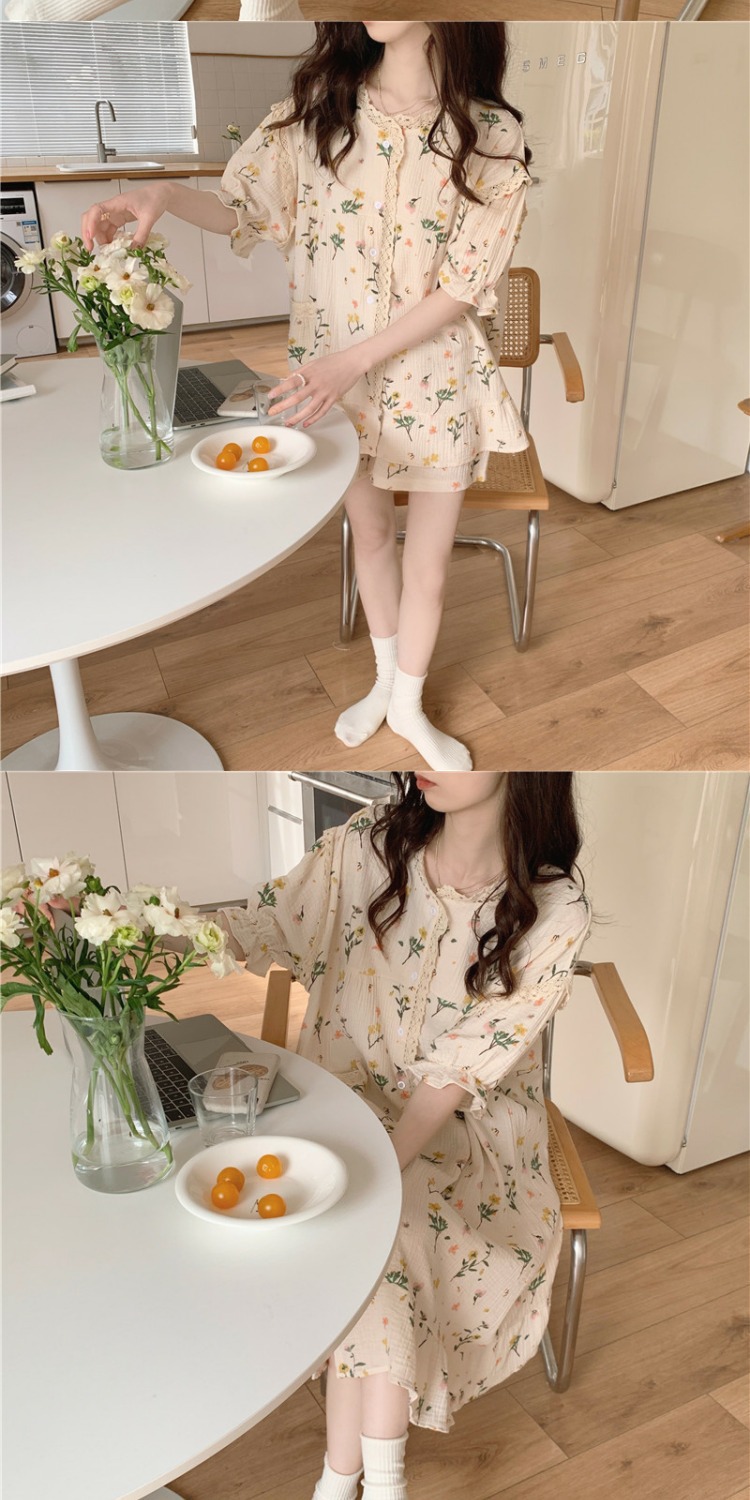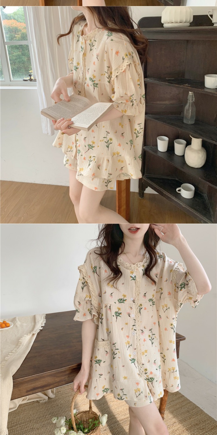 Ins Korean Style Princess Style 여름 잠옷 여성 반팔 작은 꽃 크루 넥 달콤한 소녀 학생 느슨한 홈 옷