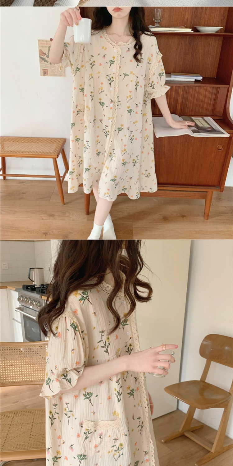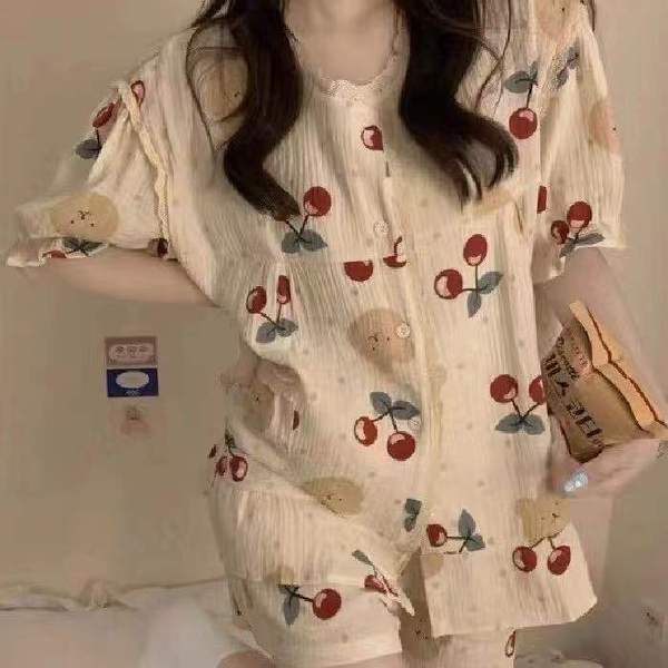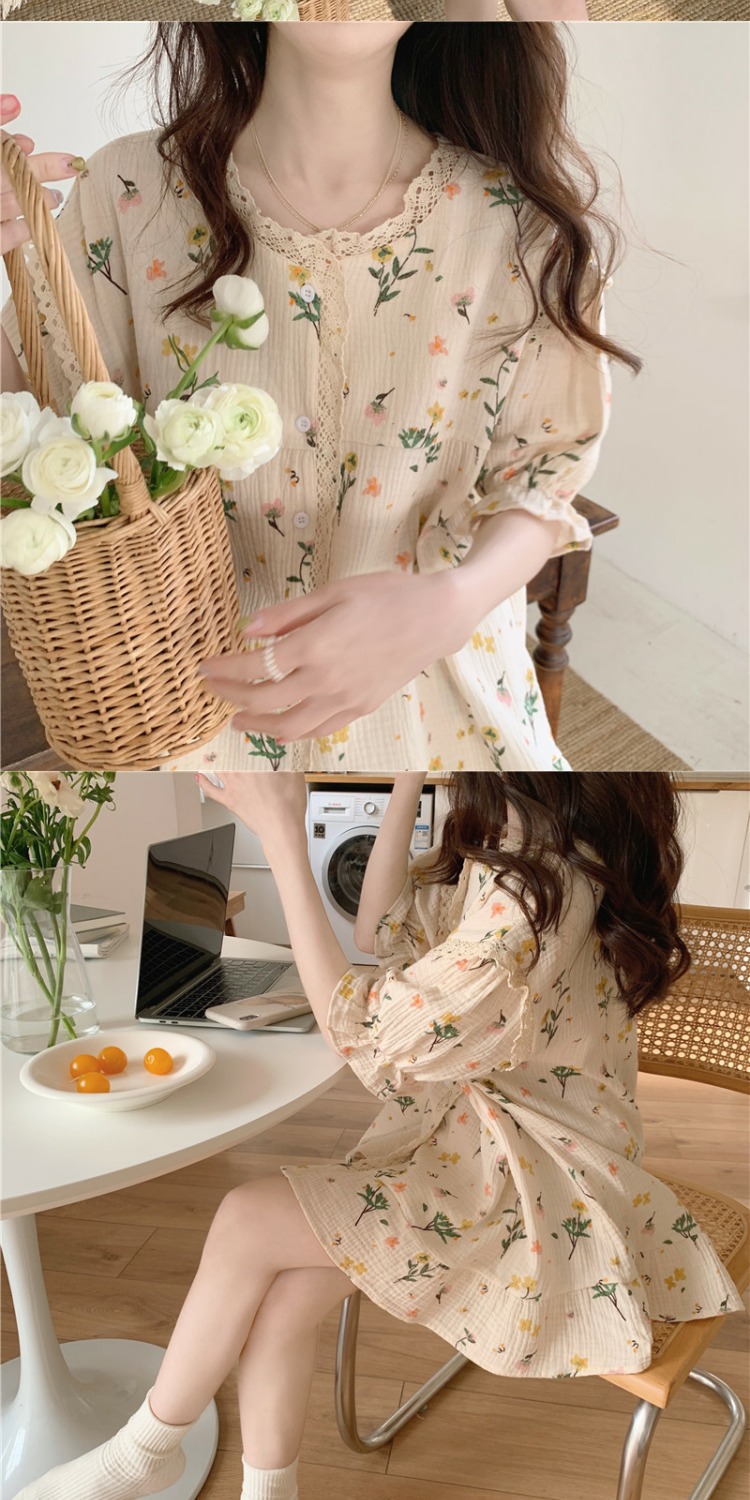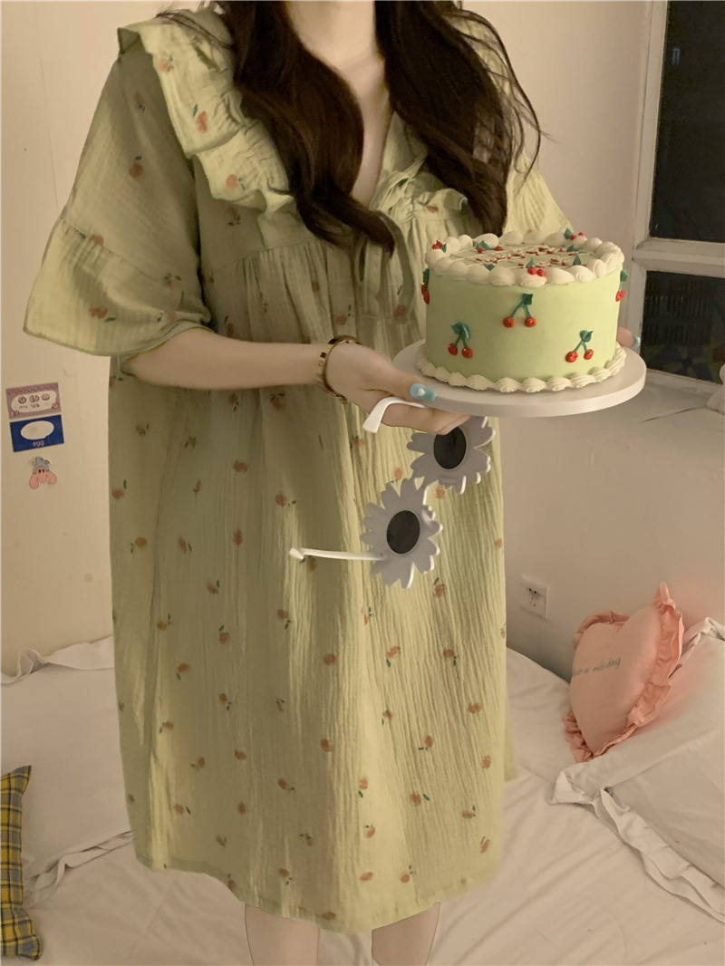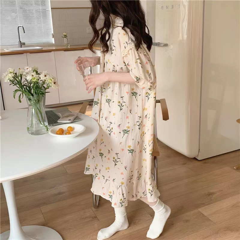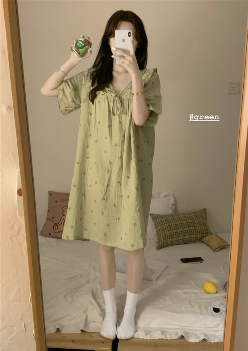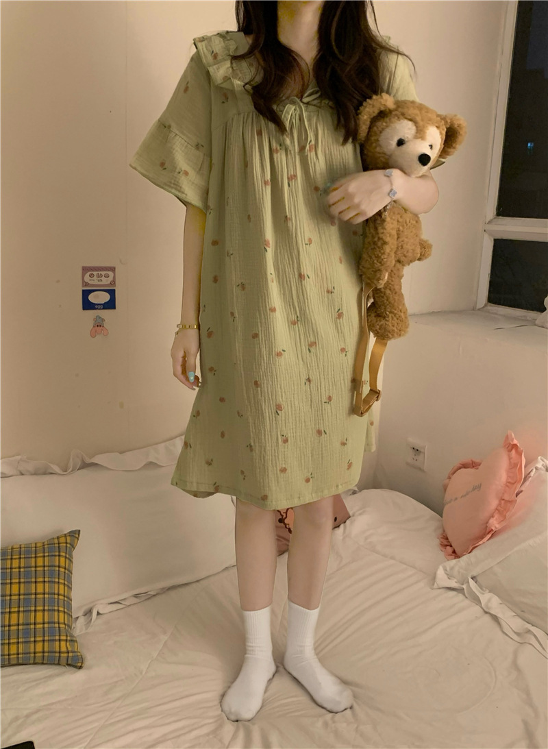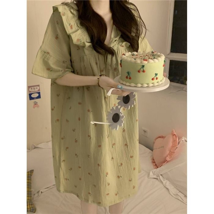 Ins Korean Style Princess Style 여름 잠옷 여성 반팔 작은 꽃 크루 넥 달콤한 소녀 학생 느슨한 홈 옷