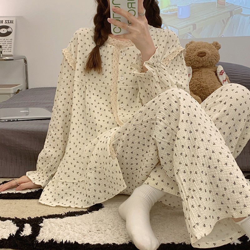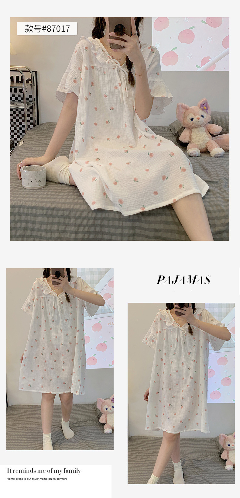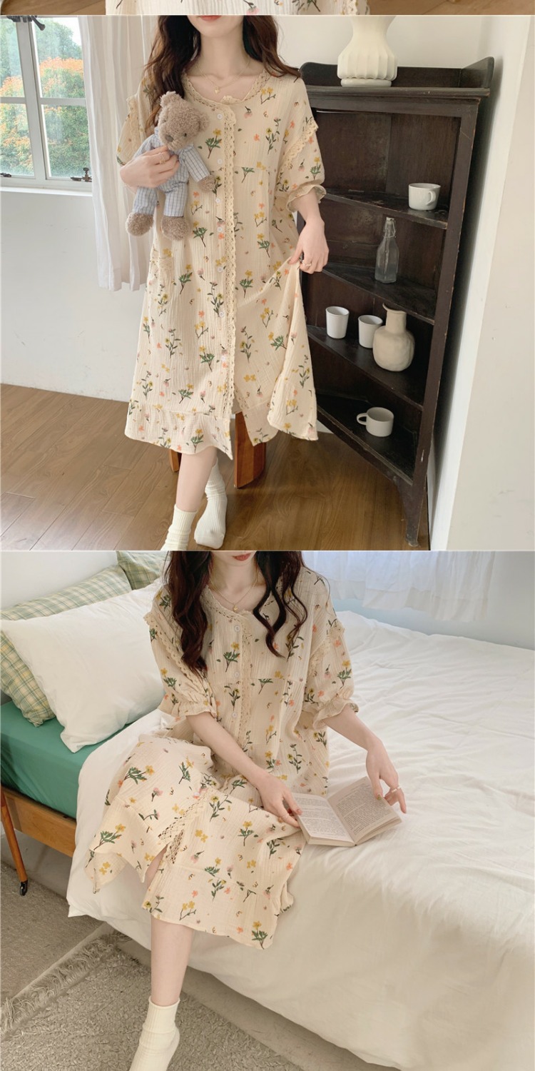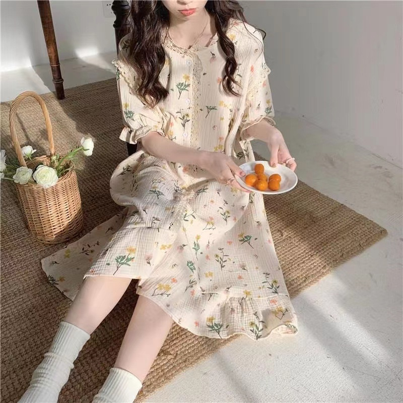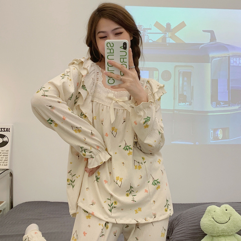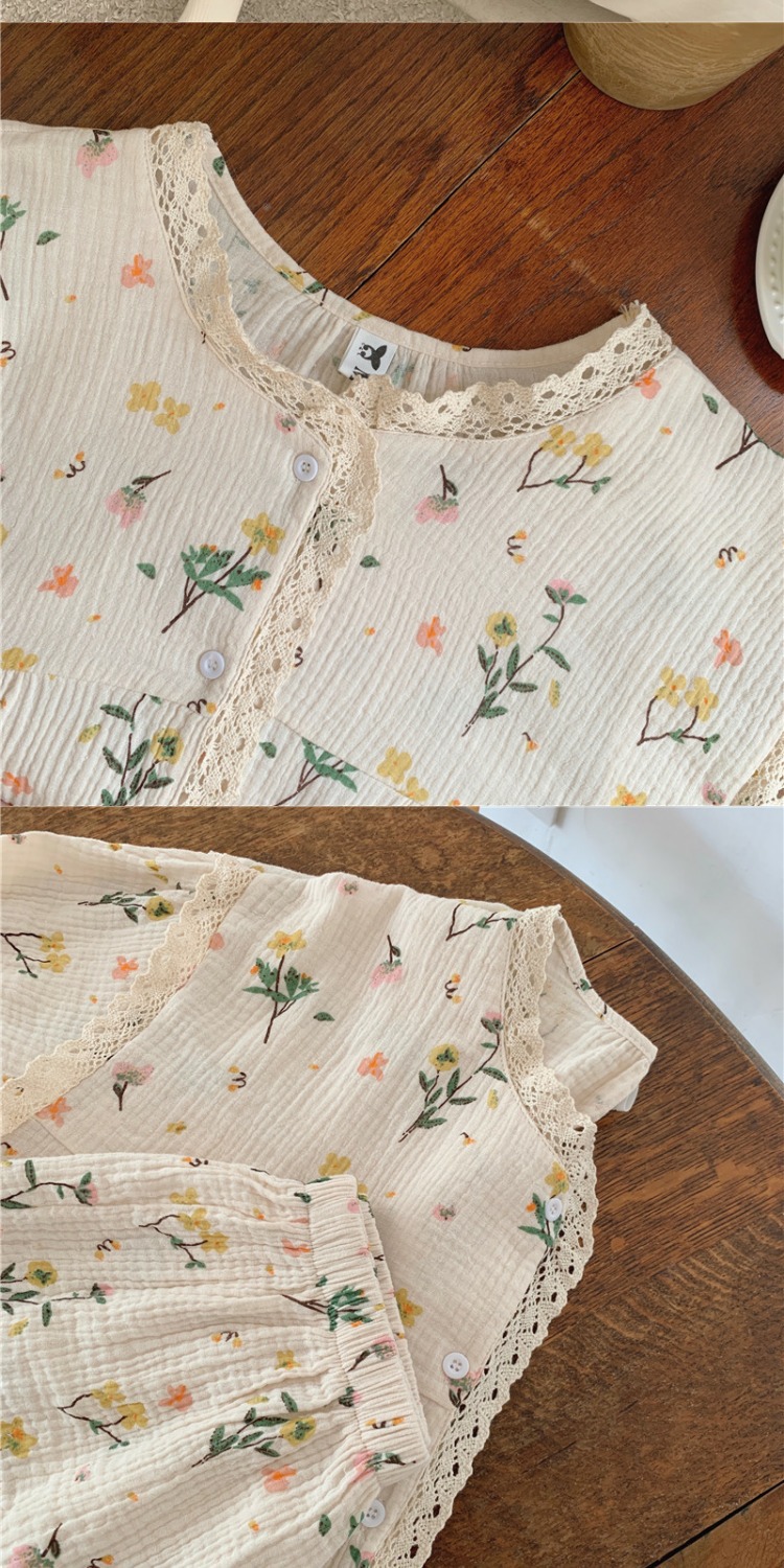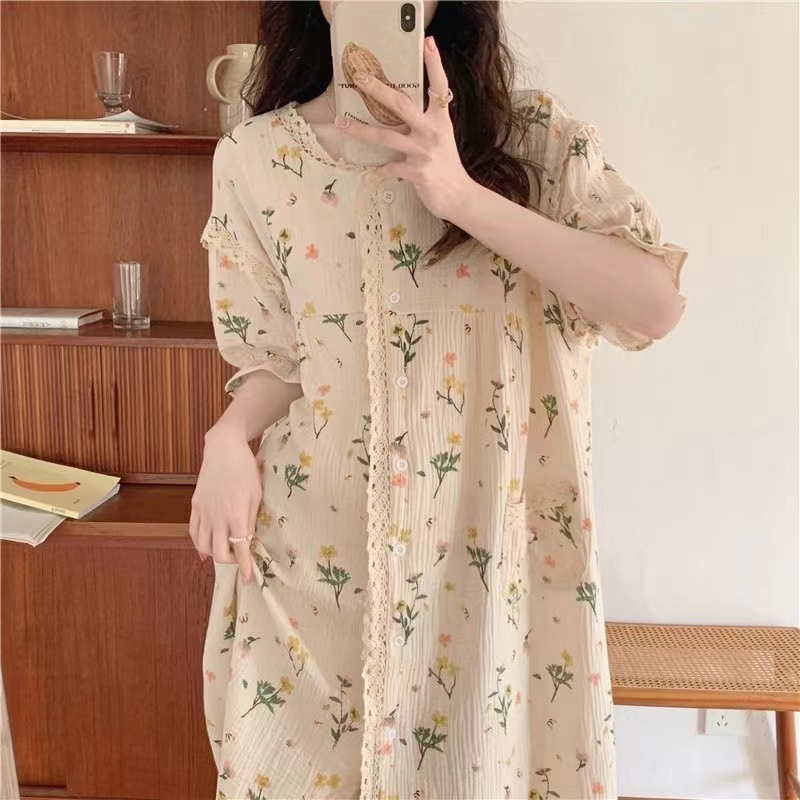 Ins Korean Style Princess Style 여름 잠옷 여성 반팔 작은 꽃 크루 넥 달콤한 소녀 학생 느슨한 홈 옷