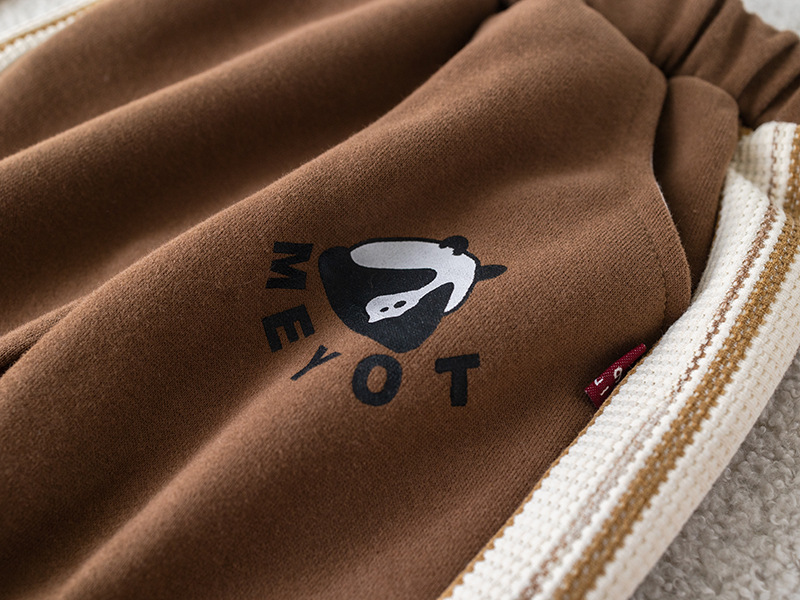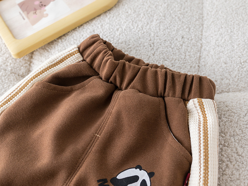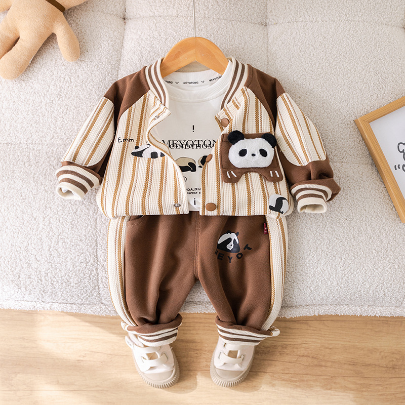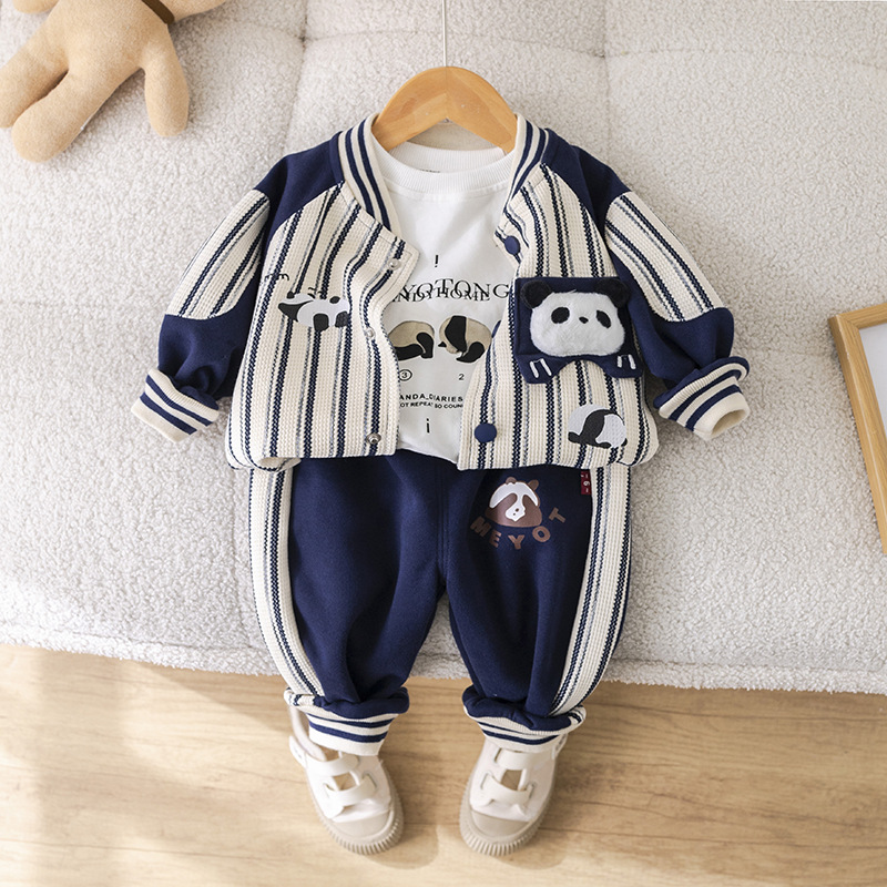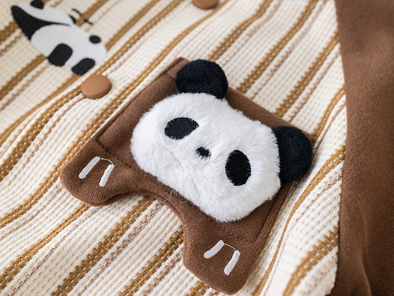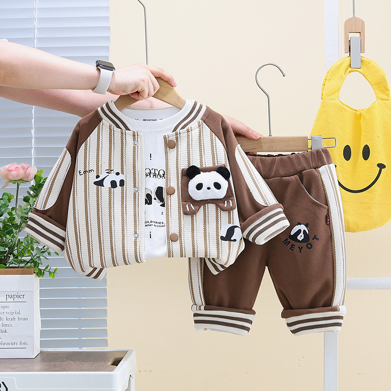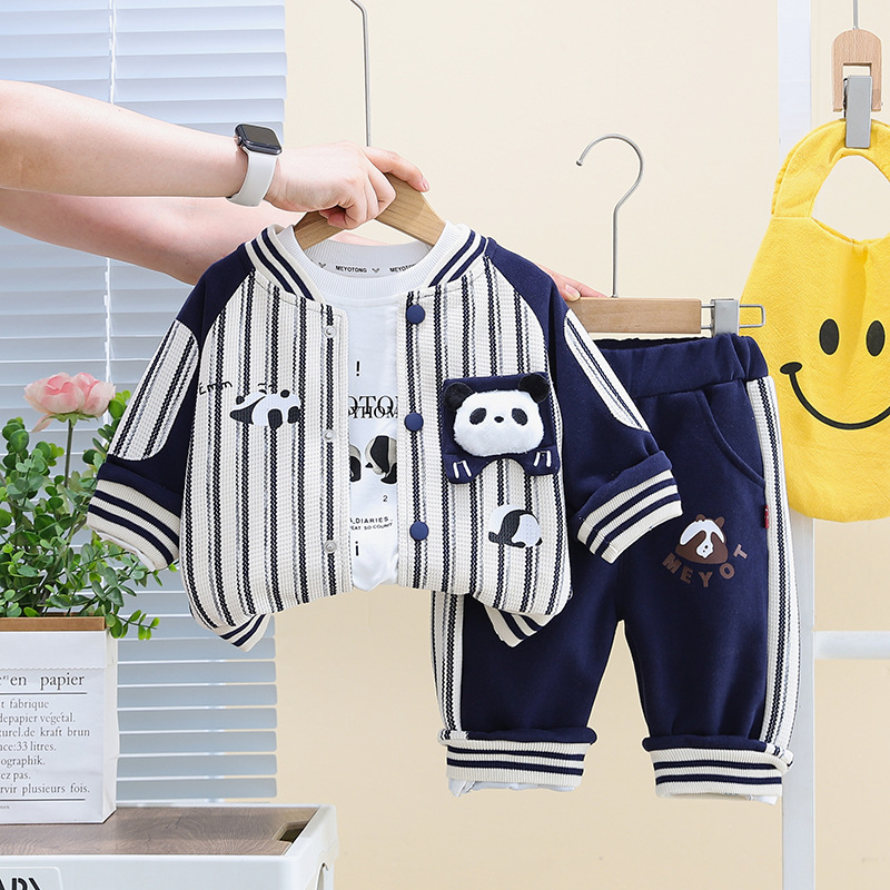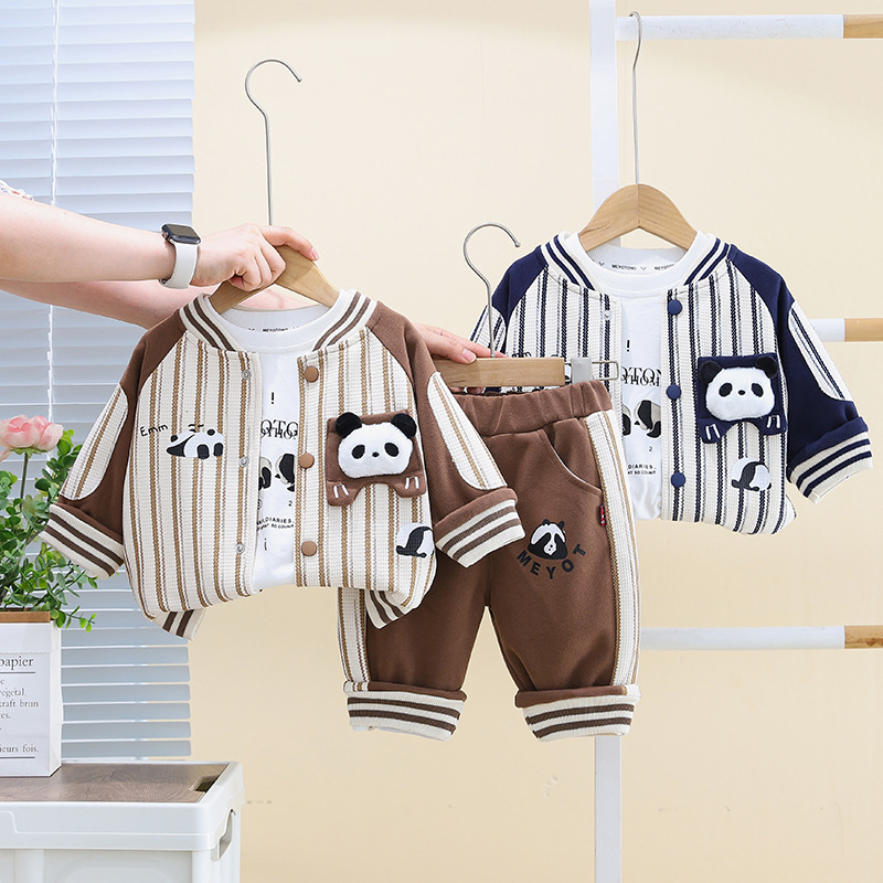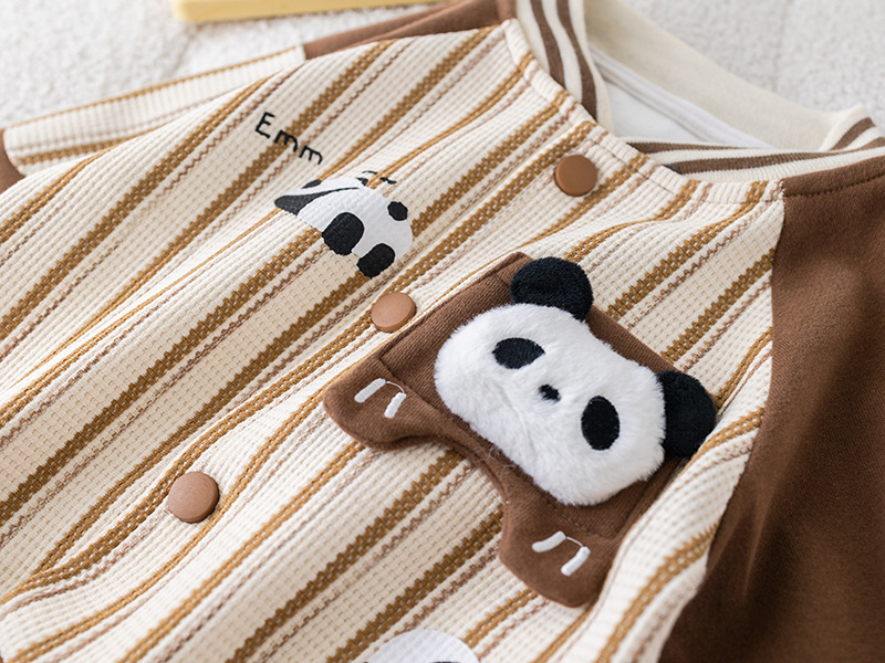 五小七 아동복 2025 봄 가을 신상 0-4세 남아용 세로 줄무늬 팬더 야구복 긴 티셔츠 바지 세트