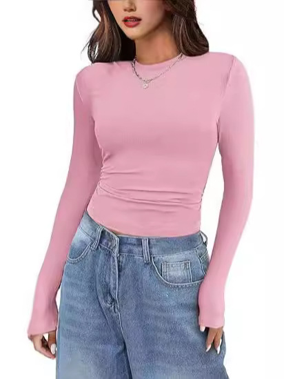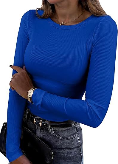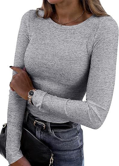 가을 2024 새로운 유럽과 미국의 아마존 패션 여성의 긴 소매 스트레치 라운드 넥 리브 슬림 티셔츠 탑스토어 가기