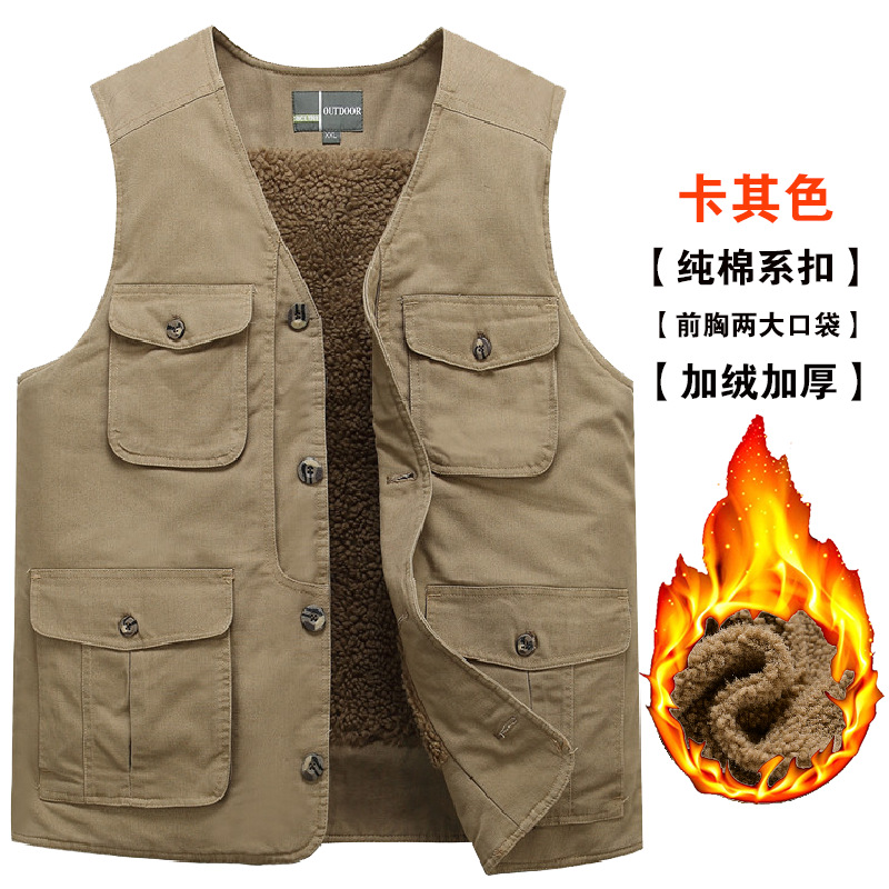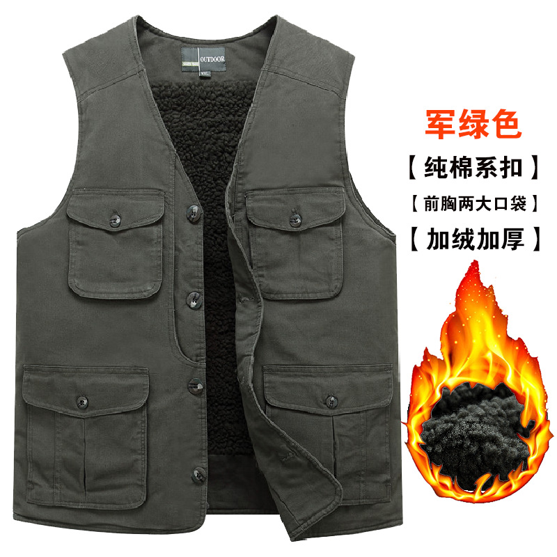 중년 및 노인을위한 가을과 겨울 기모 두꺼운 면화 조끼 남자 순면 단추 조끼와 어깨 멀티 포켓 플러스 사이즈 아빠